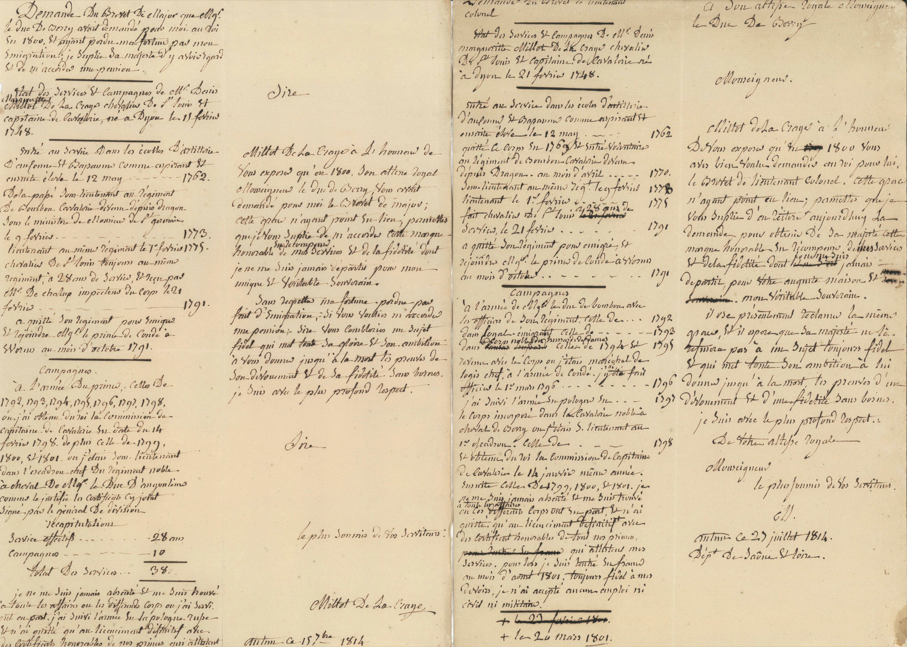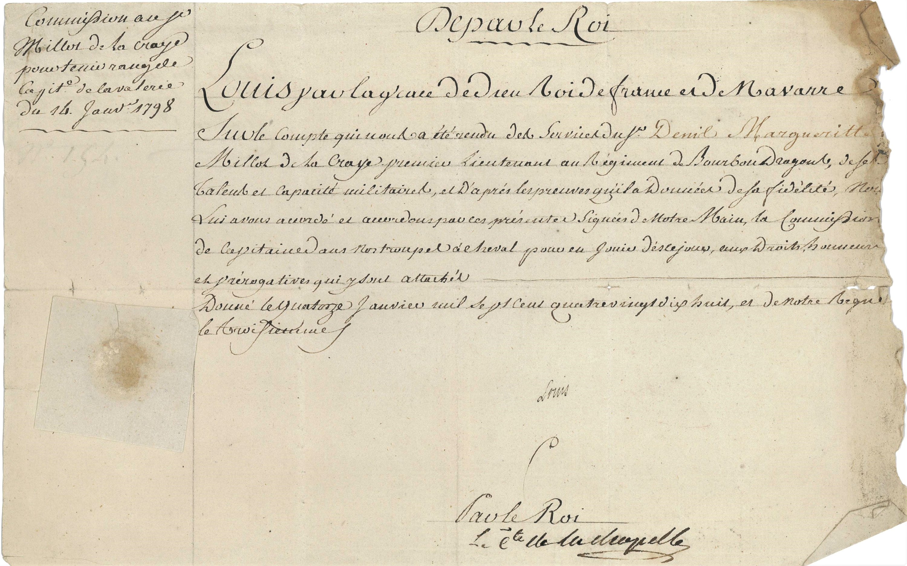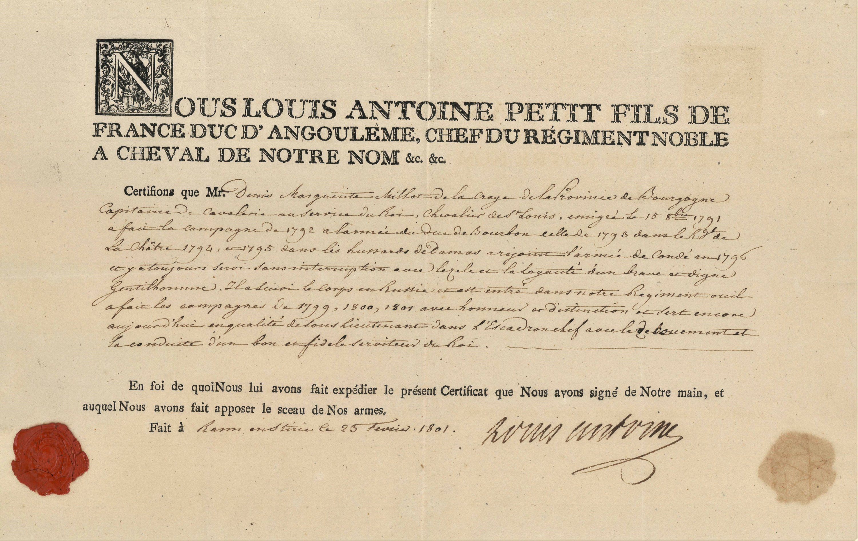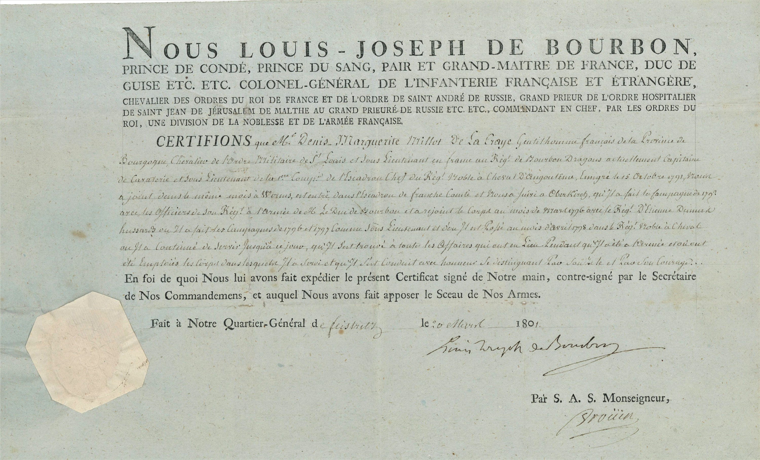 Belle et rare réunion de 24 pièces relatives à la carrière militaire de Denis Marguerite Millot de la Craye, officier ayant participé à toutes les batailles dans larmée des Princes, fin du XVIIIe début du XIXe siècle, dont