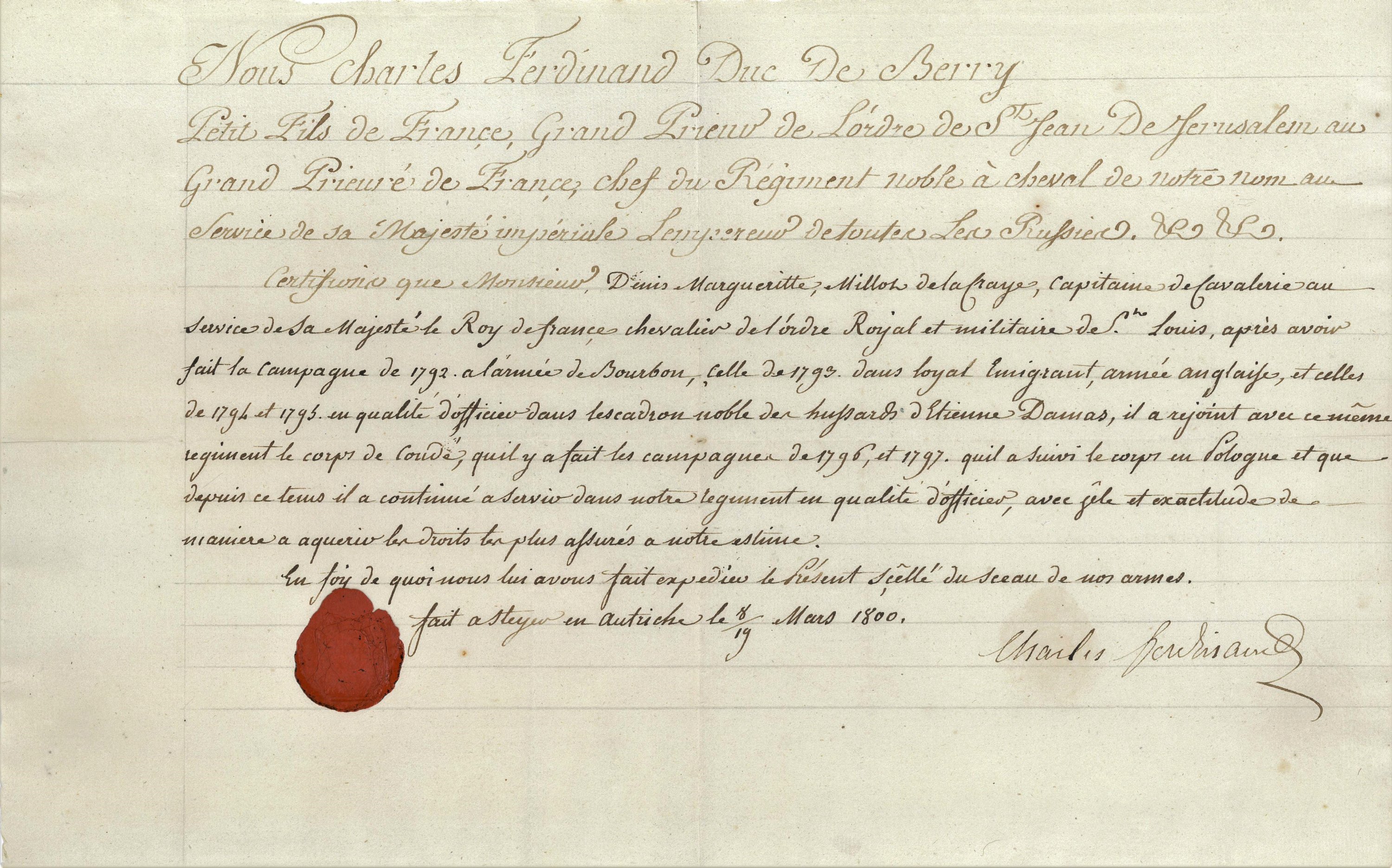 P.S., Steyer en Autriche, 19 mars 1800, Charles Ferdinand dArtois, duc de BERRY (1778-1820), fils de Charles X, 1 page oblong in-fol., cachet de cire rouge ;