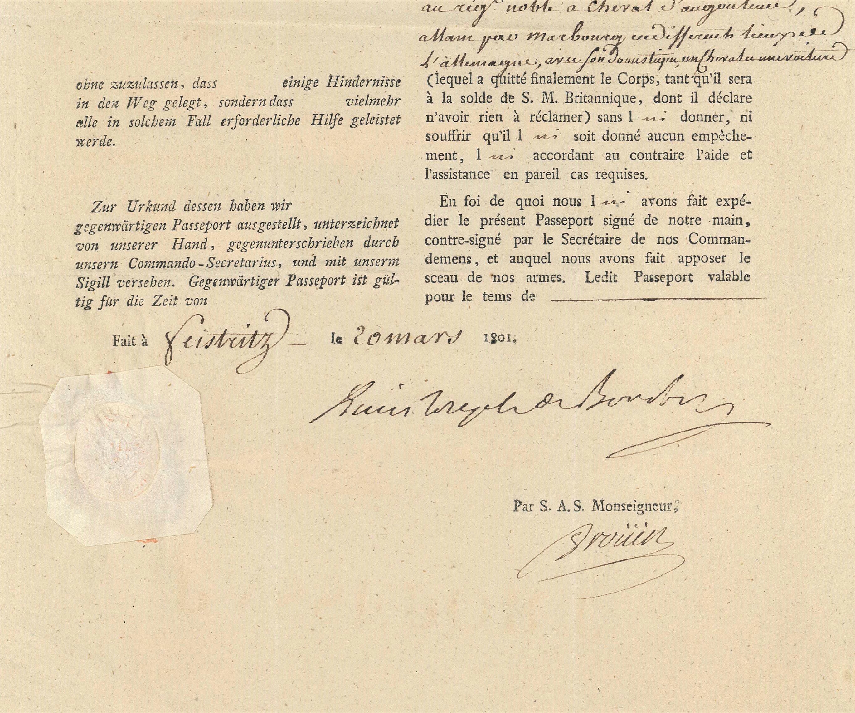 P.S., Feistritz, 20 mars 1801, Louis-Joseph de Bourbon, prince de CONDÉ (1736-1818), 1 page in-fol., cachet à sec.