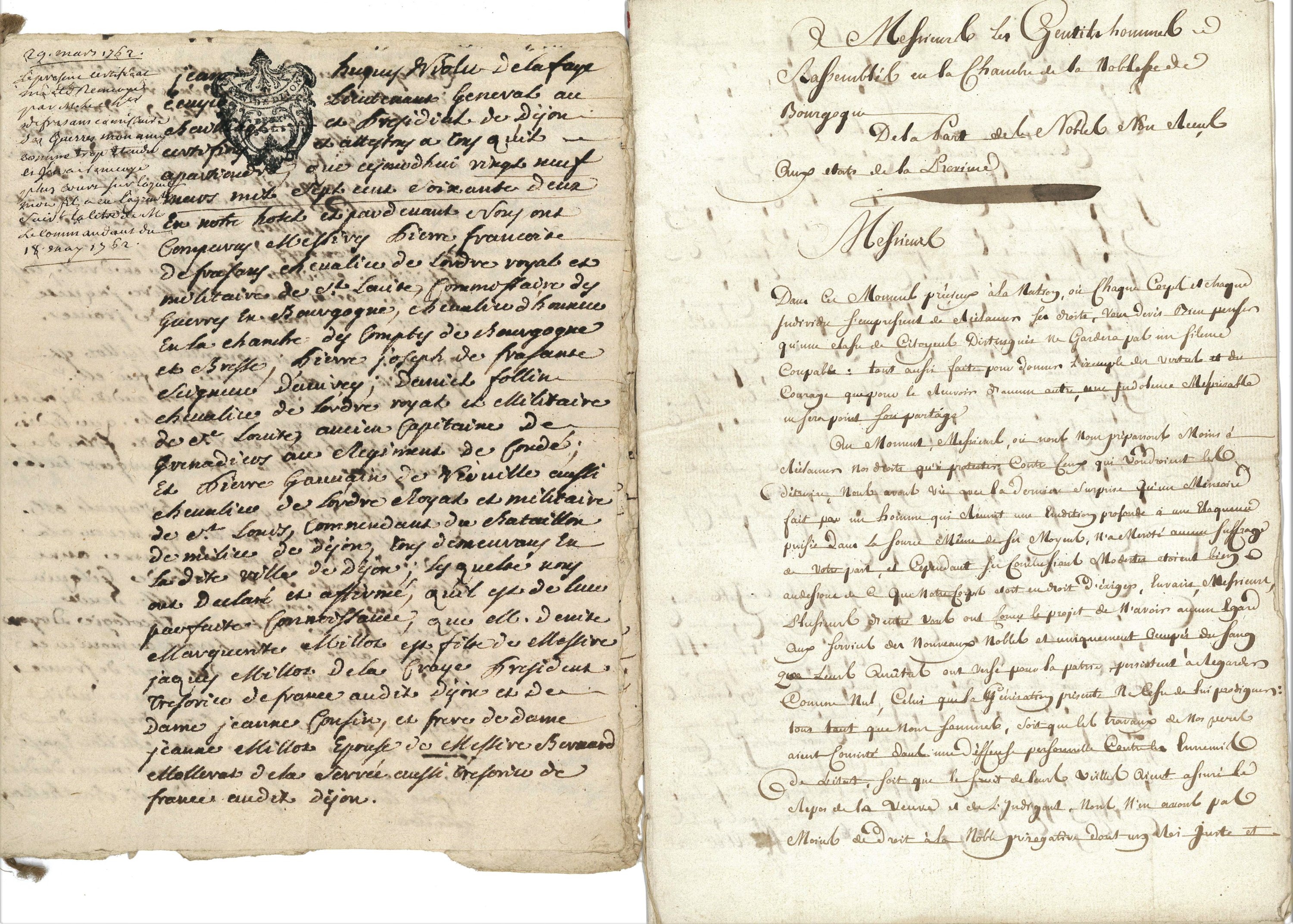 2 affiches de liquidation et partages, an VI, à Dijon, des biens du père de Denis Marguerite MILLOT de la CRAYE, considéré comme ascendant démigré, etc.