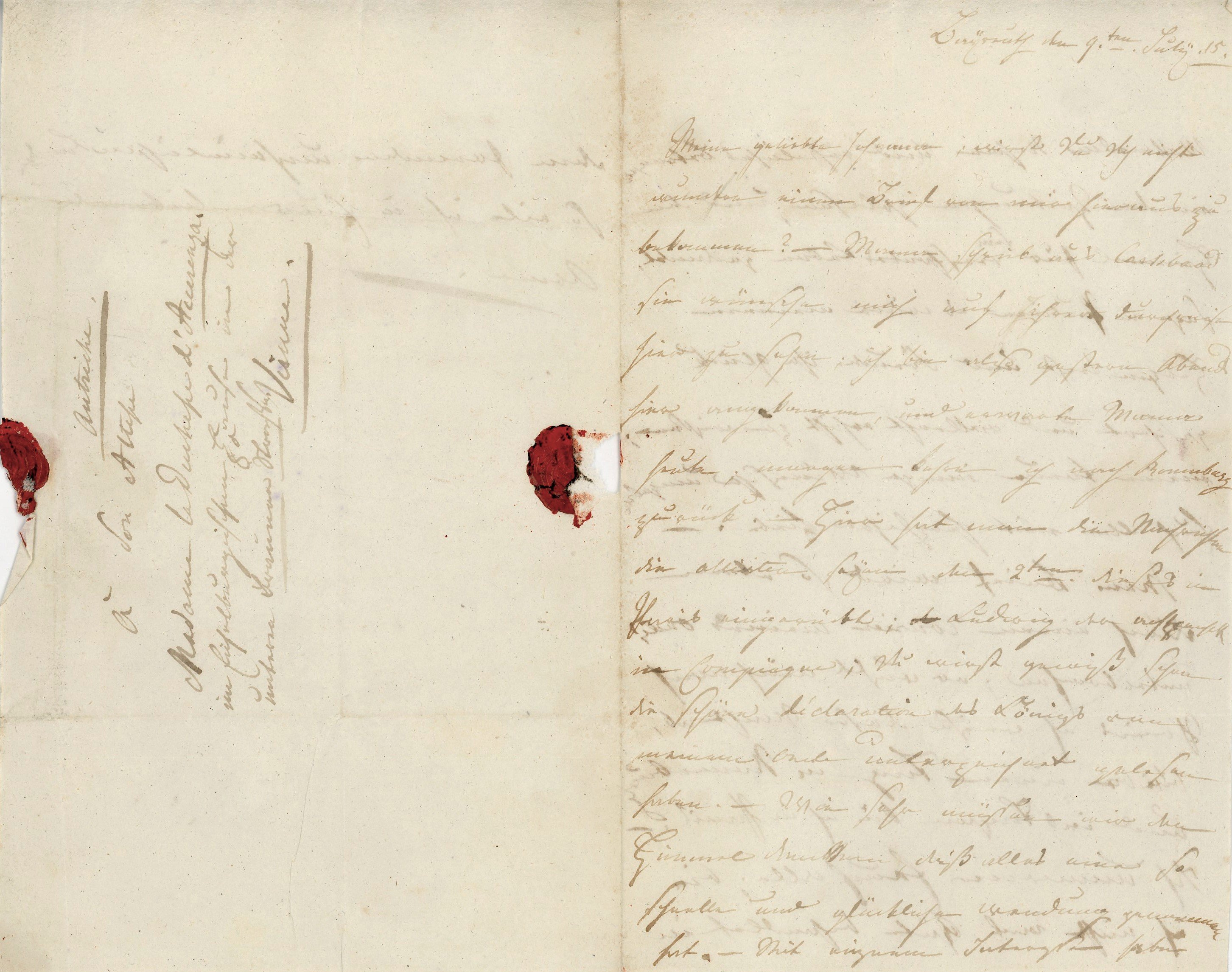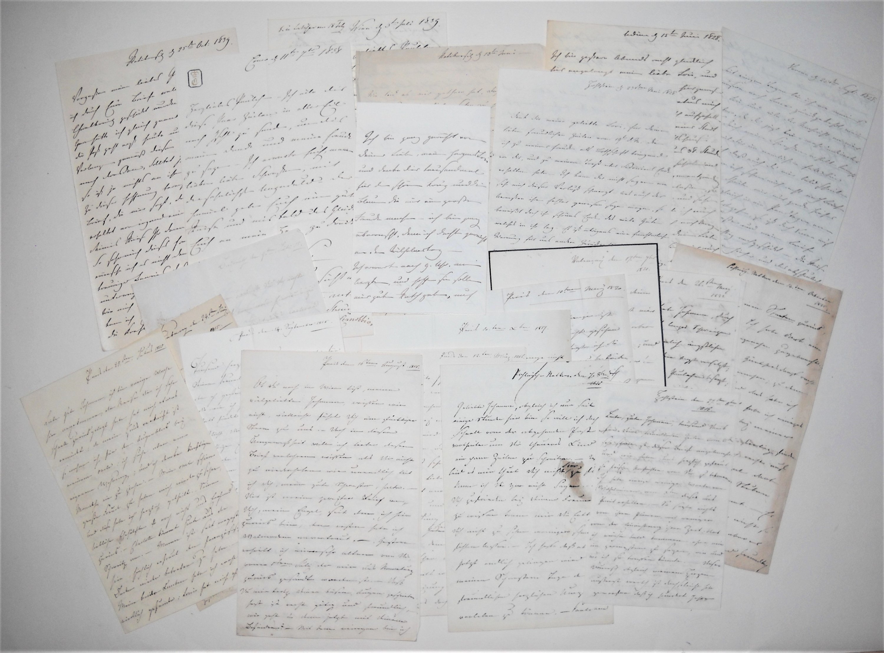 Réunion de 34 L.A. et L.A.S., écrites en allemand gothique (Kurrentschrift), entre 1815 et 1839, adressées à Jeanne Catherine von BIRON, duchesse d’Acerenza, sa sœur cadette, et à la comtesse autrichienne Laure de FUCHS-GALLENBERG son amie, + de 100 pages in-8.