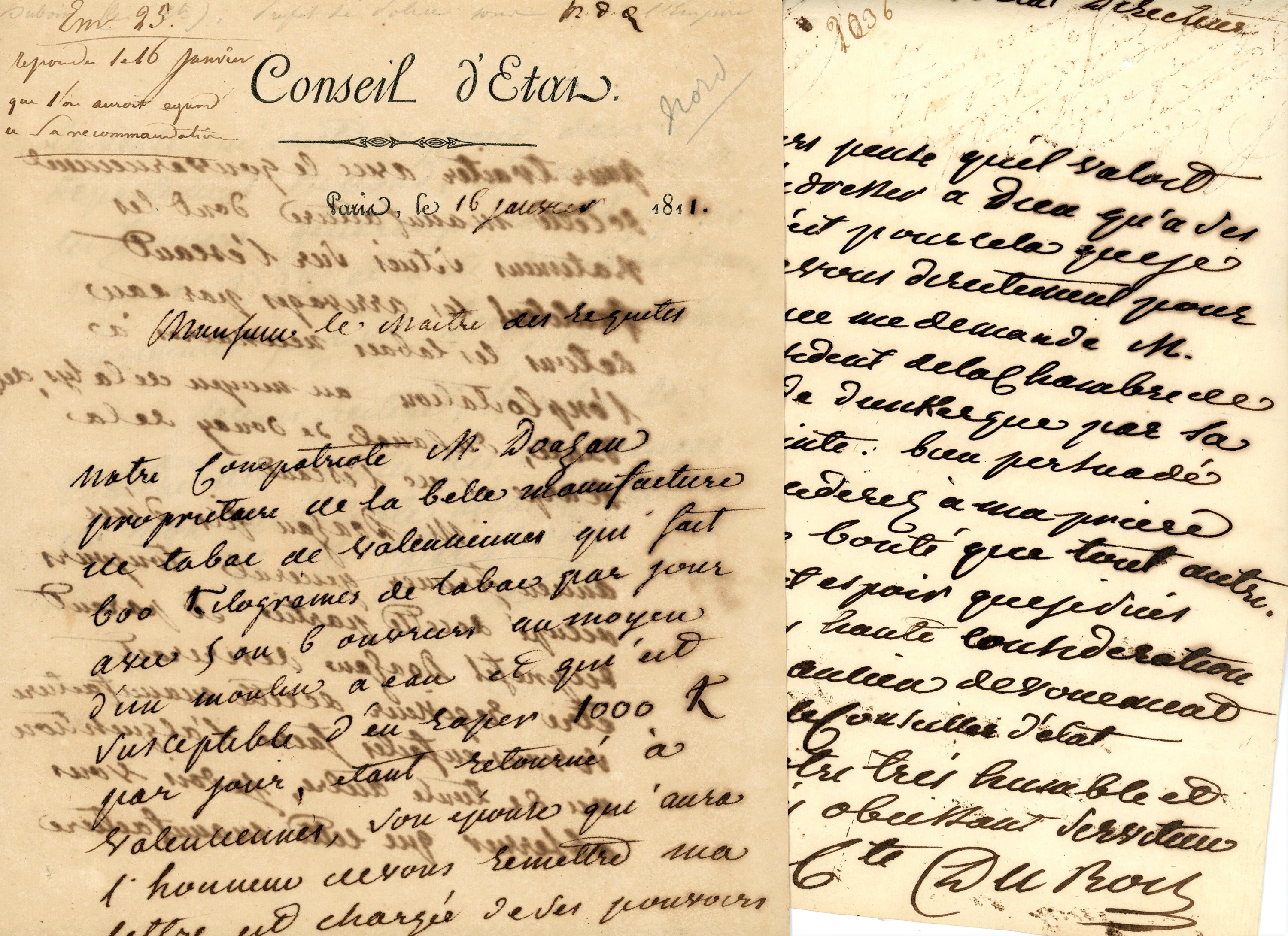 Joint : 3 L.A.S. : 27 août 1807, adressée à son notaire pour un achat de terres, 3 pages in-4 - L.A.S., 16 janvier 1811, adressée au directeur des tabacs au sujet de la manufacture de tabac de Valenciennes, 2 pages ½ in-4 : " qui fait 600 kilogrammes de tabac par jour avec 5 ou 6 ouvriers au moyen d'un moulin à eau et qui est susceptible d'en raper 1000 kg par jour (