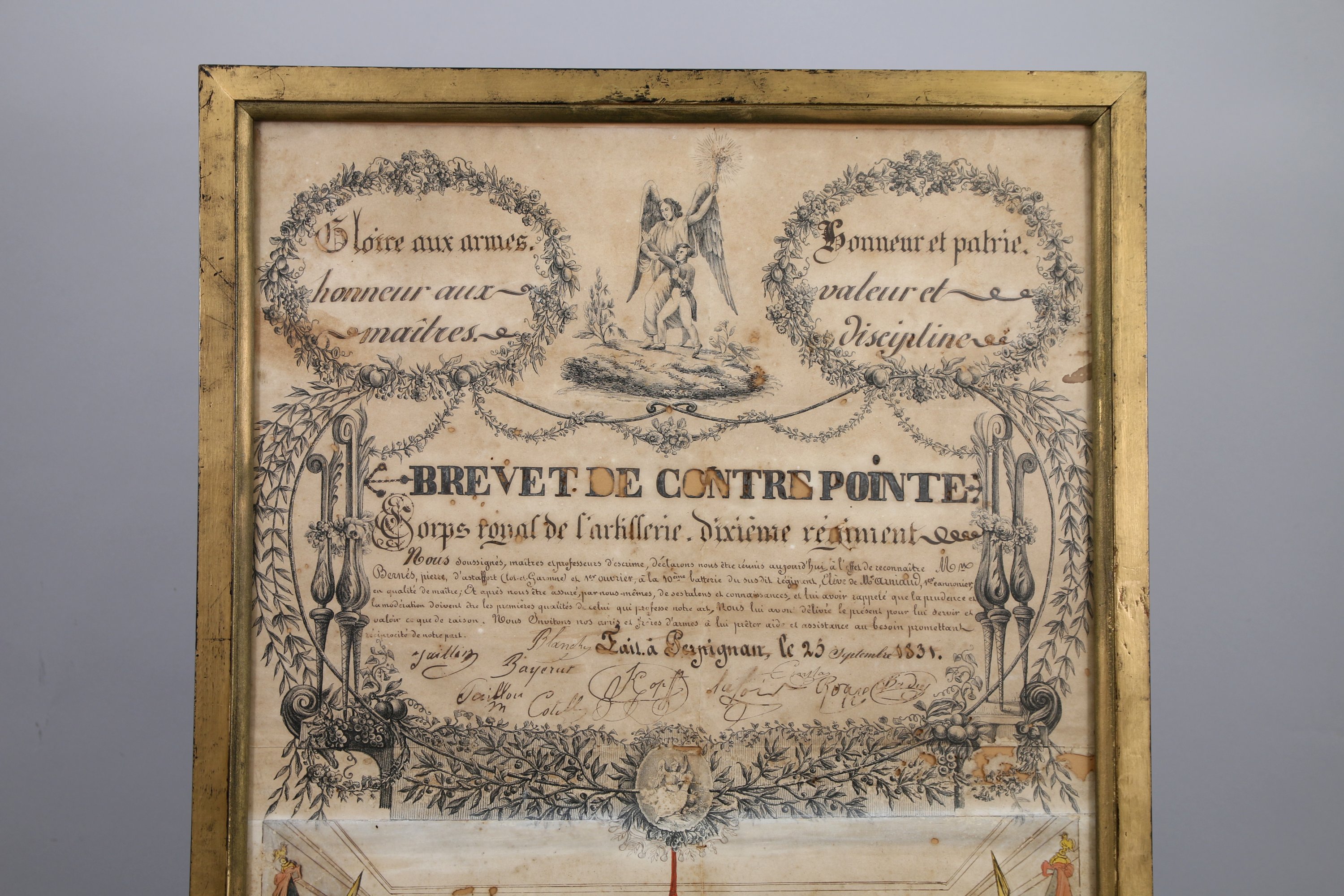 BREVET de contre pointe, en partie lithographiée et texte manuscrit dans la partie supérieure, dessin entièrement à la plume rehaussée à l'aquarelle et à la gouache dans la partie inférieure, décerné à Pierre Bernès, originaire du Lot-et-Garonne, 1er ouvrier au 10e régiment du corps royal de l'artillerie, fait à Perpignan, le 25 septembre 1831. Sous cadre, 67 x 46 cm (accidents et manques).
