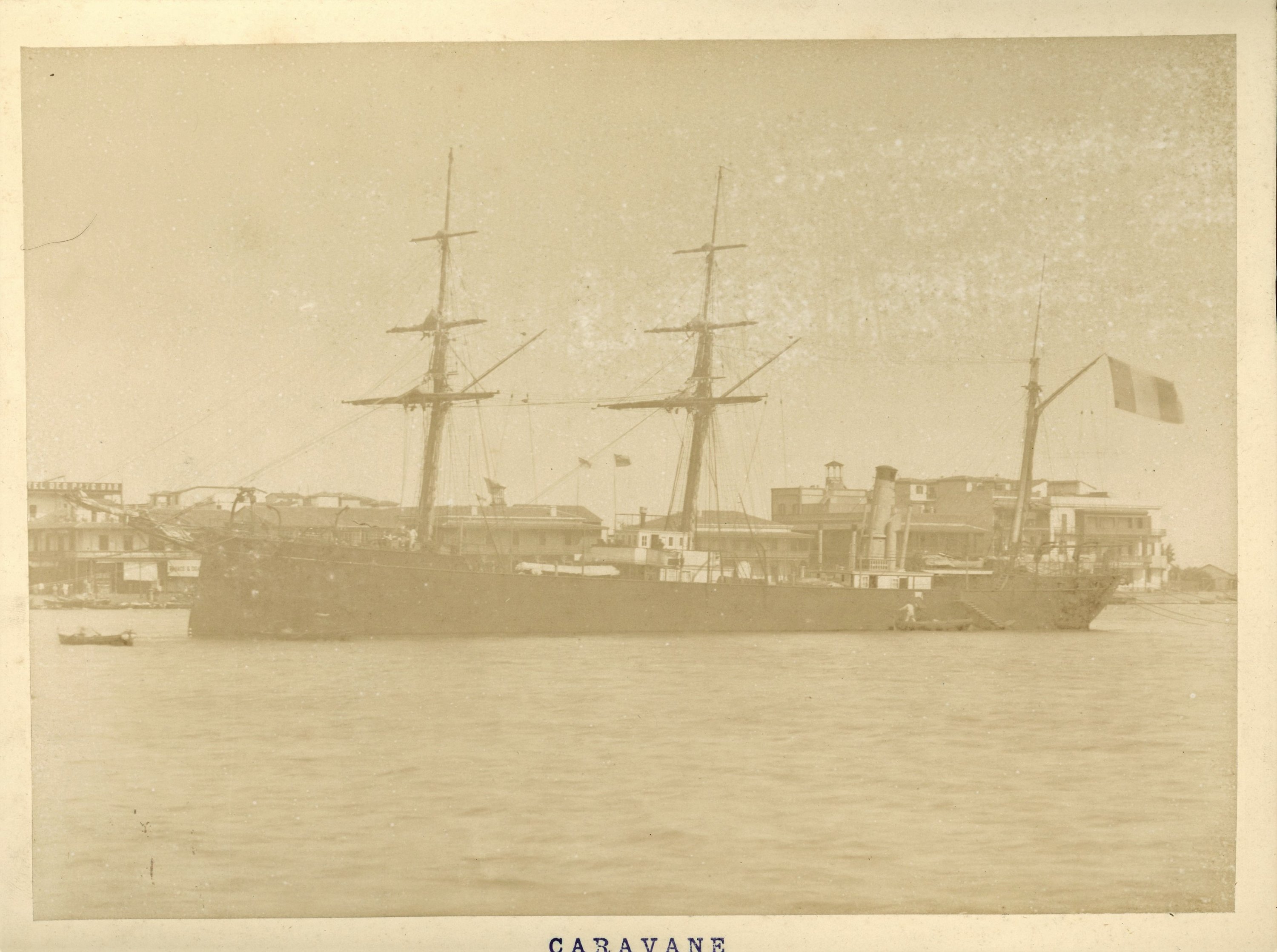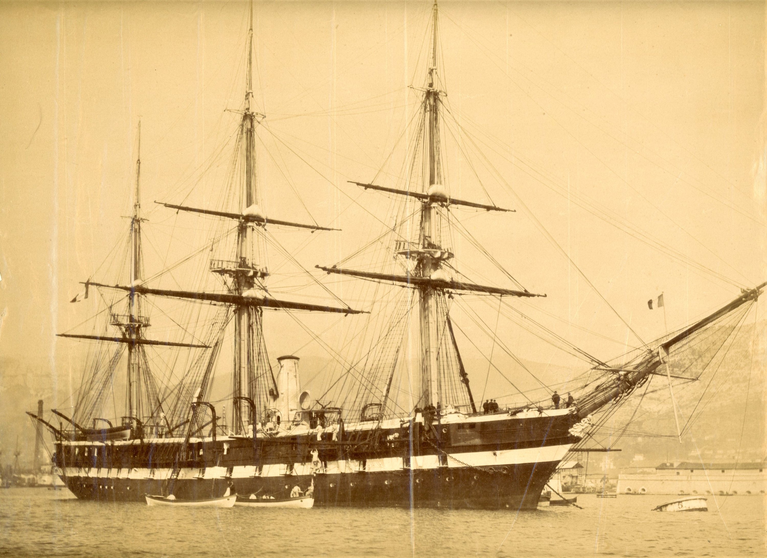 - 4 clichés photographiques, formats divers, fin XIXe siècle de croiseur et frégate dont La Couronne, La Caravane, Le Kersaint.