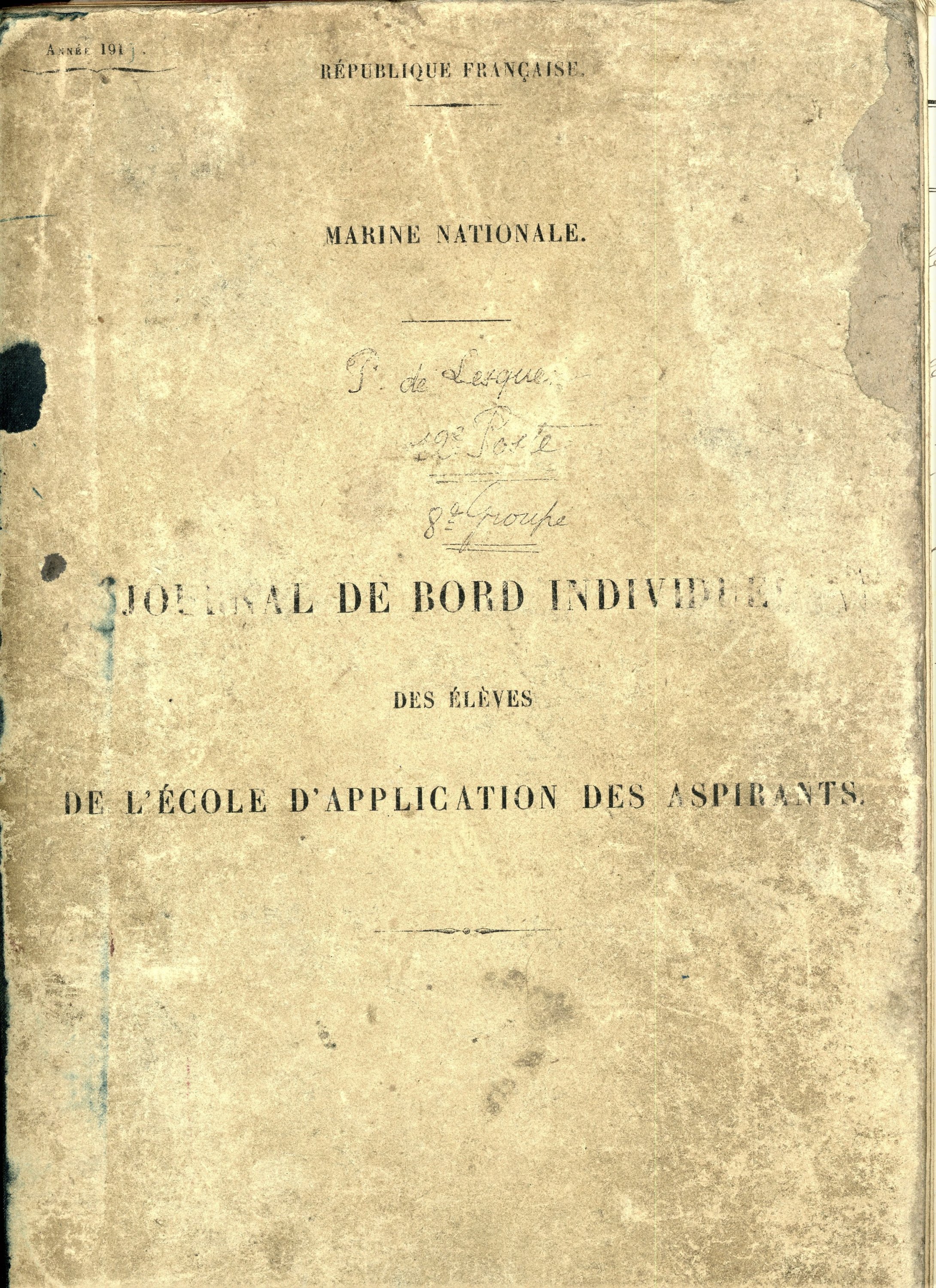 - " Journal de bord individuel des élèves de l'école d'application des aspirants ", 1919-1920, manuscrit autographe de Paul de Lesquen (1899-1975), engagé dans la marine comme enseigne de vaisseau de 2e classe au port de Toulon le 1er octobre, volume in-fol. d'env. 171 ff. avec de nombreux croquis et dessins, couv. cartonnée et dos toilé vert.