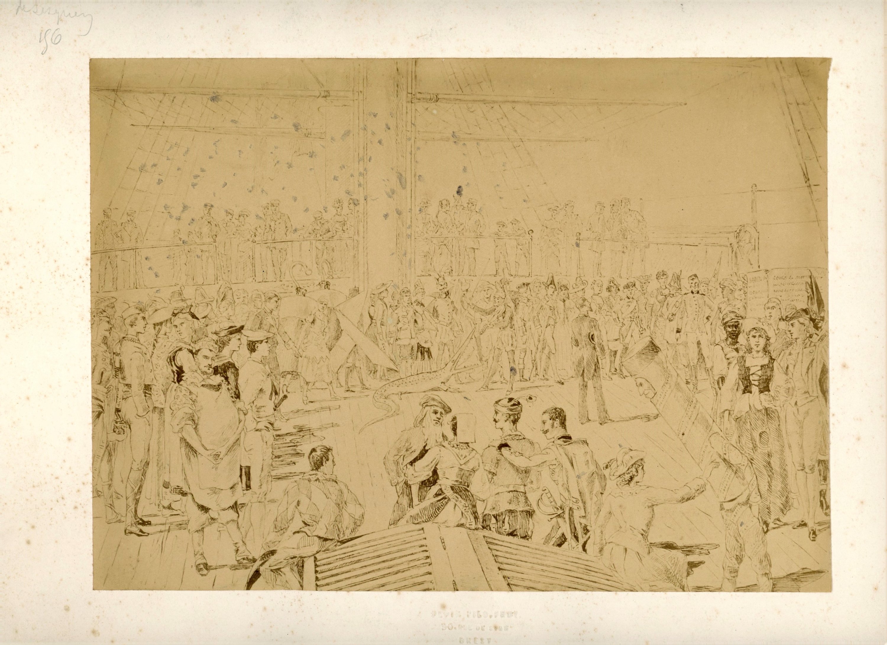 - 2 croquis au crayon de batteries de canon du navire-école le Borda, signés de Lesquen et datés du 4 mai 1885 ; l'auteur est probablement Constant de Lesquen, père de Paul, engagé dans la marine en 1883, 25 x 32 cm + dessin à la plume du même auteur daté du 3 novembre 1884 représentant un grenadier de l'armée royale française, 32 x 25 cm + cliché photographie d'un dessin représentant une rare scène de Mardi Gras à bord d'un navire daté de 1884, 18 x 24 cm.