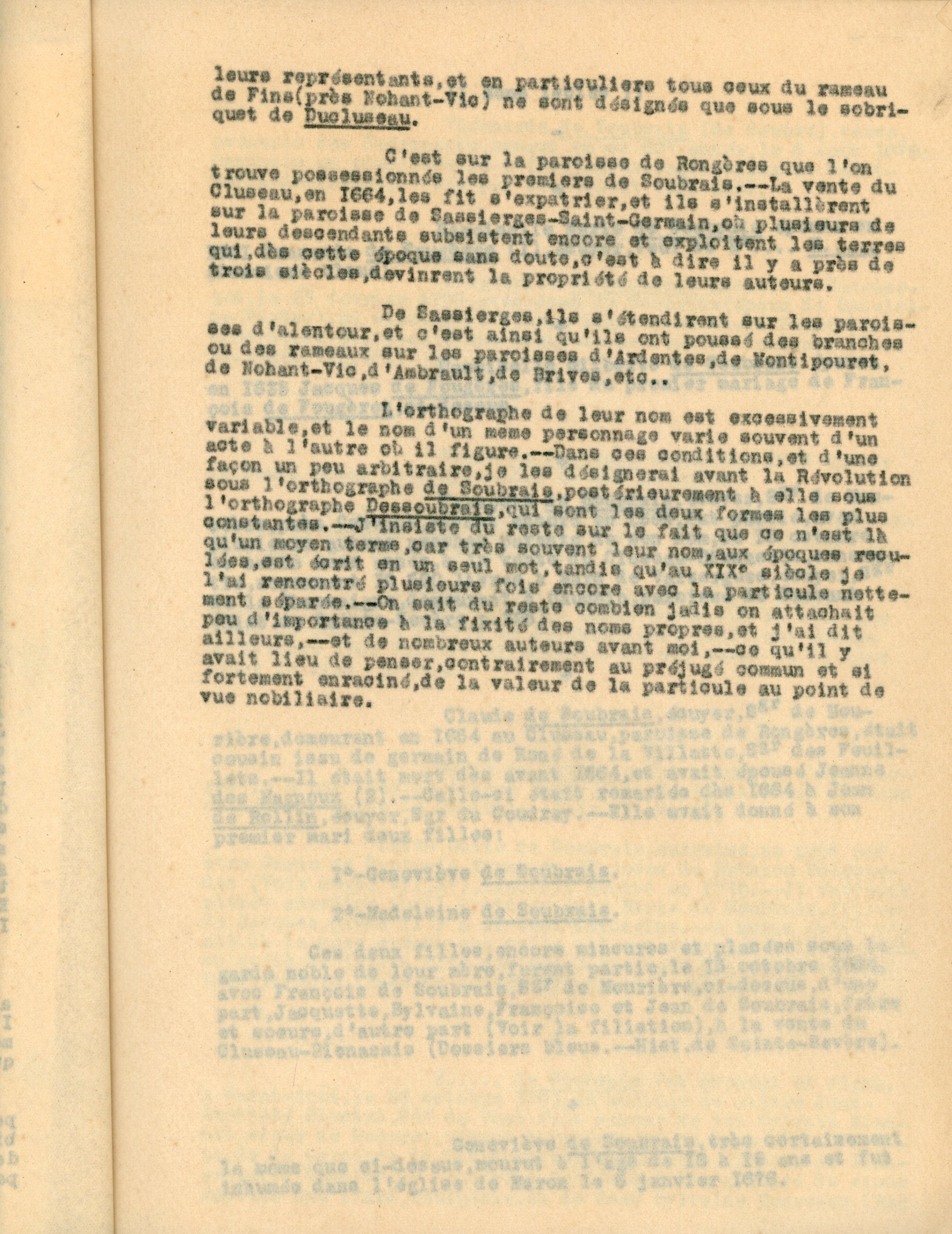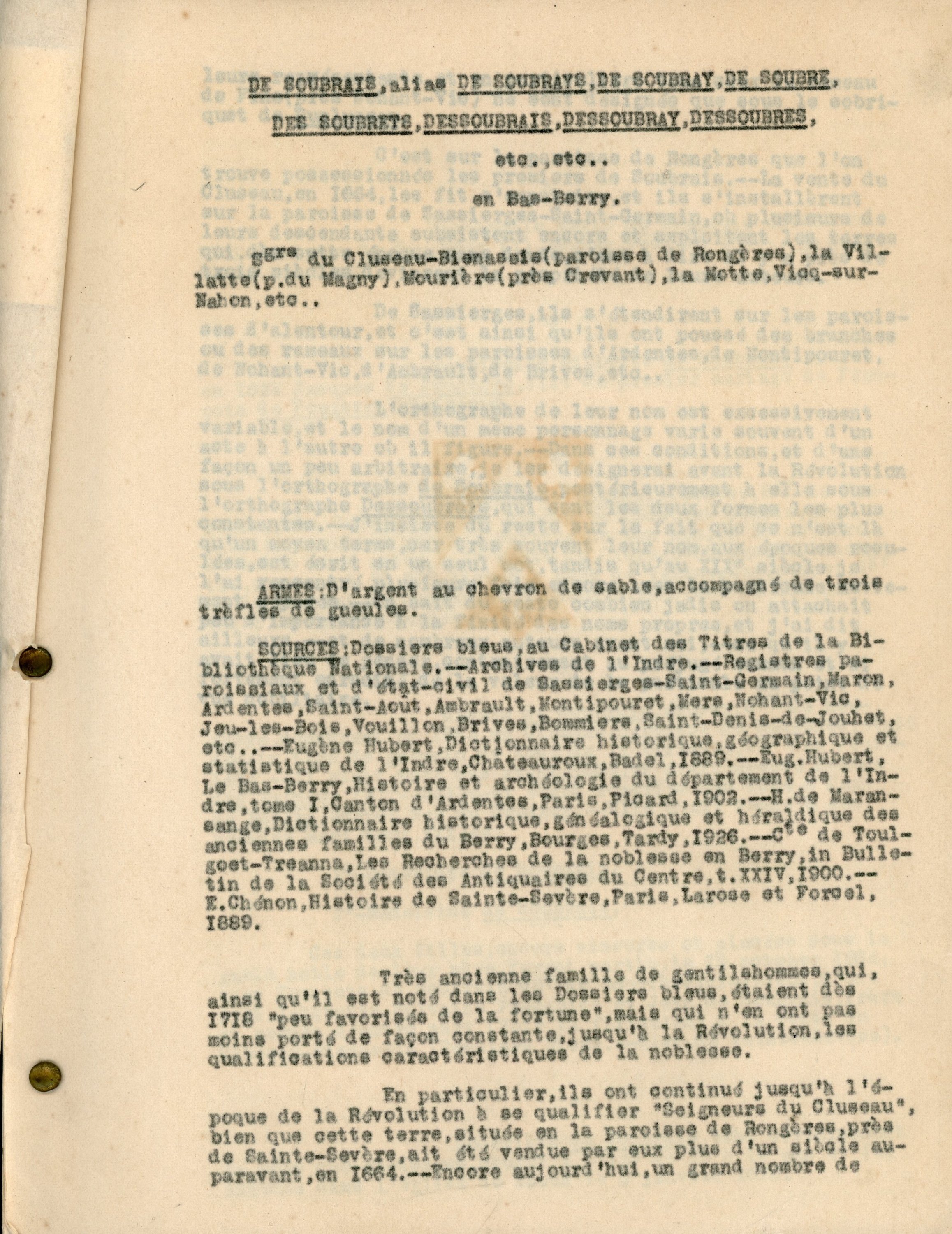 Généalogie de la famille « de Soubrais, alias de Soubraye, de Soubray, etc… en Bas Berry » par le docteur Edoaurd de la Dure, [1935], tapuscrit de 83 pages in-4, avec dessins de blasons de familles.