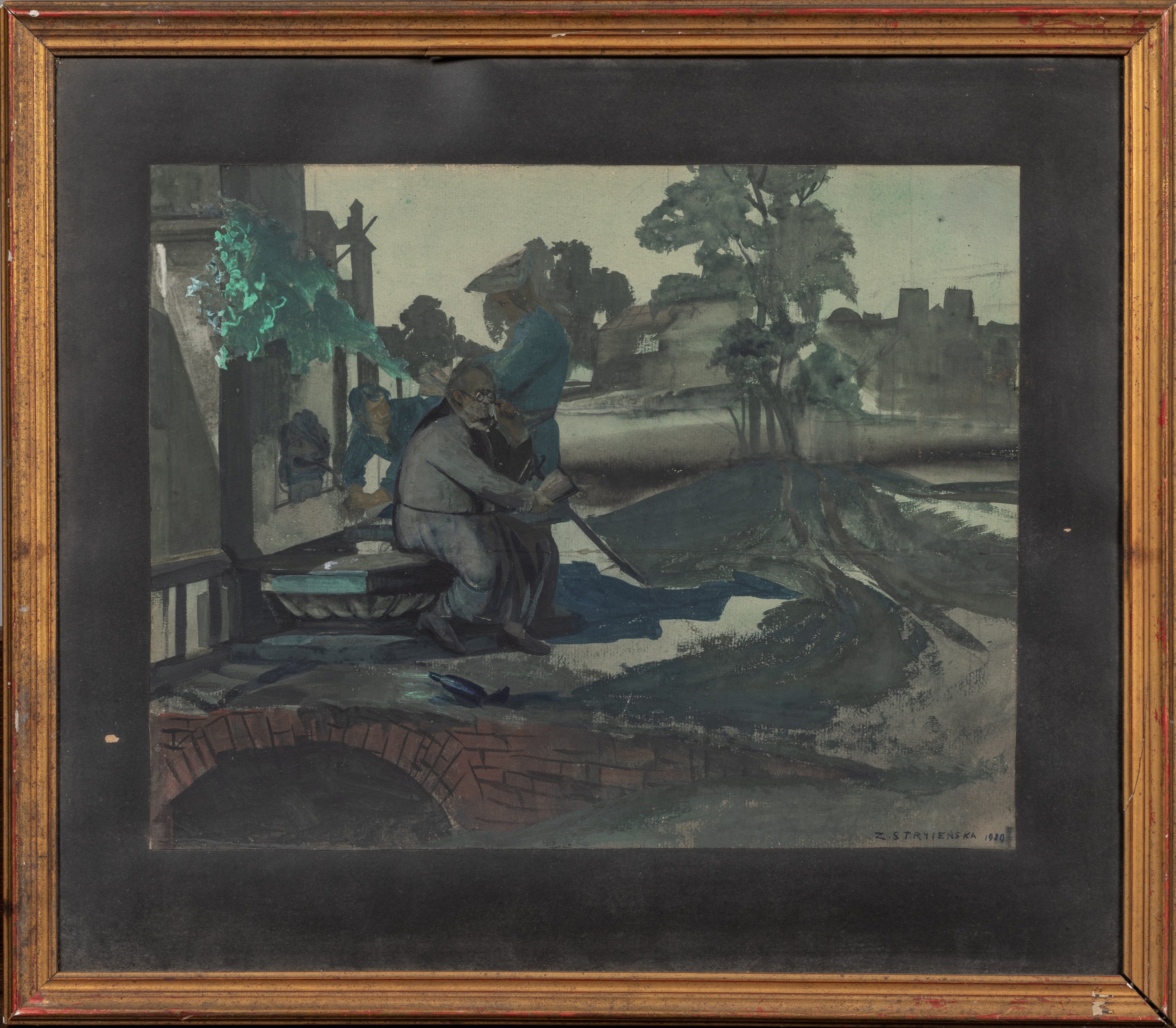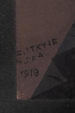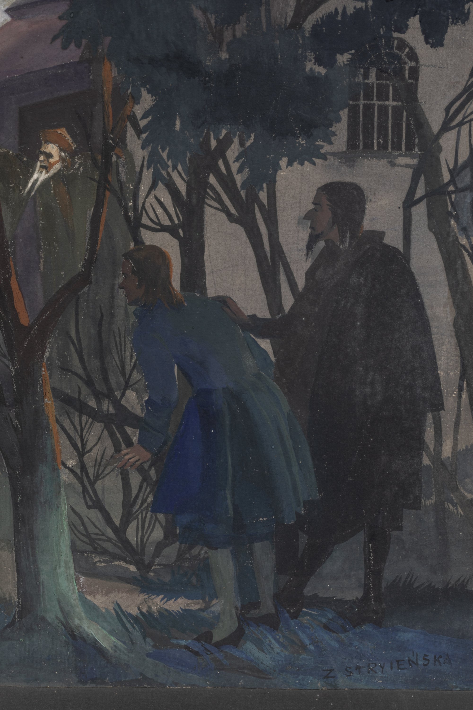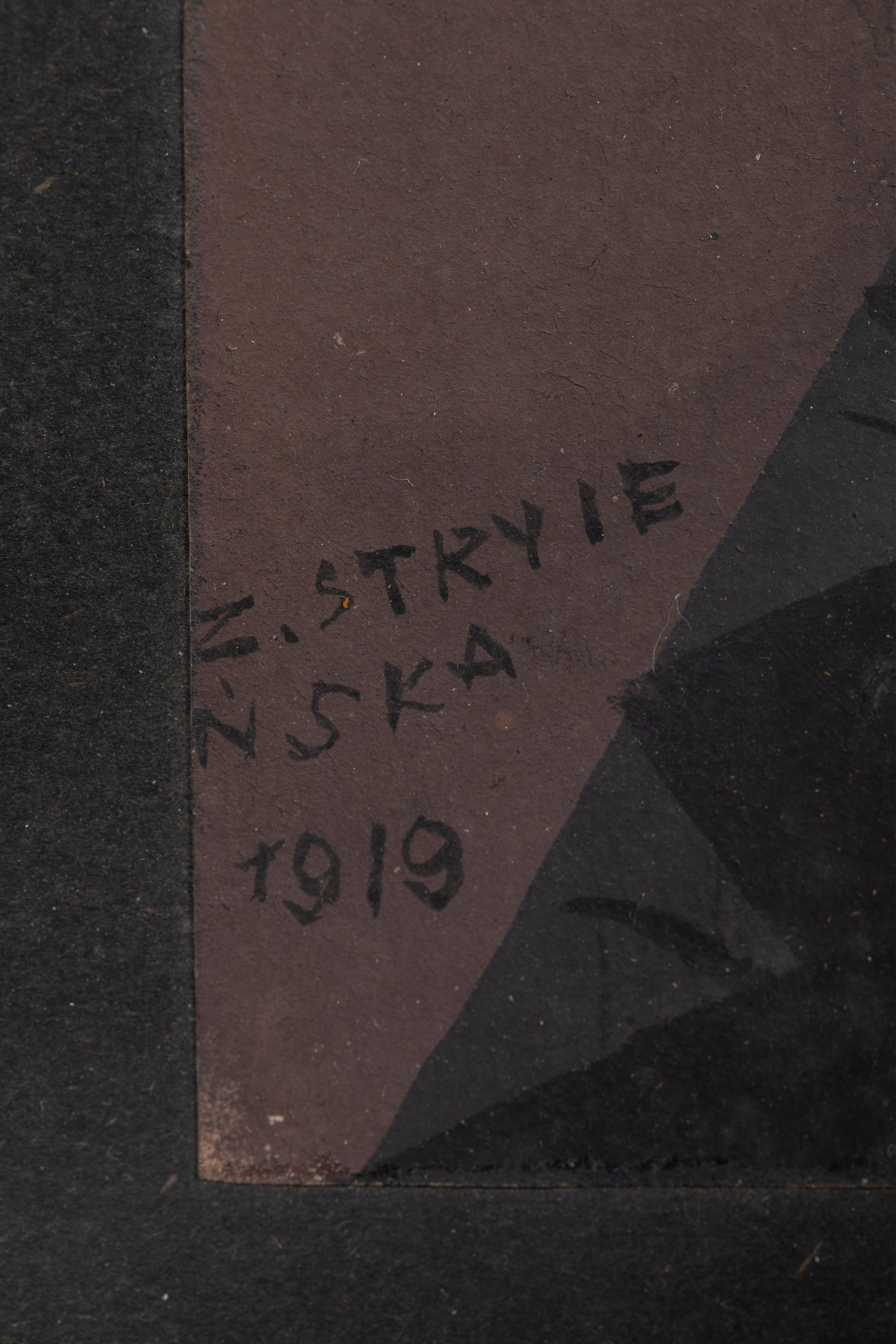 Notre série de cinq gouaches totalement inédites lève le voile sur son premier séjour à Paris, de septembre 1919 à Noël 1920. Installés près du Panthéon, puis rue de Rennes et enfin dans l’atelier de Jan Wacław Zawadowski, les Streyjenski fréquent la bohème de Montparnasse. Marquée par sa rencontre avec la peintre Olga Boznanska, à qui elle consacre un paragraphe entier dans son journal, Zofia Streyjenska rencontre également le violoniste Stefan Frenkel, les comtes de Tubieński et Rzewusk, les sculpteurs Jadwiga Bohdanowicz-Konczewska ou Artur Rubinstein. Le couple explose dans la capitale française, conduisant à une première rupture. Zofia continue, elle, de créer, bien qu’il reste peu de témoignages de cette époque. Elle a en effet déchiré ses dessins rapportés en Pologne, où seule une poignée de tableaux de cette période cubiste est conservée.