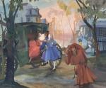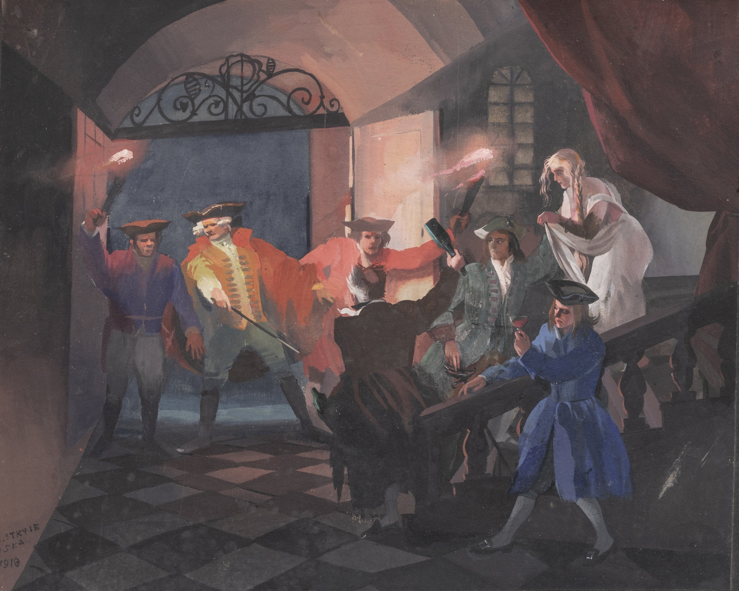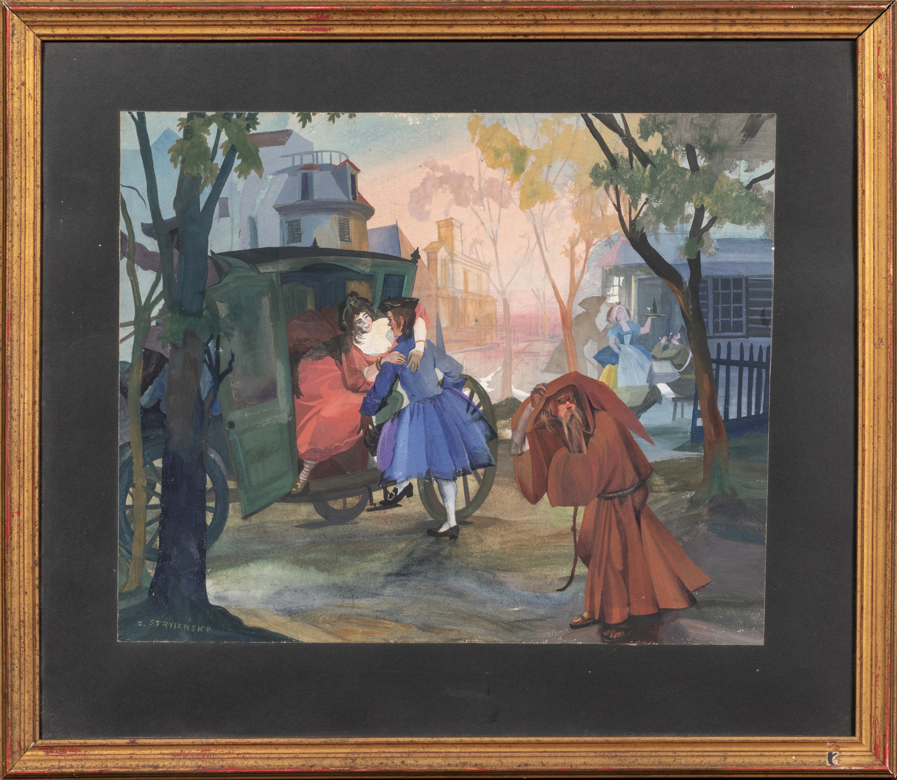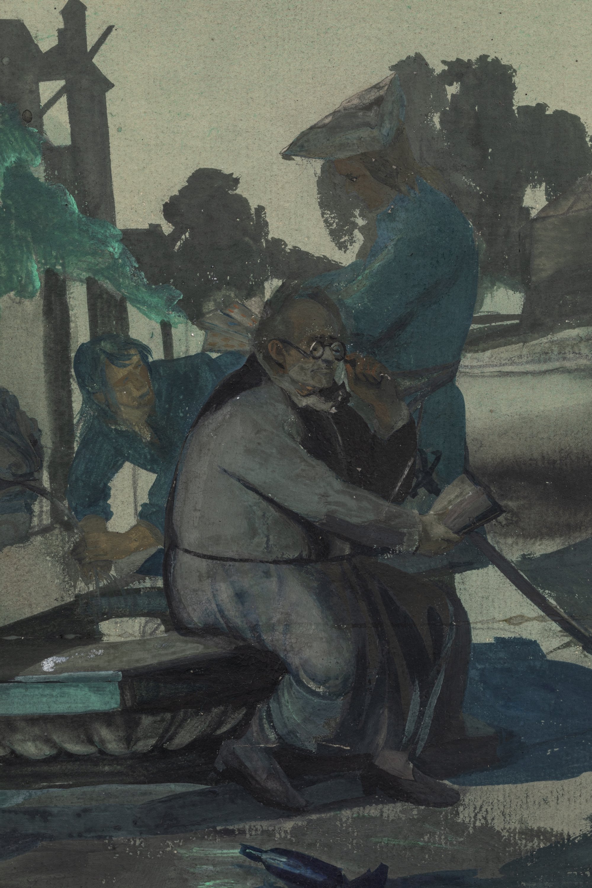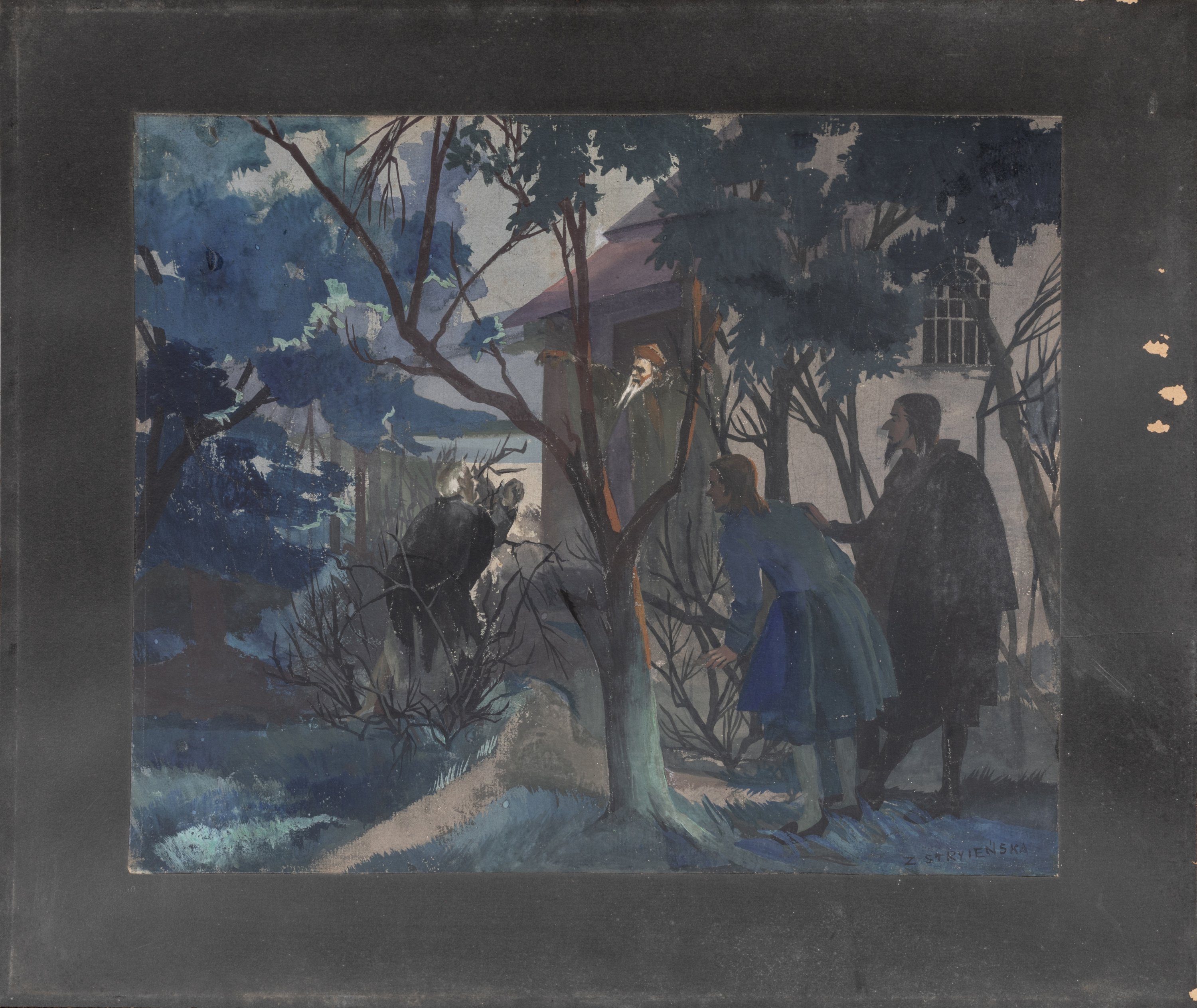 Notre série de cinq gouaches totalement inédites lève le voile sur son premier séjour à Paris, de septembre 1919 à Noël 1920. Installés près du Panthéon, puis rue de Rennes et enfin dans l’atelier de Jan Wacław Zawadowski, les Streyjenski fréquent la bohème de Montparnasse. Marquée par sa rencontre avec la peintre Olga Boznanska, à qui elle consacre un paragraphe entier dans son journal, Zofia Streyjenska rencontre également le violoniste Stefan Frenkel, les comtes de Tubieński et Rzewusk, les sculpteurs Jadwiga Bohdanowicz-Konczewska ou Artur Rubinstein. Le couple explose dans la capitale française, conduisant à une première rupture. Zofia continue, elle, de créer, bien qu’il reste peu de témoignages de cette époque. Elle a en effet déchiré ses dessins rapportés en Pologne, où seule une poignée de tableaux de cette période cubiste est conservée.