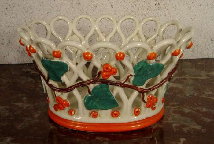 Petite CORBEILLE blanche tressée sur socle, à décor polychrome : feuilles vertes, branche marron et baies oranges. Initiales "C.B." en creux. Haut. 10 cm.