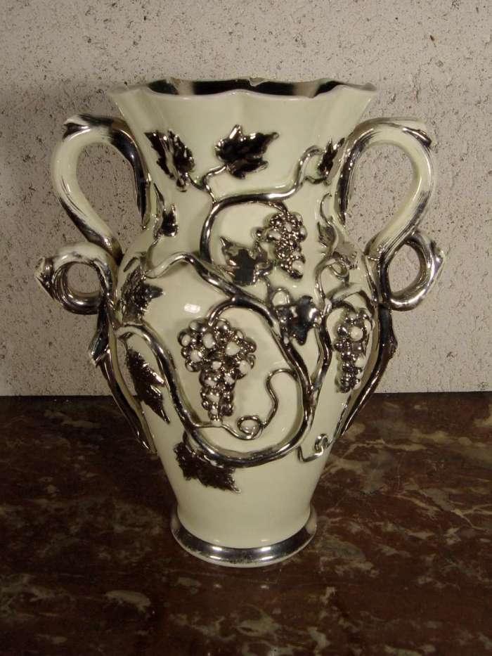 VASE blanc à col court octolobé, anses en forme de branchages, à décor platine de grappes de raisin, feuilles et pampres. Initiales "C.B." en creux dans un cartouche ovale en creux. Haut. 25 cm.