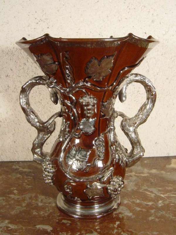 Beau VASE marron à piédouche, col long hexalobé, à anses en forme de ceps de vigne. Décor platine de grappes de raisin, feuilles et pampres. Haut. 26 cm.