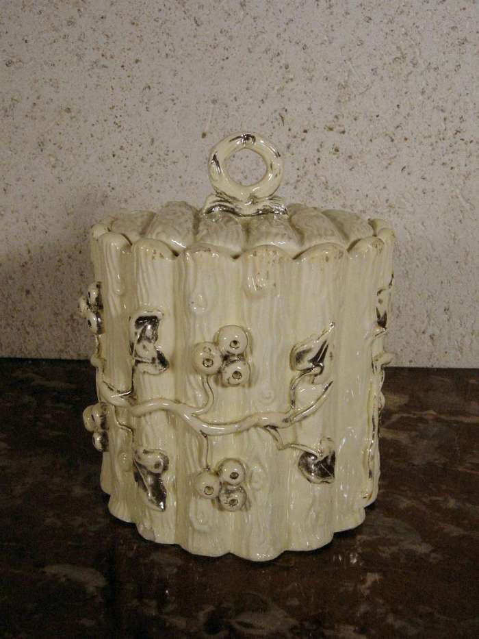 POT À TABAC blanc à bordure chantournée. Décor platine de baies, feuilles et rameaux. Fretel en forme de branchages. (éclat) Haut. 16 cm, Diam. 12 cm.