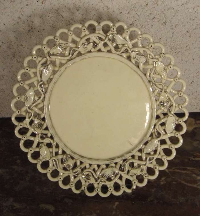 ASSIETTE blanche à fond uni avec marli ajouré et tressé comportant un décor de feuilles platines. Cartouche en creux "Ch. de Boissimon et Cie à Langeais (Indre-et-Loire)" dans un cartouche rectangulaire sur socle en relief. (petit éclat) Diam. 26,5 cm.