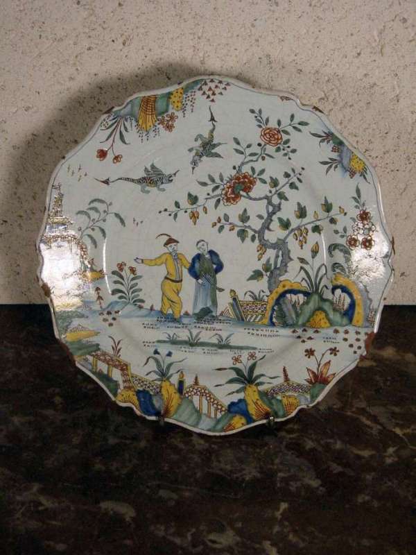 ROUEN. ASSIETTE à bord festonné, décor de grand feu en camaïeu, au chinois. Milieu XVIIIème. (égrénures) Diam. 24,5 cm.
