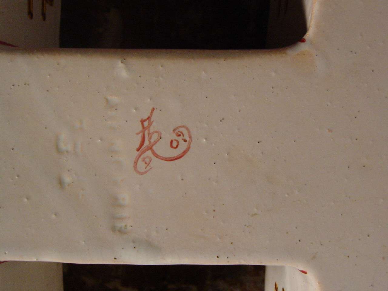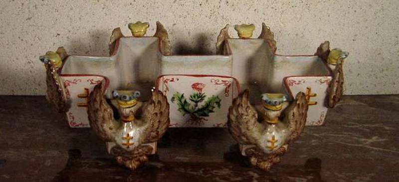GALLÉ ? JARDINIÈRE en forme de CROIX DE LORRAINE à décor de croix de Lorraine, de chardons et de 6 alérions aux armes de la ville de Nancy. Marque en creux : "ALIGERI ?" et signature manuscrite en rouge se rapprochant d'une des marques de Gallé. Haut. 10, Long. 32 cm.
