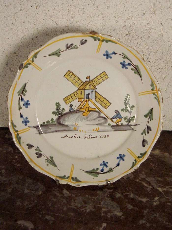 NEVERS. Assiette patronymique à décor polychrome représentant 2 personnages près d'un moulin à vent avec l'inscription "André dufour 1789". XVIIIème. Diam. 23 cm.