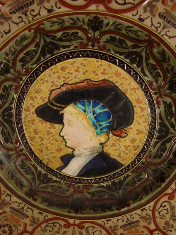 BORDEAUX. VIEILLARD. PLAT cardinal à décor sur l'aile de grotesques en symétrie et en son centre d'un portrait de jeune femme dans le goût de la Renaissance. Marque en creux. Diam. 37 cm.