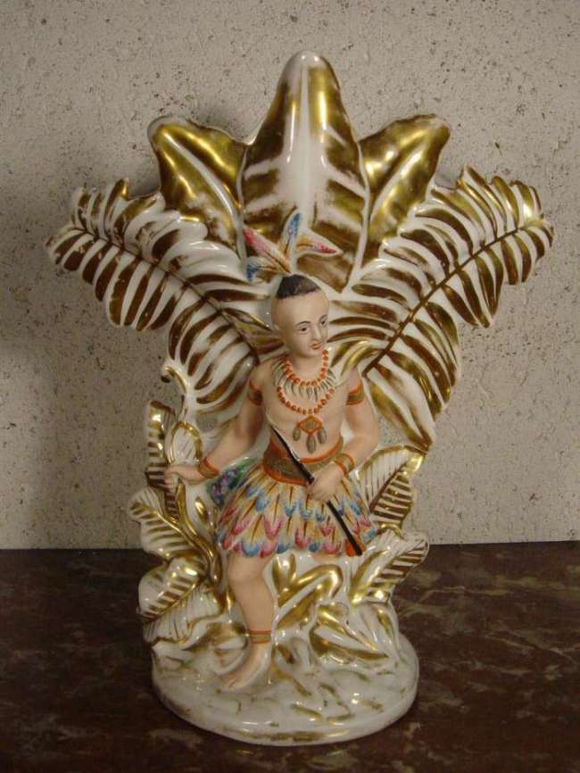 VIEUX PARIS. Paire de VASES à décor polychrome et or. Deux sujets, indien et indienne (?) en tenues de chasse s'échappent d'une nature arborescente de fougères et feuillages. XIXème. Haut. 28, Long. 23 cm.
