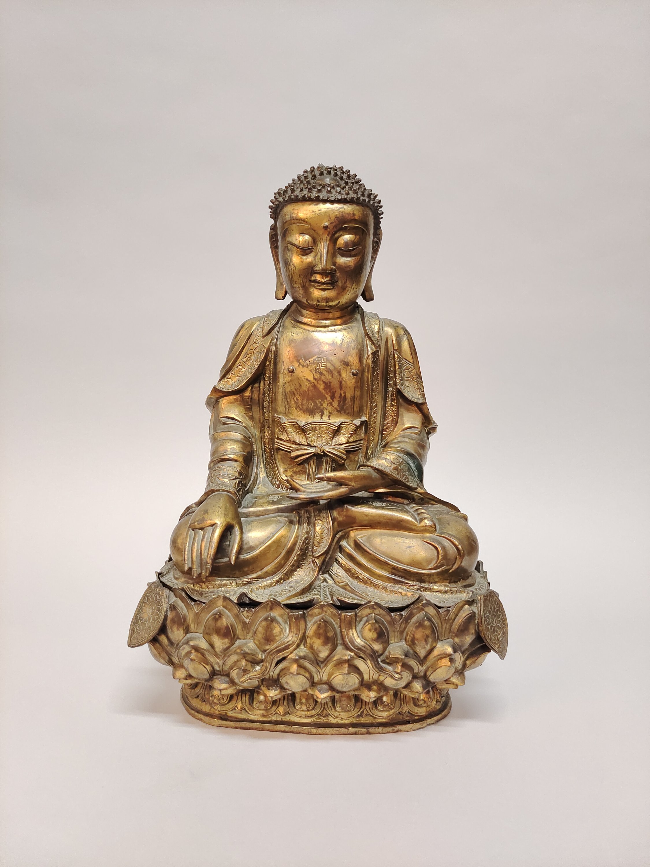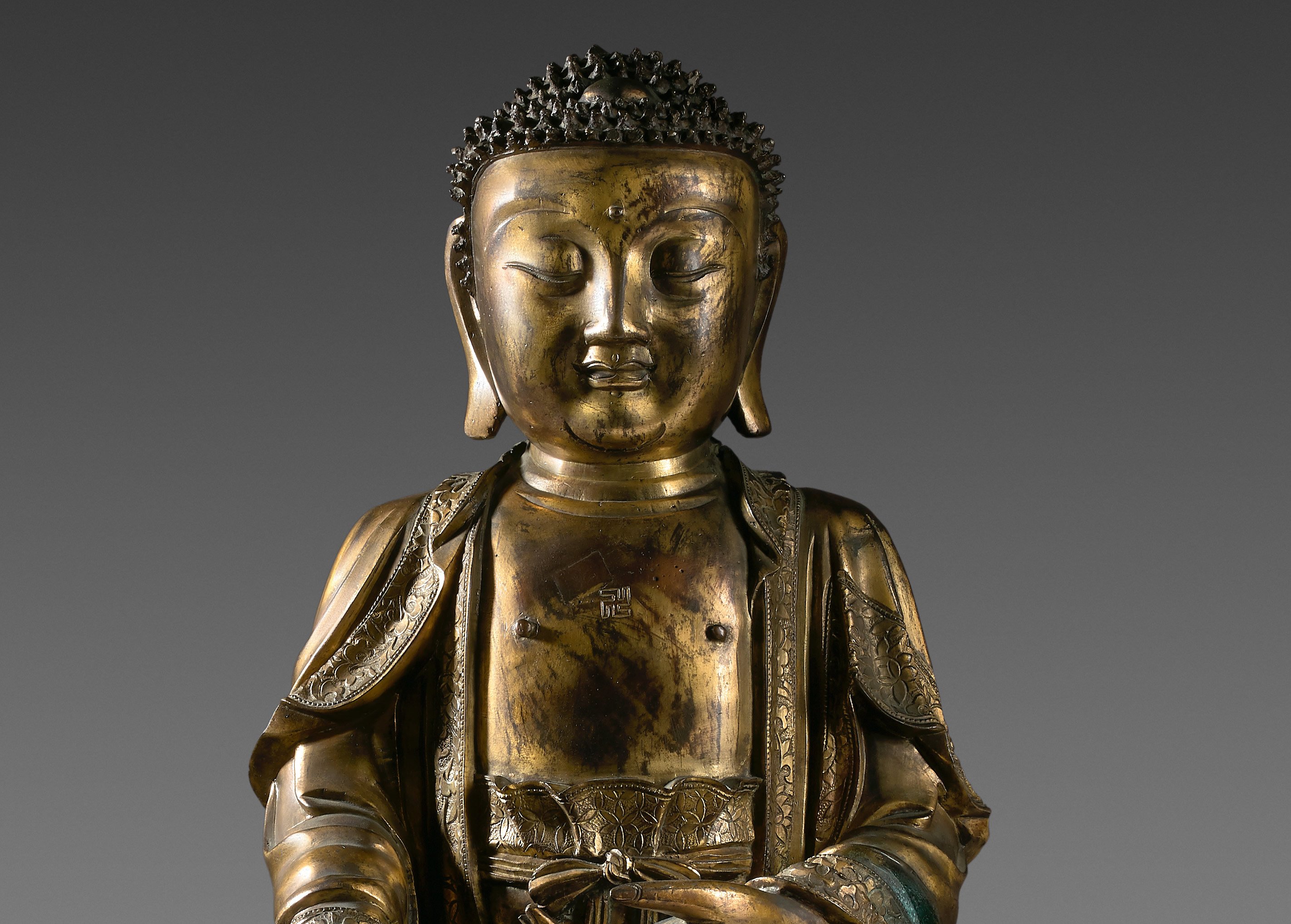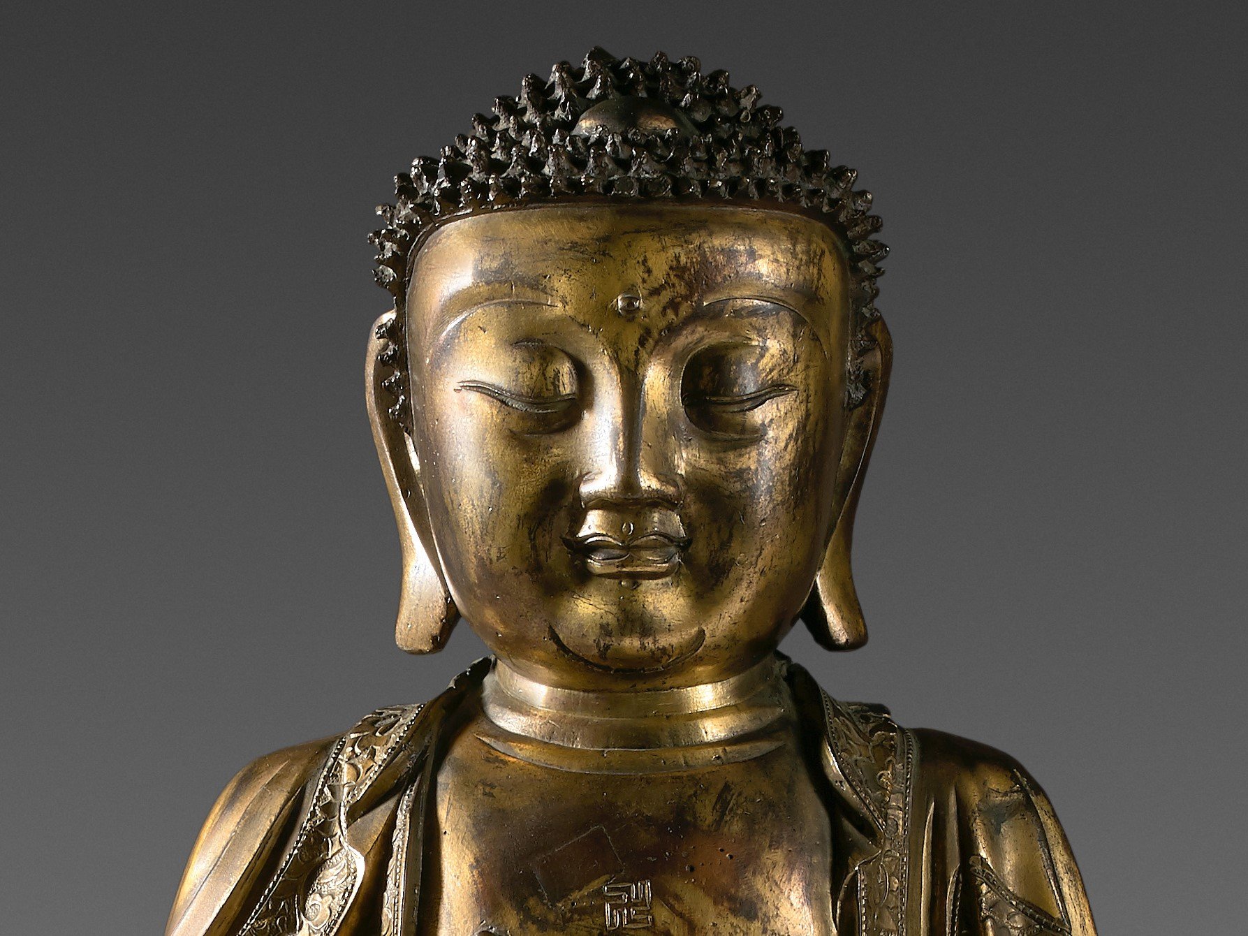 Constitué en deux parties, surélevé sur une base en forme de double lotus, ce bouddha et sa base en bronze doré sont finement ciselés et repoussés. Le visage harmonieux et serein, les yeux entrouverts regardant vers le bas, ils symbolisent la surveillance continuelle du boddhisatva sur l’humanité. Ce type de visage de Bouddha est typique de la dynastie Ming : dodu avec un front et des pommettes larges, un visage rond, de longs lobes d’oreilles charnus, symbole du renoncement à la vie matérielle et de son dévouement à une vie spirituelle, les traits du visage bien proportionnés, le menton surligné, les paupières légèrement baissées surmontées de l’urna, une expression du visage calme et douce, la bouche esquissant un léger sourire, signe de compassion, le cou orné des trois plis de la sagesse, les épaules carrées larges, le buste droit. Il porte un manteau monastique finement plissé épousant les gestes du corps, à décor gravé en bordure de rinceaux de fleurs de lotus, qui laisse apparaitre son buste incisé au niveau du chakra du cœur du svastika, signifiant bonheur et prospérité. Dans le bouddhisme, le svastika symbolise la roue de la loi. En Chine, le svastika, symbolise le chiffre 10 000, reflet de l’infini, représentation de l’éternel qui se révèle dans l’esprit du bouddha. Dans le bouddhisme Chan, courant dominant sous la dynastie Ming, le svastika incarne le « Sceau de l’Esprit de Bouddha », Busshin-In. Les mains et les pieds des statues de Bouddha de la dynastie Ming sont vifs et réalistes, avec des doigts fins et doux. Les orteils sont pleins et de forme hémisphérique. Ici, la plante des pieds est incisée de la roue des enseignements du bouddha, dite « dharmachakra », « la roue du changement ». Elle se réfère à la transformation soudaine et immédiate spirituelle déclenchée par les enseignements du bouddha à travers les quatre vérités, le noble sentier octuple et la voie du milieu.