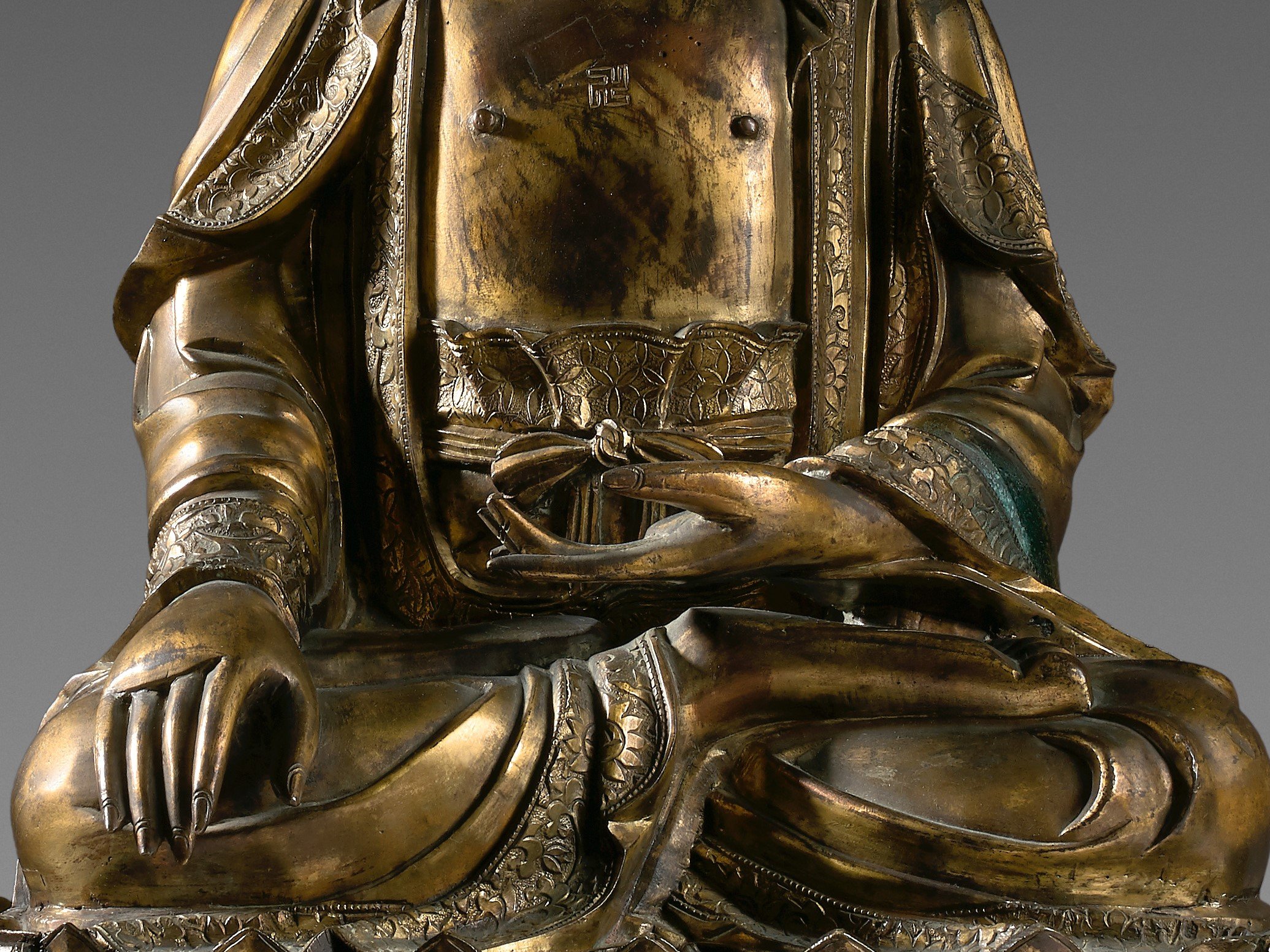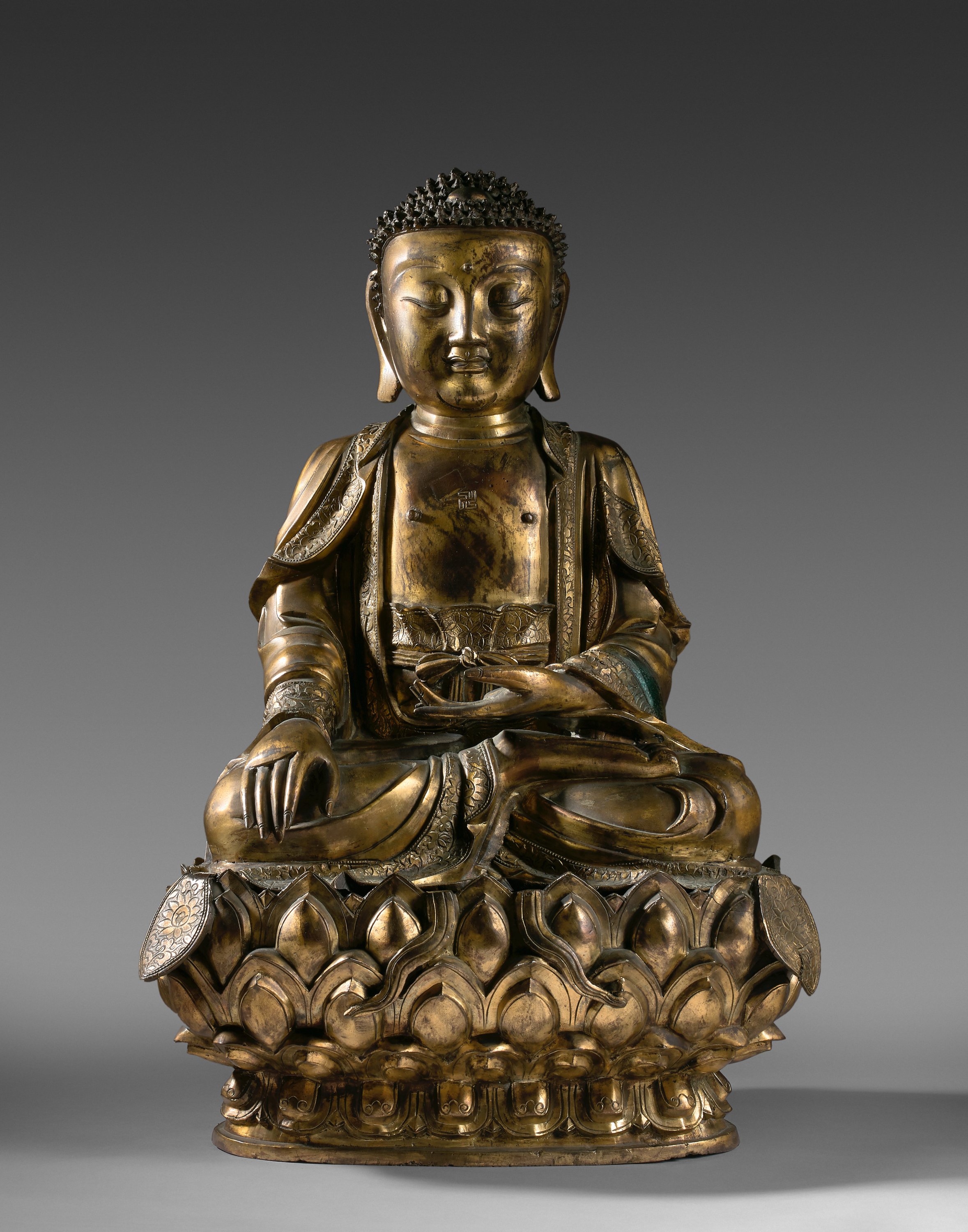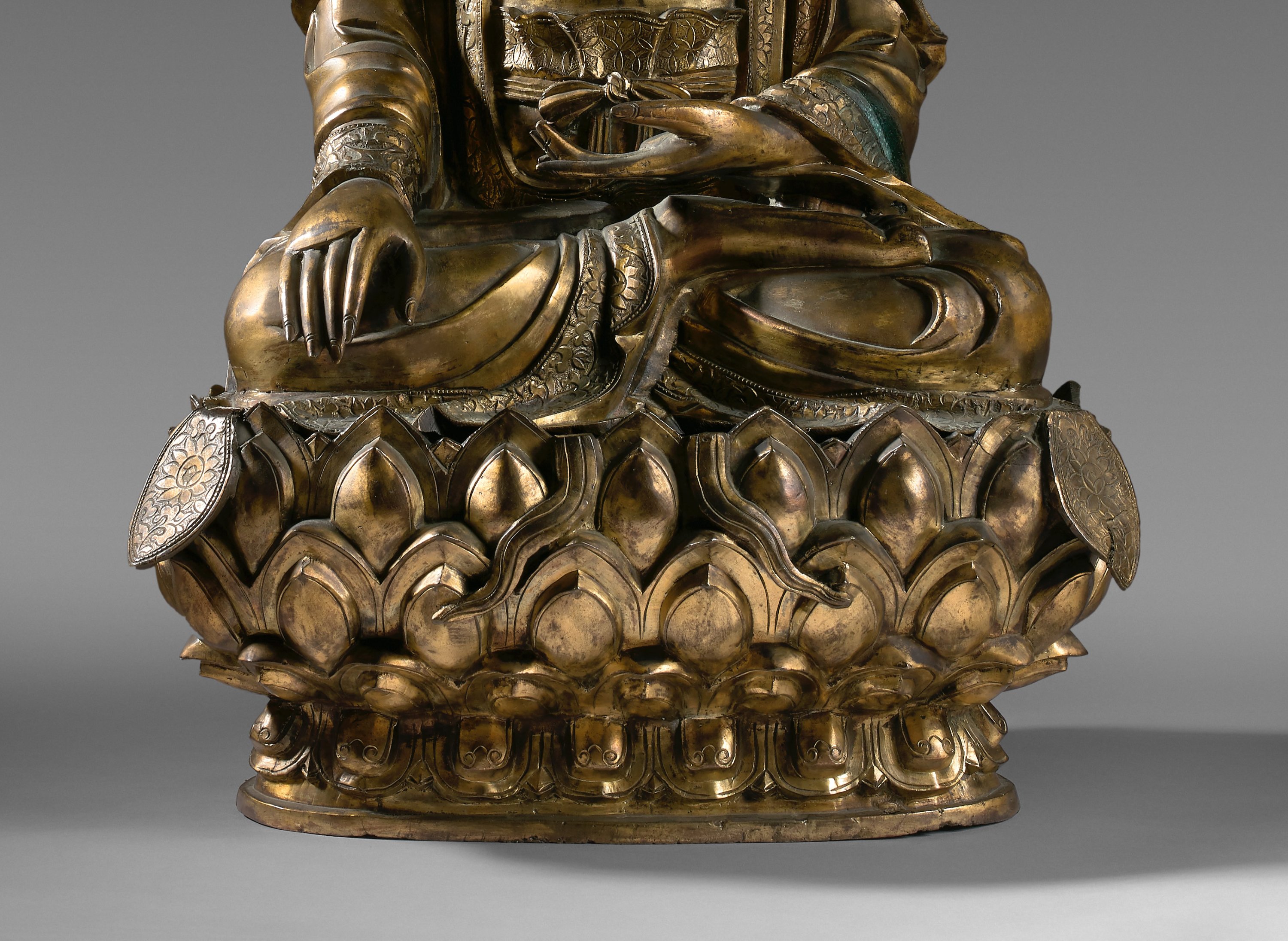 Constitué en deux parties, surélevé sur une base en forme de double lotus, ce bouddha et sa base en bronze doré sont finement ciselés et repoussés. Le visage harmonieux et serein, les yeux entrouverts regardant vers le bas, ils symbolisent la surveillance continuelle du boddhisatva sur l’humanité. Ce type de visage de Bouddha est typique de la dynastie Ming : dodu avec un front et des pommettes larges, un visage rond, de longs lobes d’oreilles charnus, symbole du renoncement à la vie matérielle et de son dévouement à une vie spirituelle, les traits du visage bien proportionnés, le menton surligné, les paupières légèrement baissées surmontées de l’urna, une expression du visage calme et douce, la bouche esquissant un léger sourire, signe de compassion, le cou orné des trois plis de la sagesse, les épaules carrées larges, le buste droit. Il porte un manteau monastique finement plissé épousant les gestes du corps, à décor gravé en bordure de rinceaux de fleurs de lotus, qui laisse apparaitre son buste incisé au niveau du chakra du cœur du svastika, signifiant bonheur et prospérité. Dans le bouddhisme, le svastika symbolise la roue de la loi. En Chine, le svastika, symbolise le chiffre 10 000, reflet de l’infini, représentation de l’éternel qui se révèle dans l’esprit du bouddha. Dans le bouddhisme Chan, courant dominant sous la dynastie Ming, le svastika incarne le « Sceau de l’Esprit de Bouddha », Busshin-In. Les mains et les pieds des statues de Bouddha de la dynastie Ming sont vifs et réalistes, avec des doigts fins et doux. Les orteils sont pleins et de forme hémisphérique. Ici, la plante des pieds est incisée de la roue des enseignements du bouddha, dite « dharmachakra », « la roue du changement ». Elle se réfère à la transformation soudaine et immédiate spirituelle déclenchée par les enseignements du bouddha à travers les quatre vérités, le noble sentier octuple et la voie du milieu.