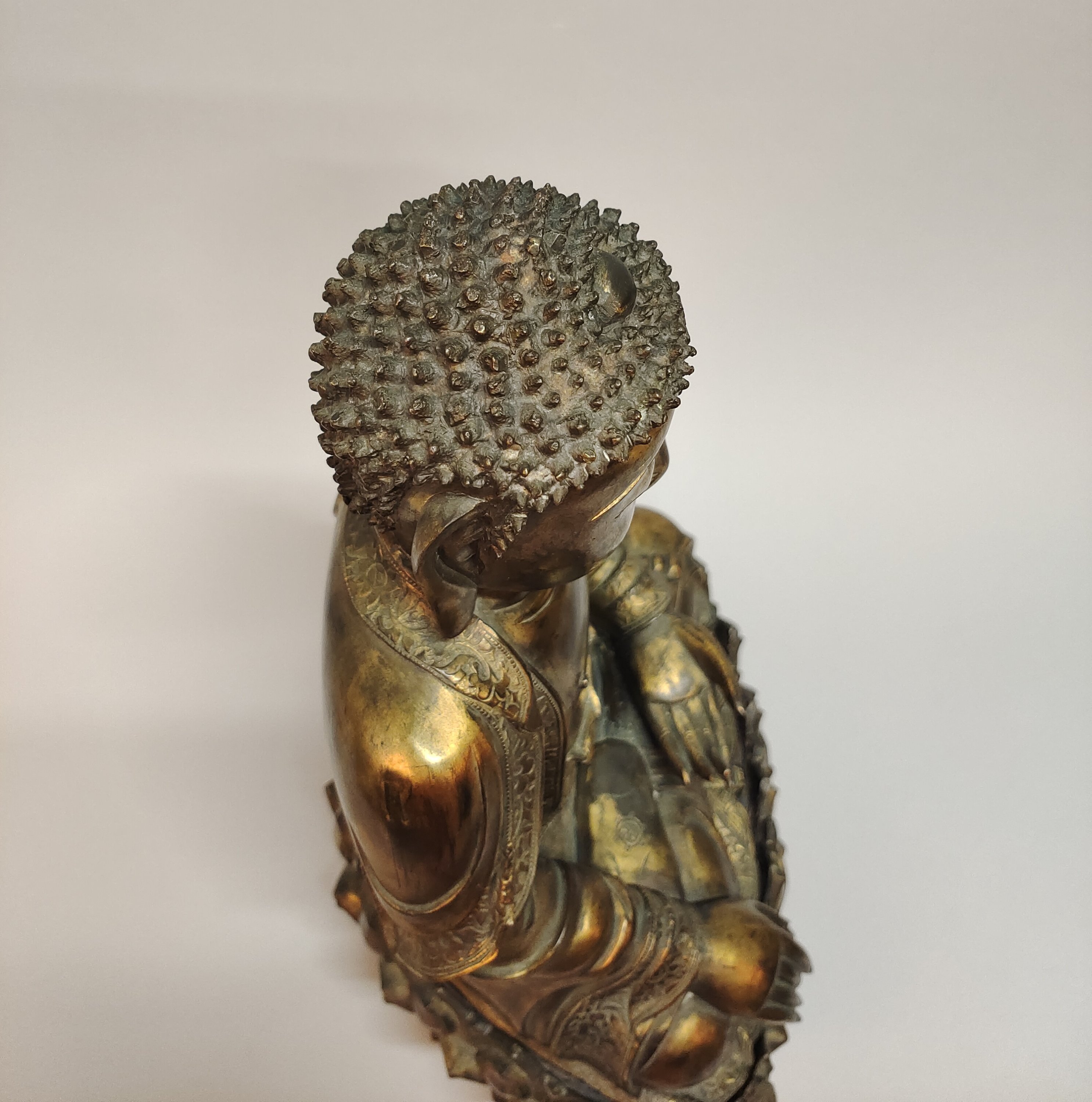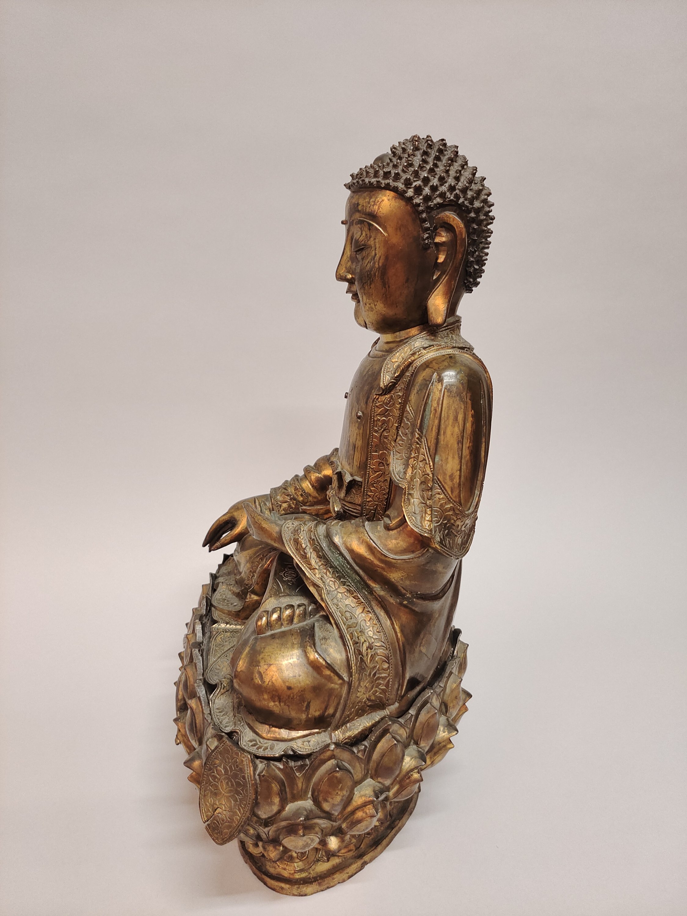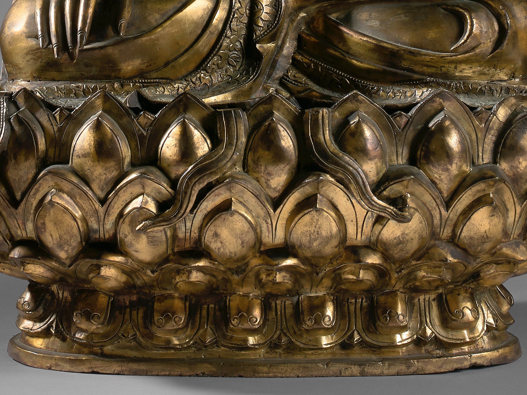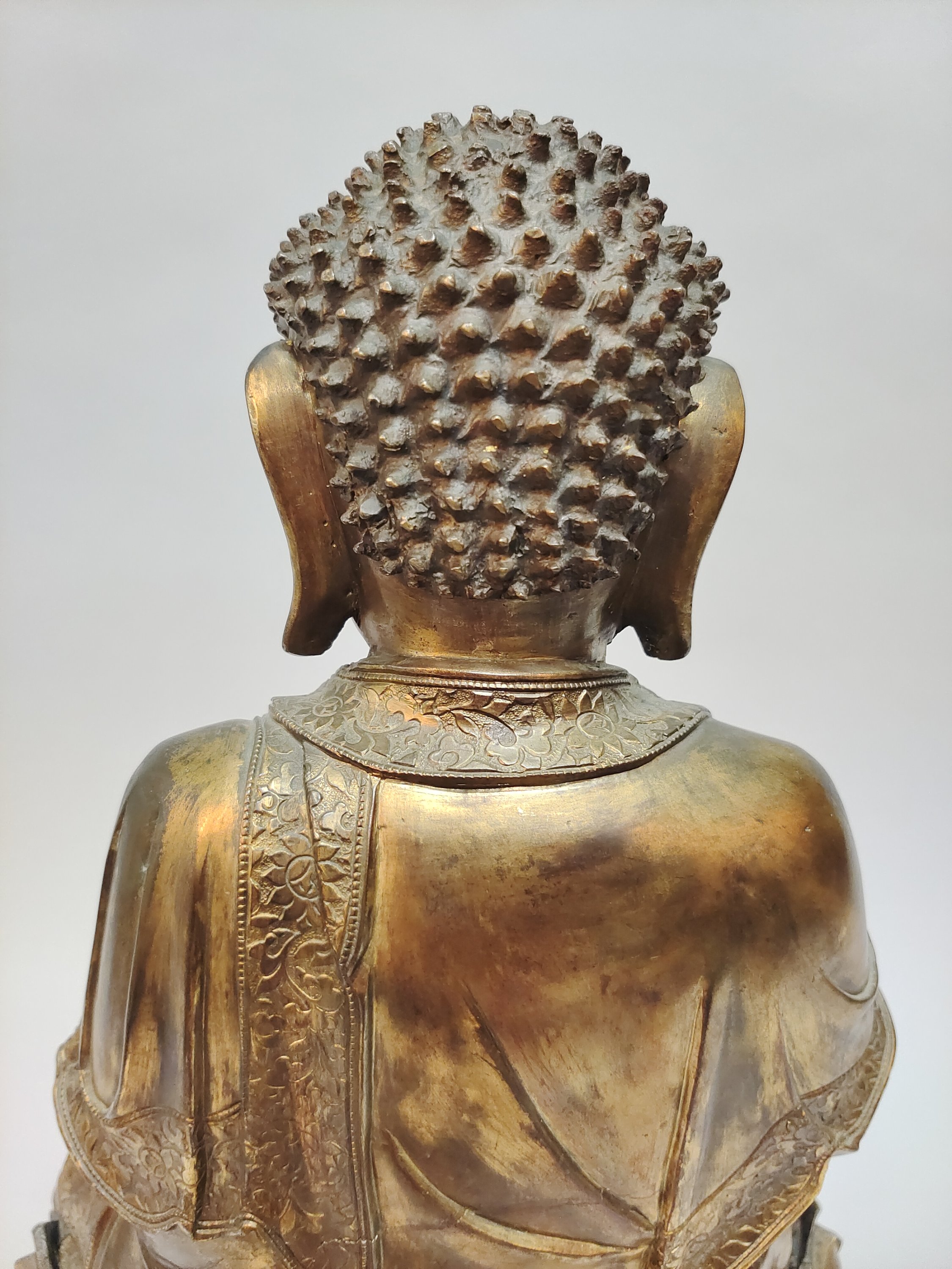 en bronze doré, assis en padmasana, position du lotus, sur un socle en forme de fleur de lotus, la main droite en bhumisparsa mudra, geste de la prise de la terre à témoin, la main gauche en dhyana mudra, geste de méditation. Vêtu d’une robe finement ciselée couvrant les deux épaules, à décor de bandes de frise de lotus dans leurs rinceaux gravés le long de l’ourlet, le visage serein, esquissant un léger sourire, les yeux entrouverts surmontés de l'urna, les cheveux relevés en chignon agrémentés de l'ushnisha, protubérance crânienne, les trois plis de la sagesse au cou, une swastika incisée sur le chakra du cœur sur sa poitrine à nue, le dharmachakra, roue de la loi, gravée sous chaque plante de pied.