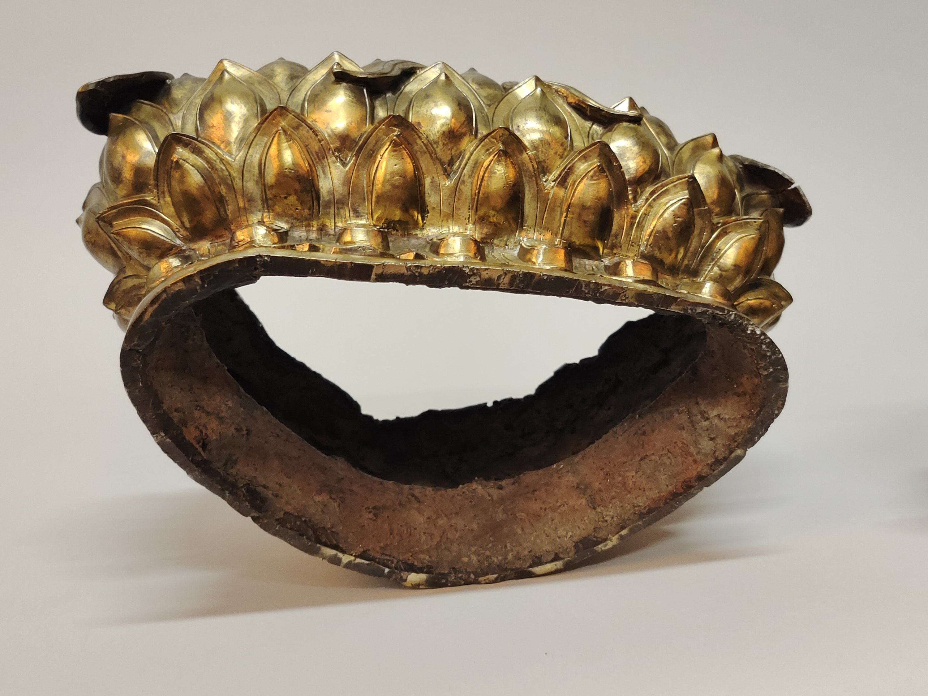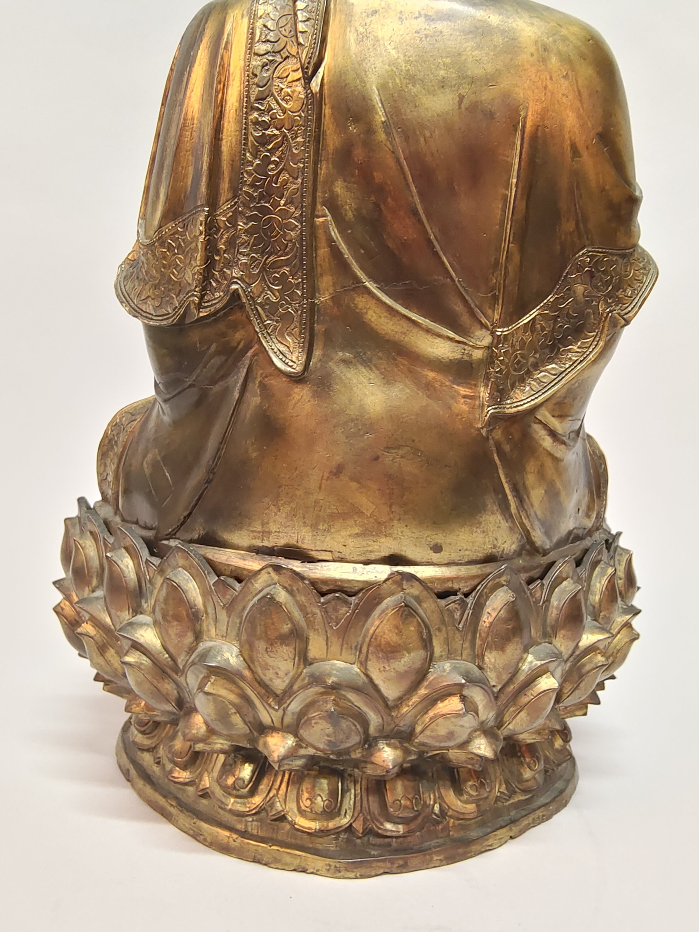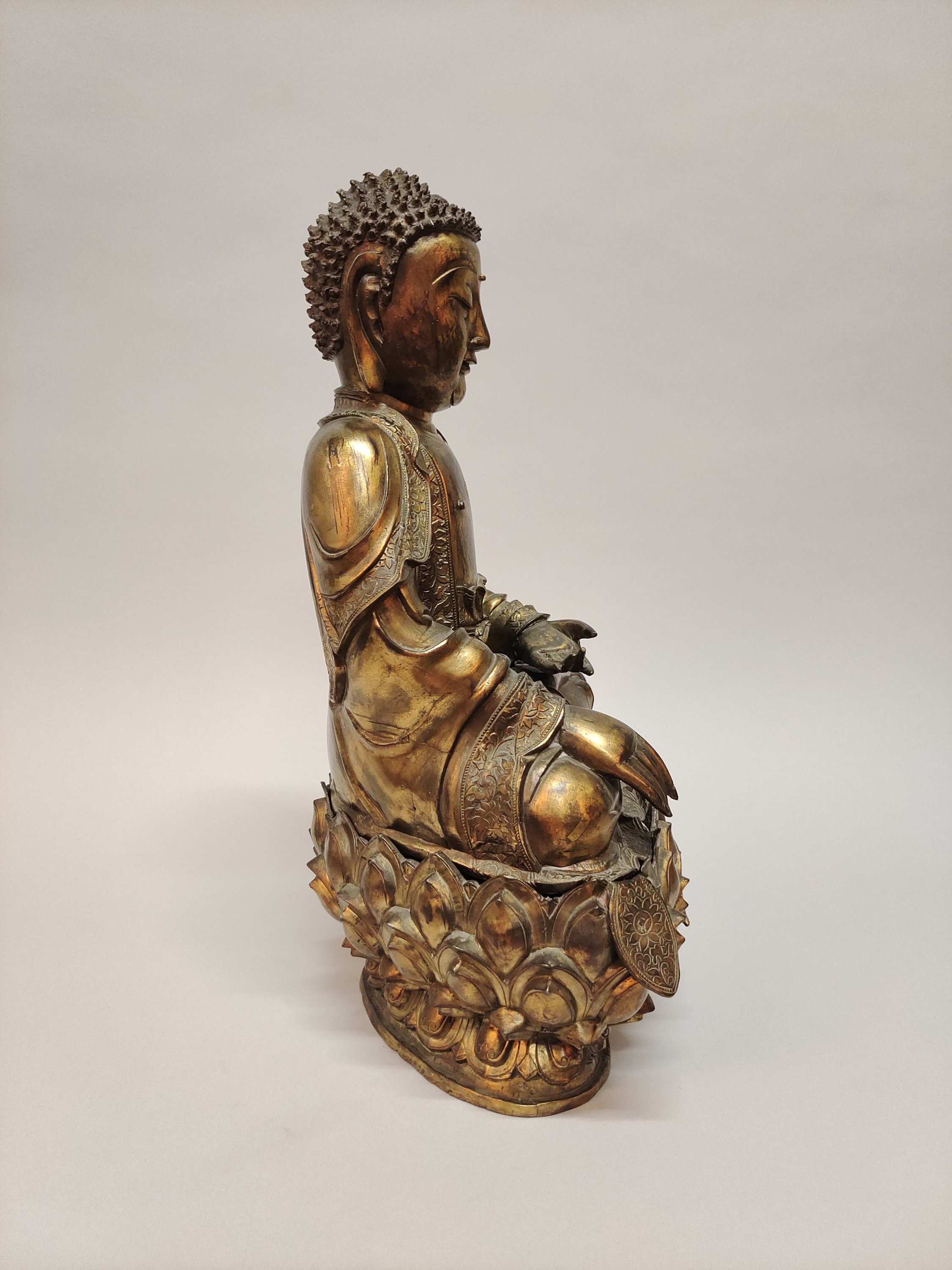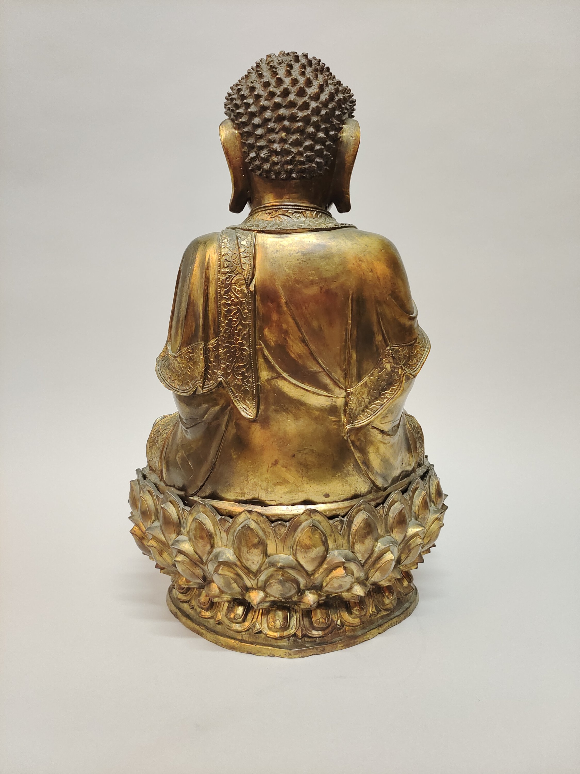 en bronze doré, assis en padmasana, position du lotus, sur un socle en forme de fleur de lotus, la main droite en bhumisparsa mudra, geste de la prise de la terre à témoin, la main gauche en dhyana mudra, geste de méditation. Vêtu d’une robe finement ciselée couvrant les deux épaules, à décor de bandes de frise de lotus dans leurs rinceaux gravés le long de l’ourlet, le visage serein, esquissant un léger sourire, les yeux entrouverts surmontés de l'urna, les cheveux relevés en chignon agrémentés de l'ushnisha, protubérance crânienne, les trois plis de la sagesse au cou, une swastika incisée sur le chakra du cœur sur sa poitrine à nue, le dharmachakra, roue de la loi, gravée sous chaque plante de pied.