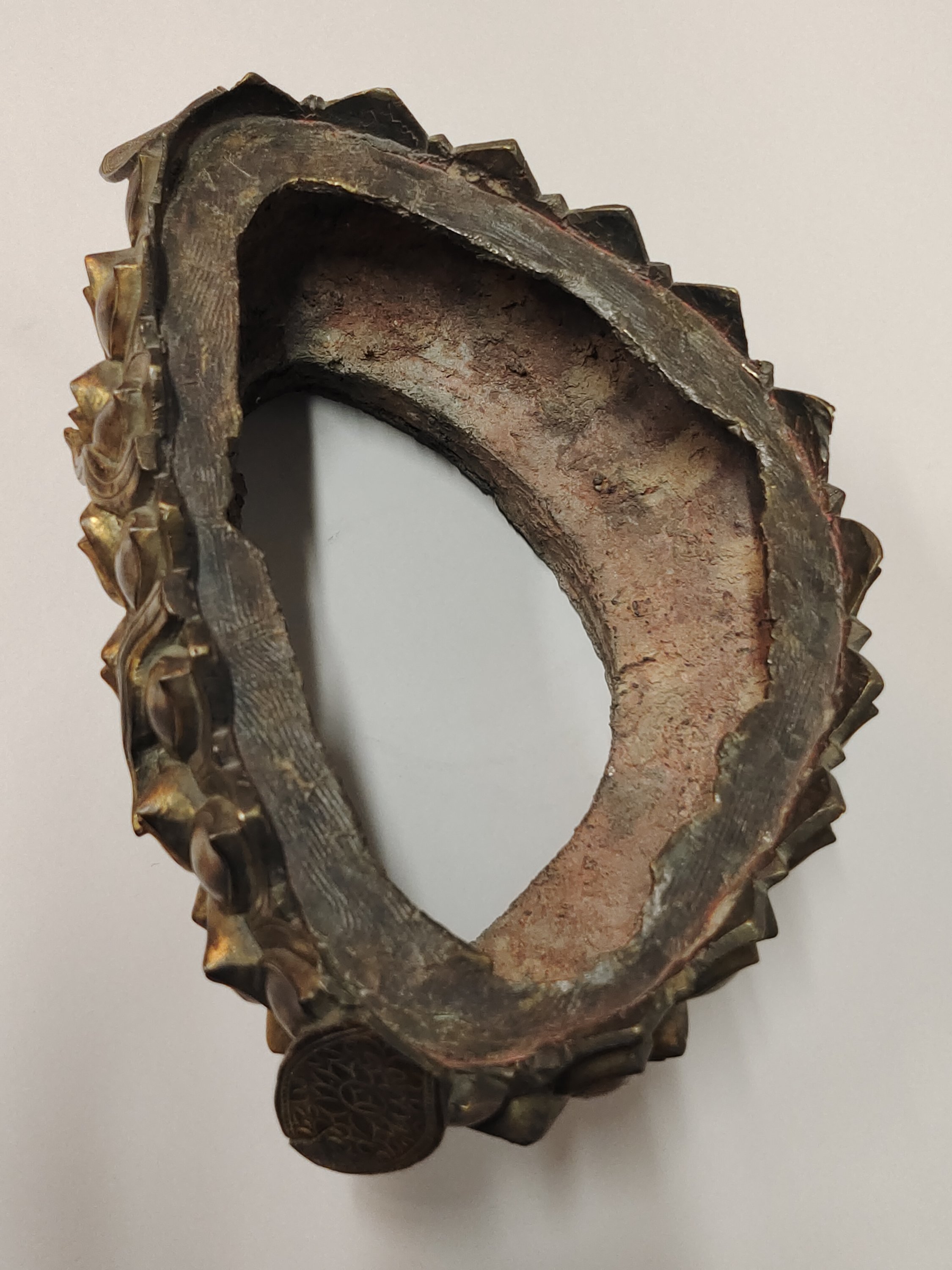 La forme iconographique de ce bronze, du bouddha historique assis faisant le geste de la main droite de prise de la terre à témoin, en bhumisparsa mudra, corrobore à l’épisode de sa vie, où assis sous l’arbre de pipal en méditation, il triomphe juste avant son illumination sur Mara, le démon tentateur:
