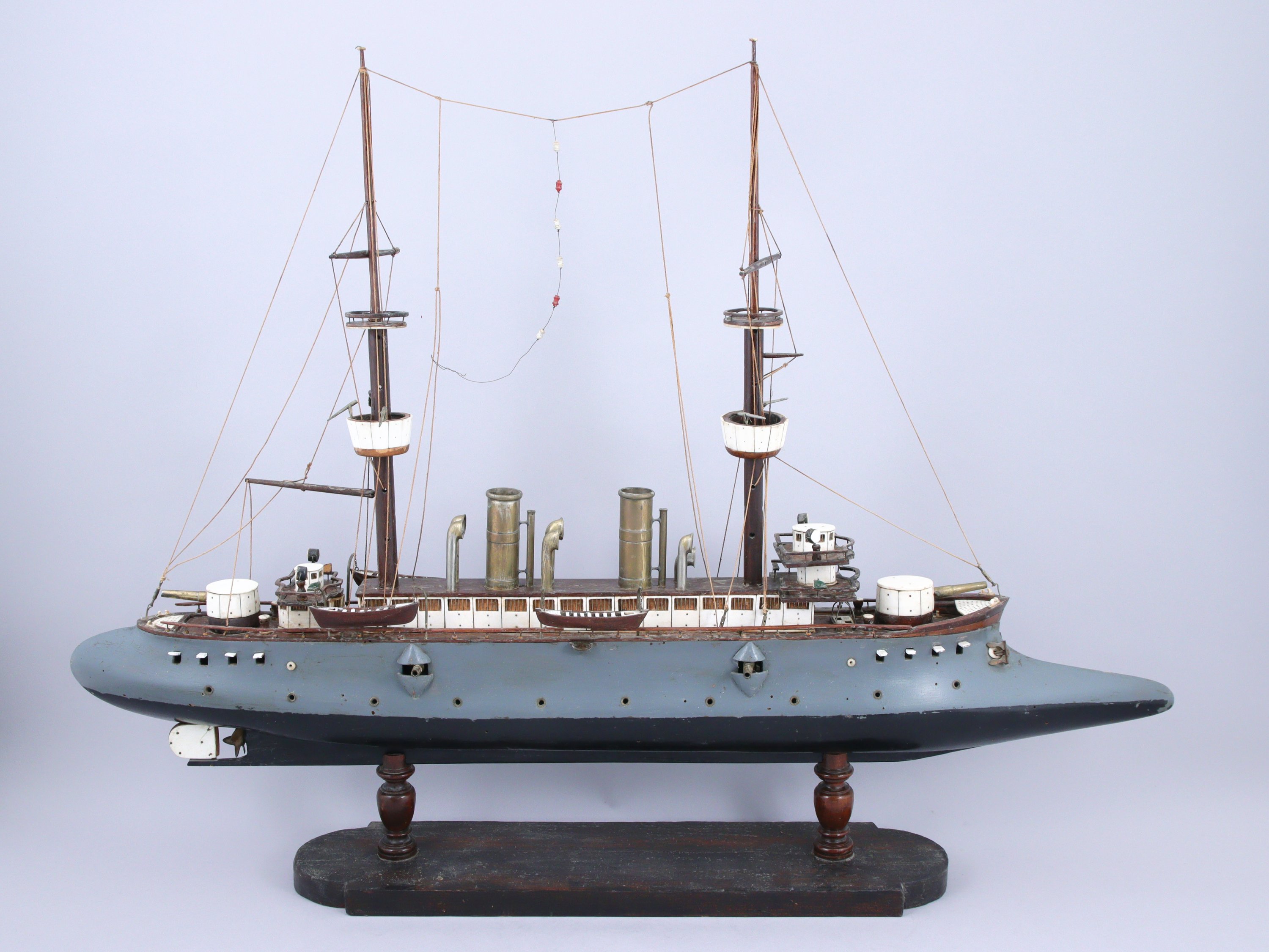 Pourvu d'un long éperon et deux mâts, le navire présente deux grandes cheminées et six petites à l'extrémité courbée. Le bateau est armé de différents calibres, dont les plus petits en haut des vigies, les plus gros sur les tourelles de proue et poupe. La maquette repose sur un socle en bois surélevé de deux colonnes balustres.