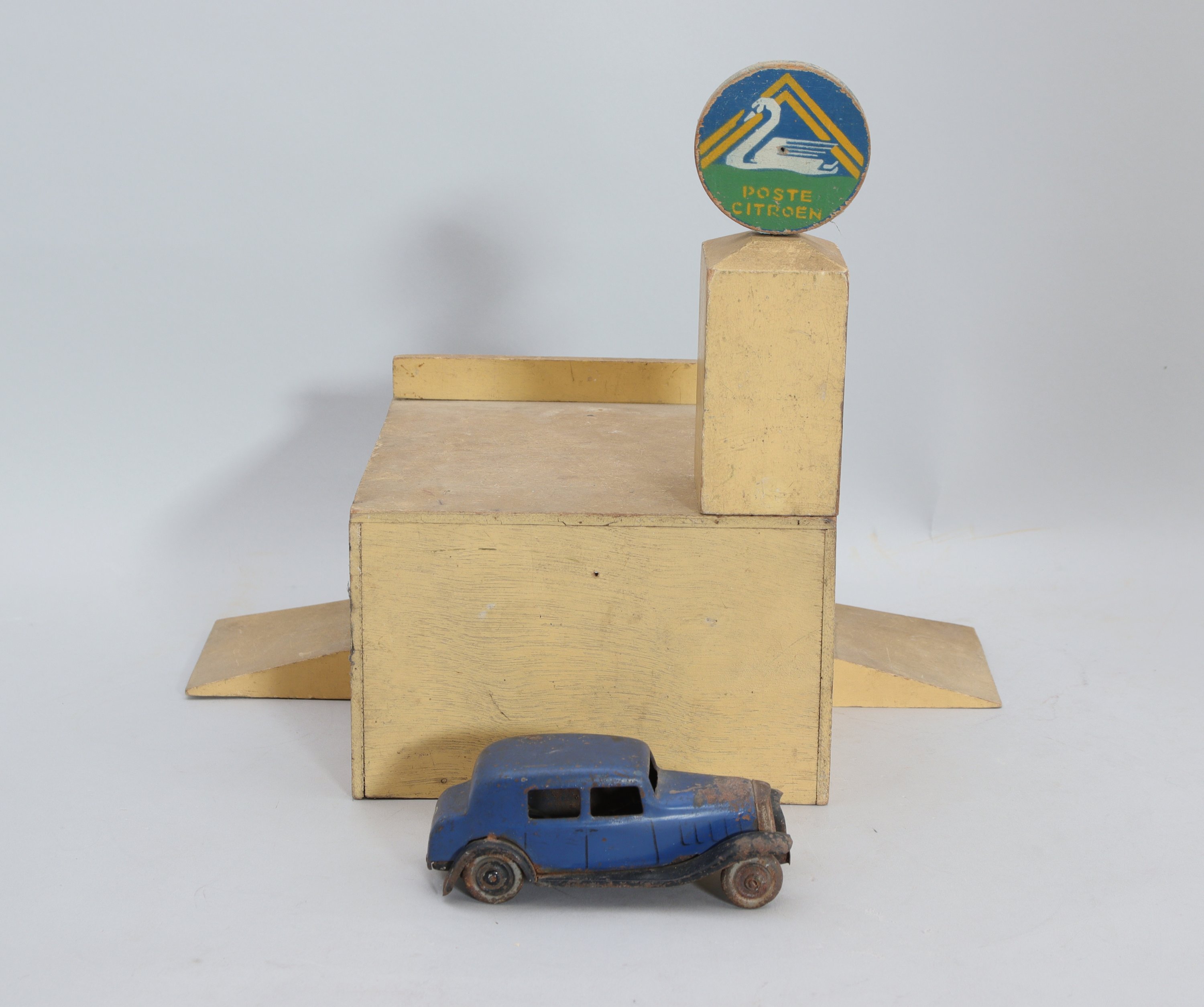 C.I.J. POSTE GARAGE CITROËN en bois peint avec son enseigne ronde au cygne, ses deux pompes à essence et un pont.