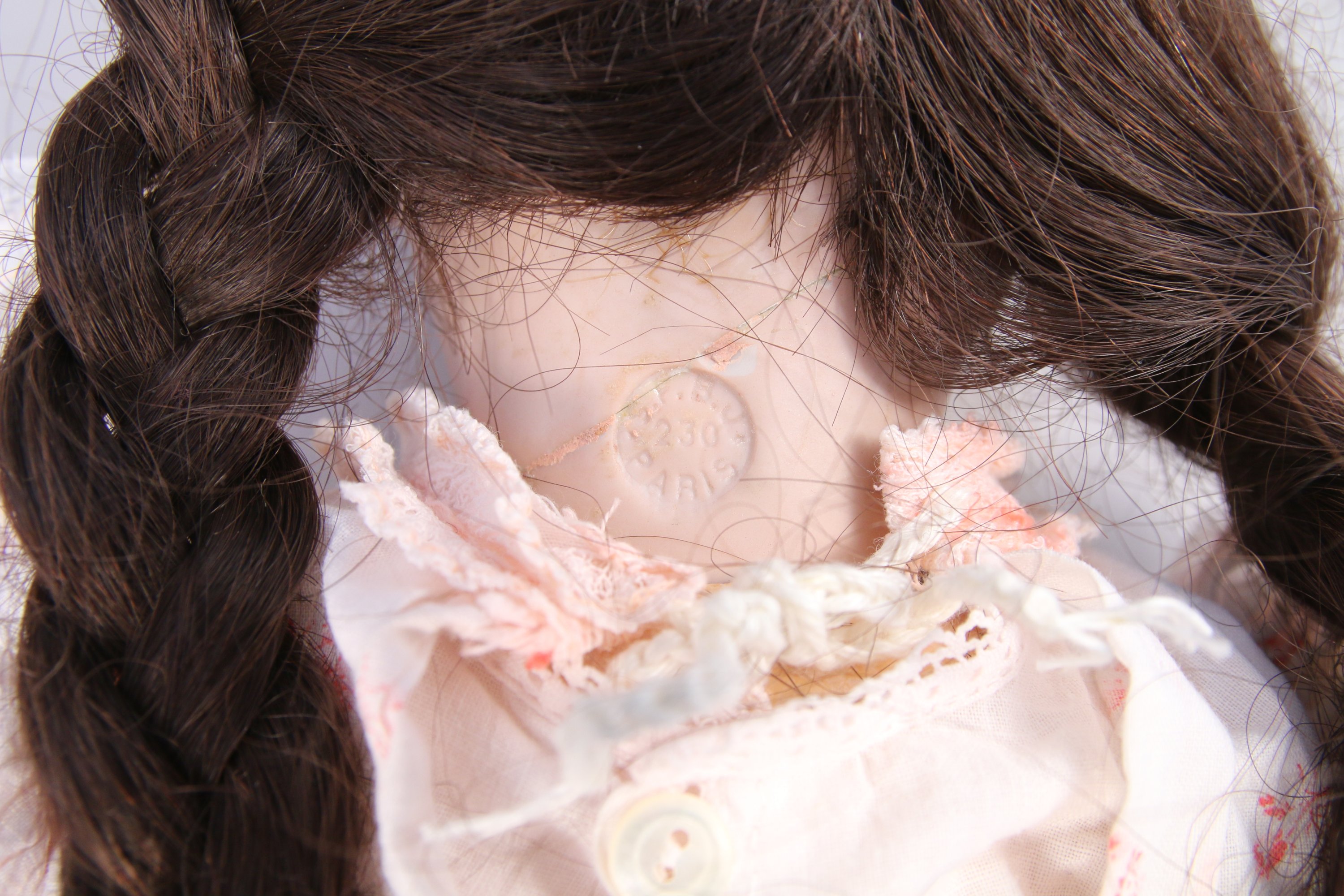 SFBJ. Paris. POUPÉE modèle 230, taille 10. La tête en porcelaine, les yeux bleus mobiles, la bouche ouverte, les oreilles percées. La perruque aux cheveux bruns. Habillée d'une robe rose à motif floral. Corps tout articulé en composition.