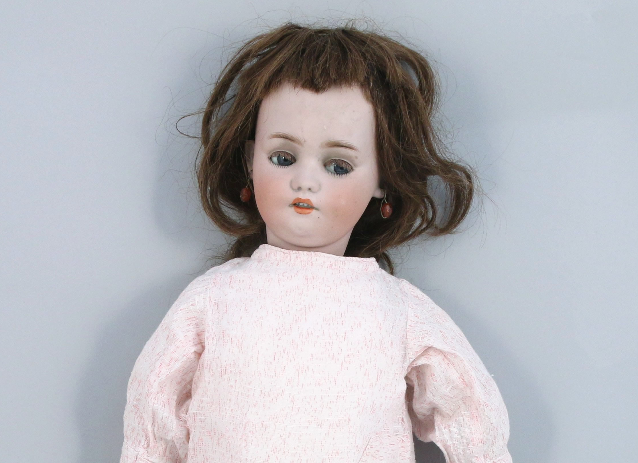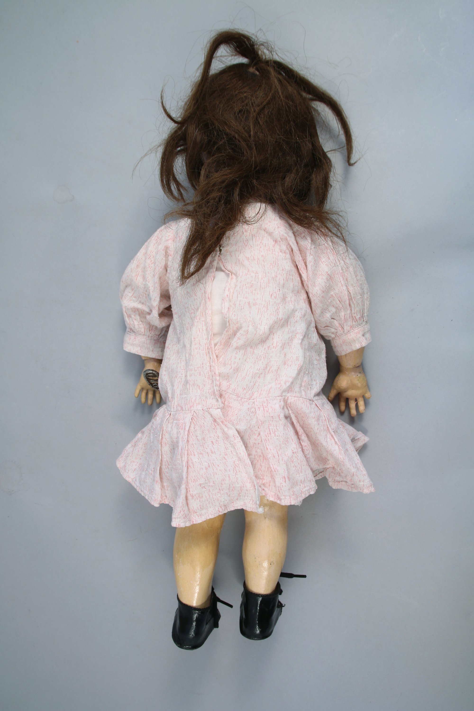 ROULLET-DECAMP. POUPÉE mécanique marcheuse et parlante. Tête en porcelaine Simon et Halbig, les yeux bleus riboulants, la bouche ouverte, les oreilles percées, corps semi articulé contenant le mécanisme avec clé RB. Taille 10. Elle avance les jambes lorsqu'on la pose à terre. Mécanisme vocal se déclenchant.