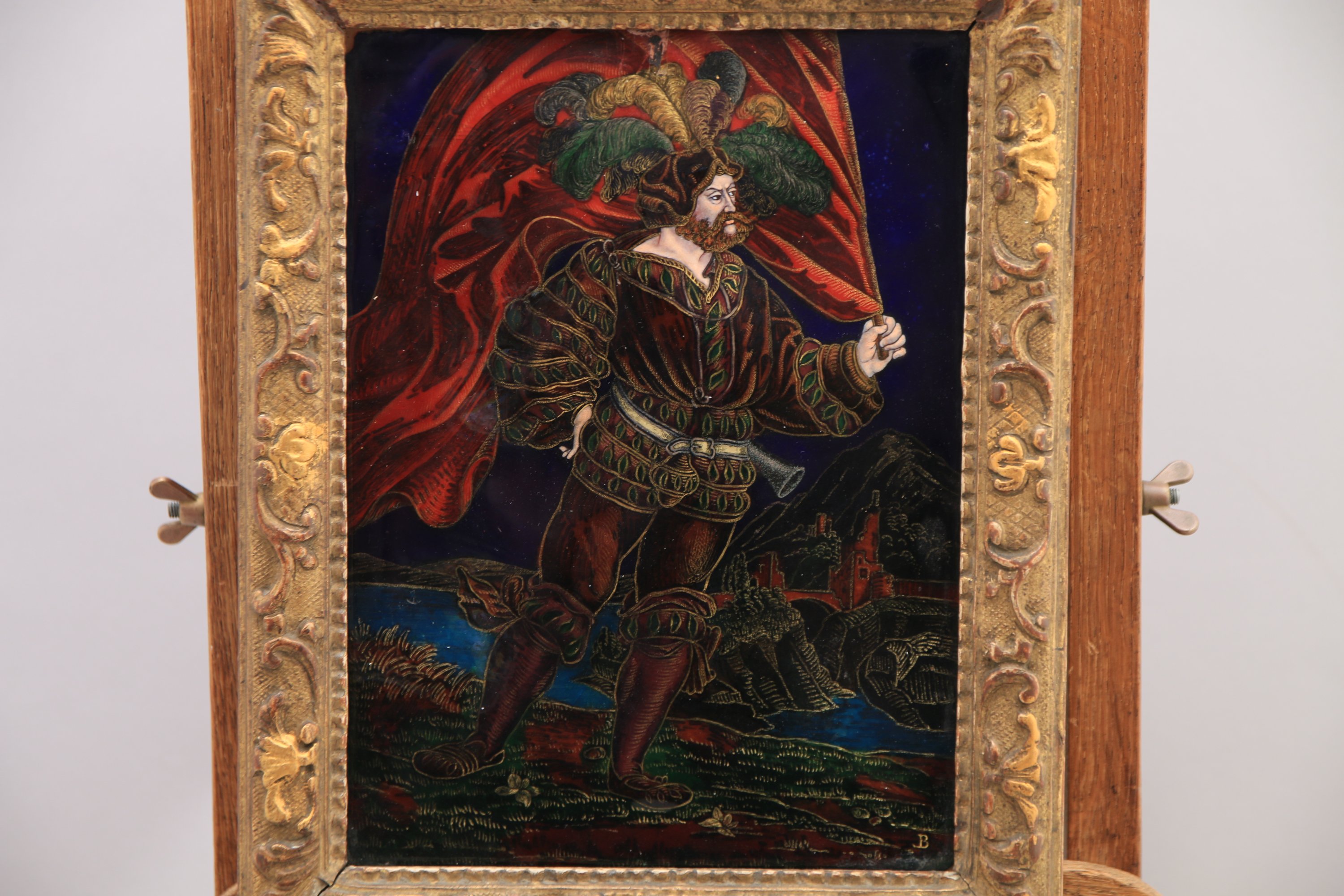 Louis BOUDERY (1859-1901) probablement, PLAQUE EN ÉMAIL PEINT POLYCHROME représentant un homme barbu en costume Renaissance tenant un étendard sur fond de paysage. Monogrammée B. Contre-émail bleu nuit.