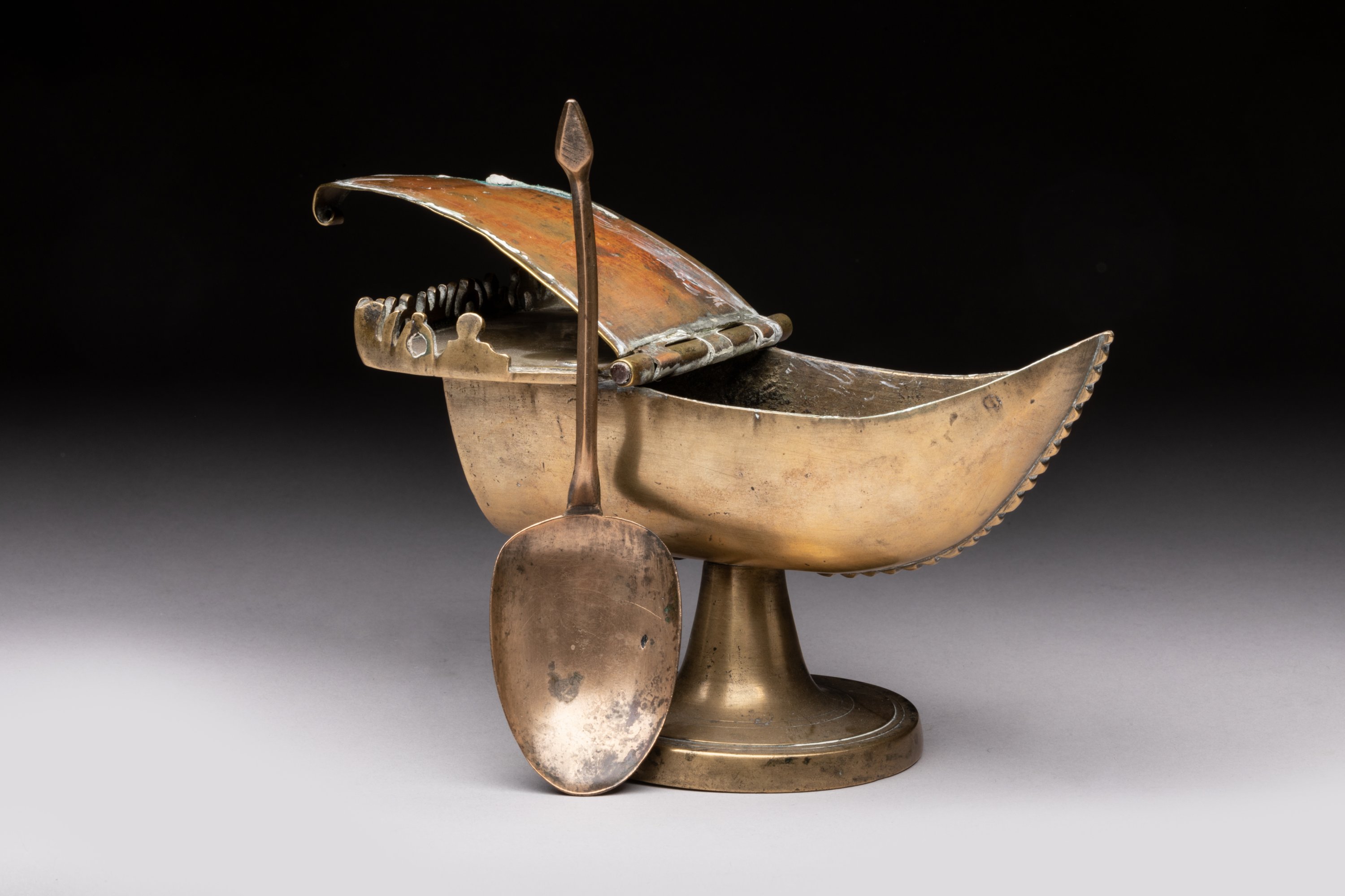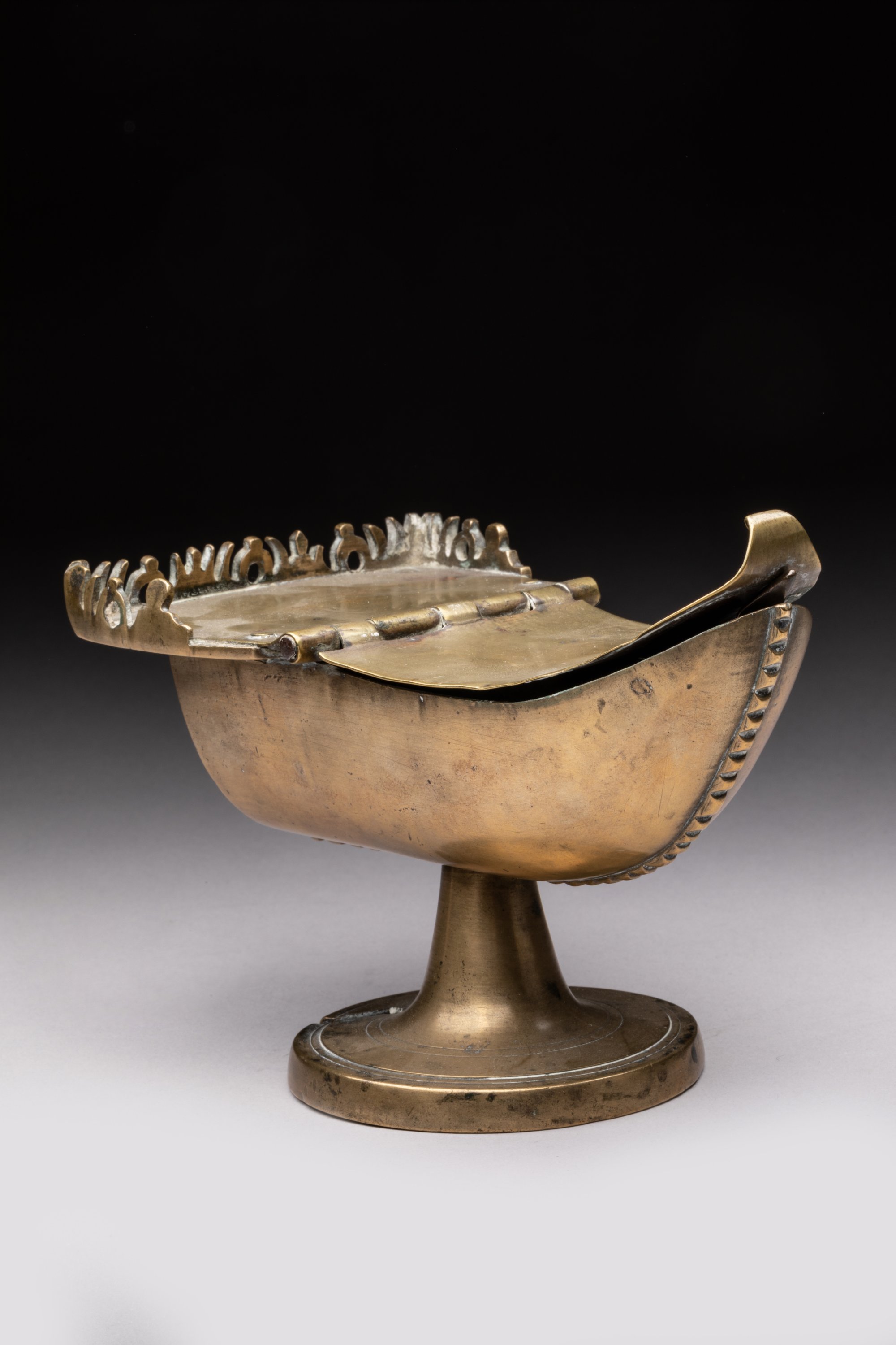 NAVETTE à ENCENS en laiton, en forme de nef à l'antique sur piédouche.