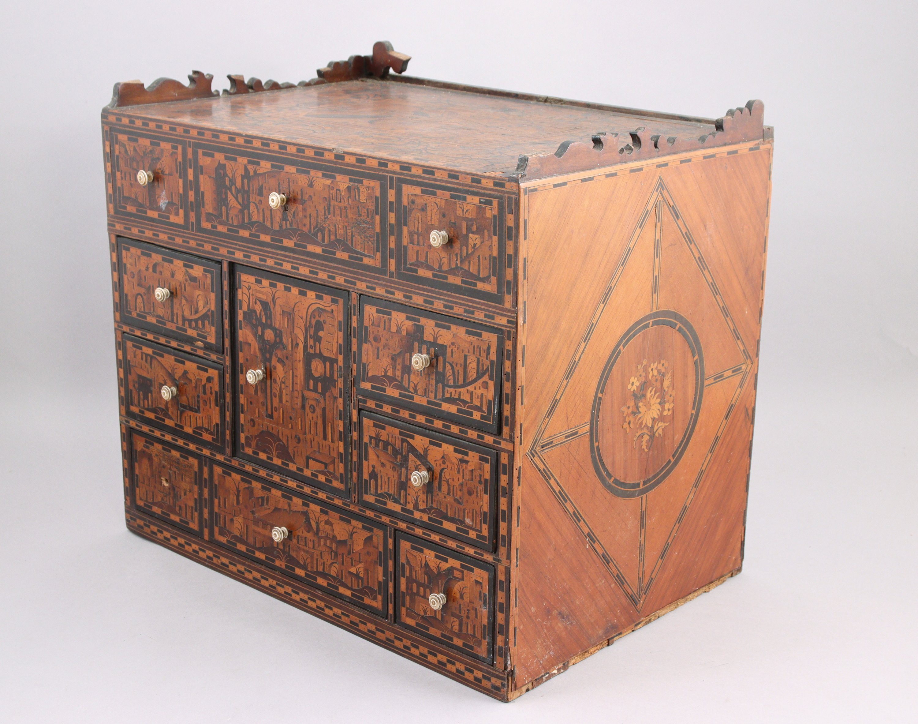 PETIT CABINET en marqueterie ouvrant par six tiroirs et une porte centrale flanquée de deux piles supportant une arcature. La marqueterie de bois clair et sombre à motifs d'architectures, de ruines et de feuillages. Les côtés développent un décor floral inscrit dans des frises géométriques.