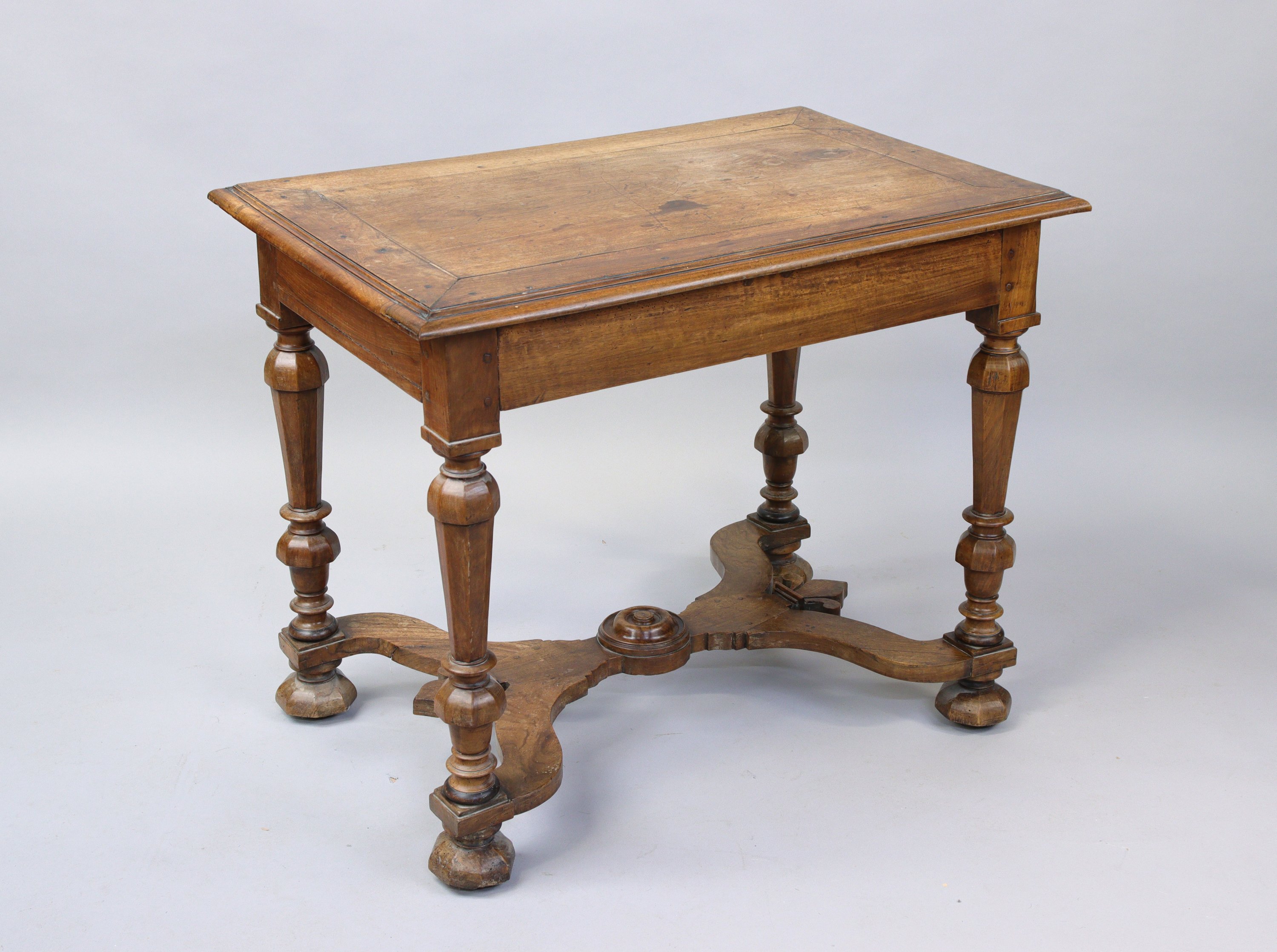 ouvrant par un tiroir et reposant sur quatre pieds de forme balustre reliés par une entretoise en H, se terminant par des pieds en boules aplaties.