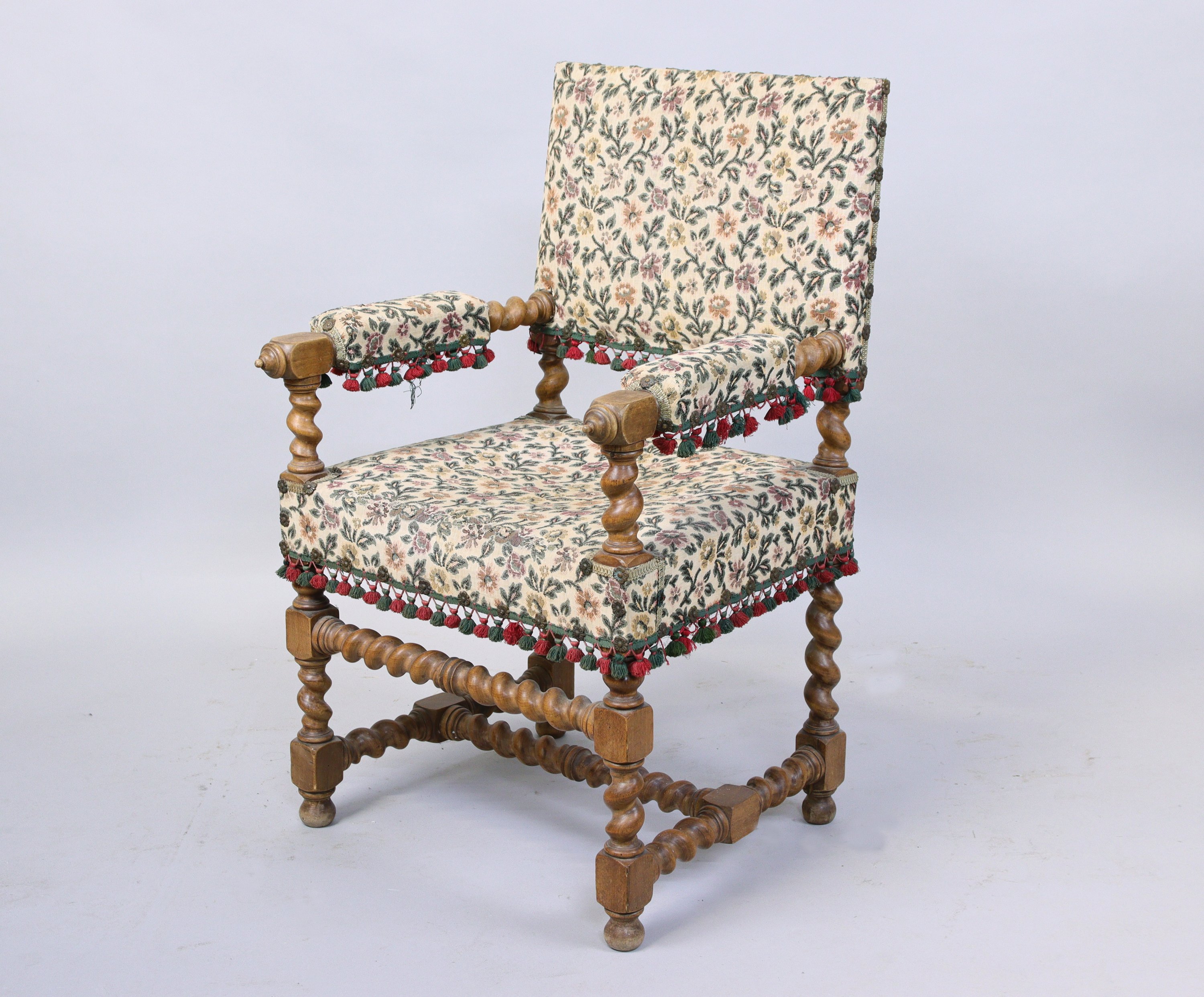 Accompagné d'un FAUTEUIL en bois tourné, dossier droit et accotoirs en tapisserie au point de Hongrie.