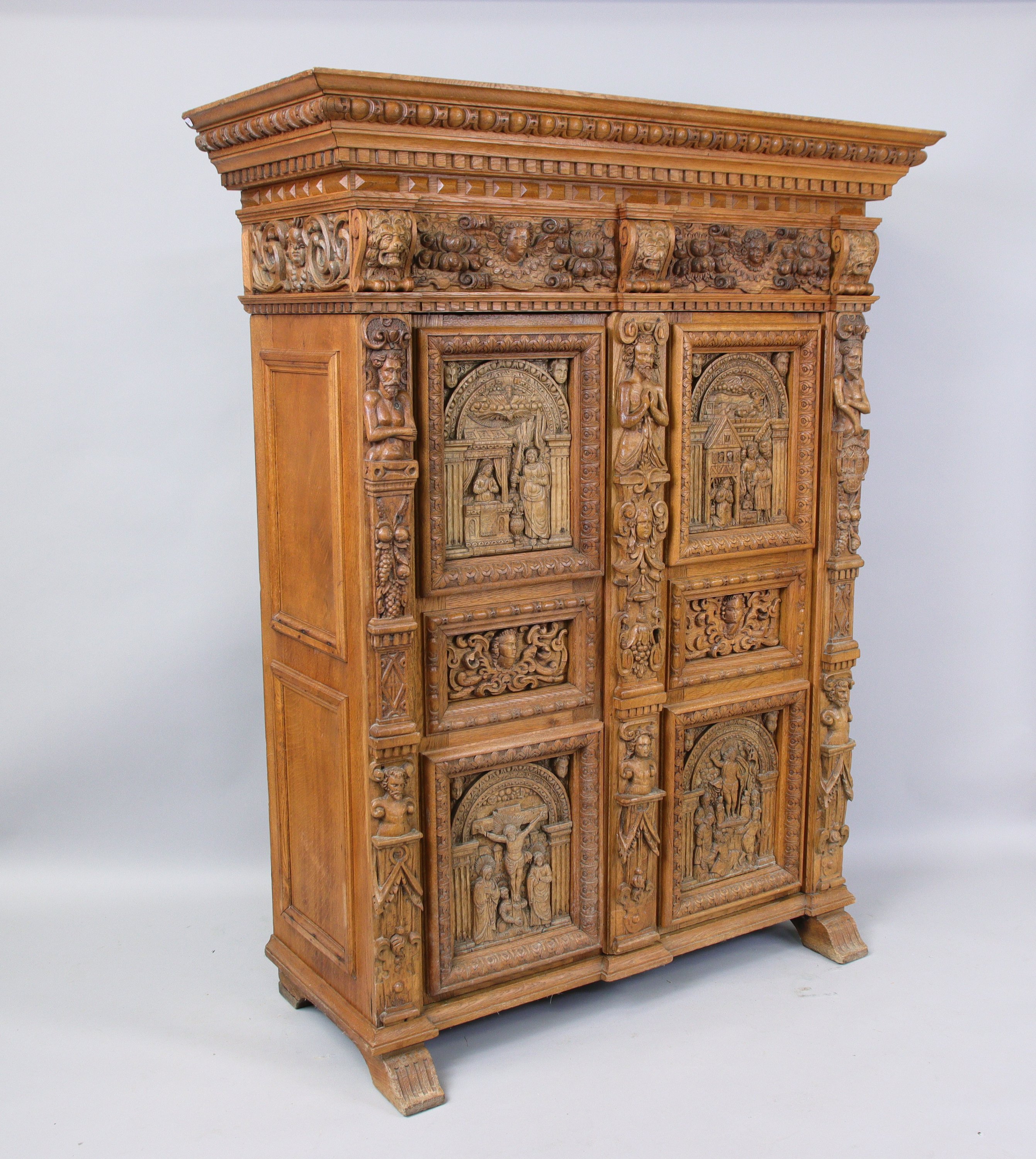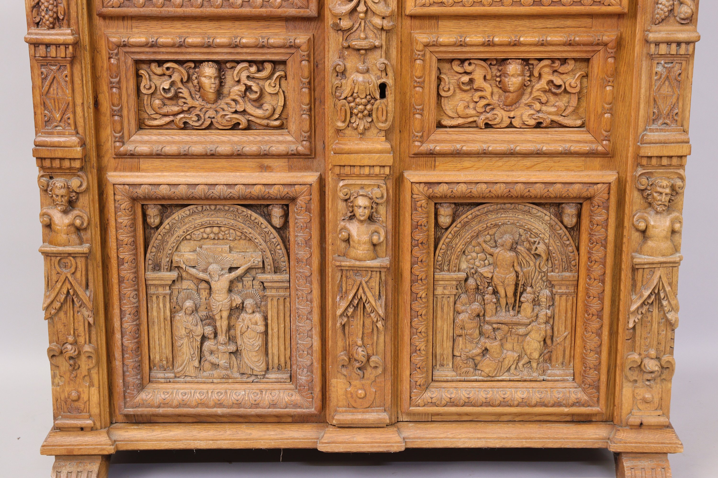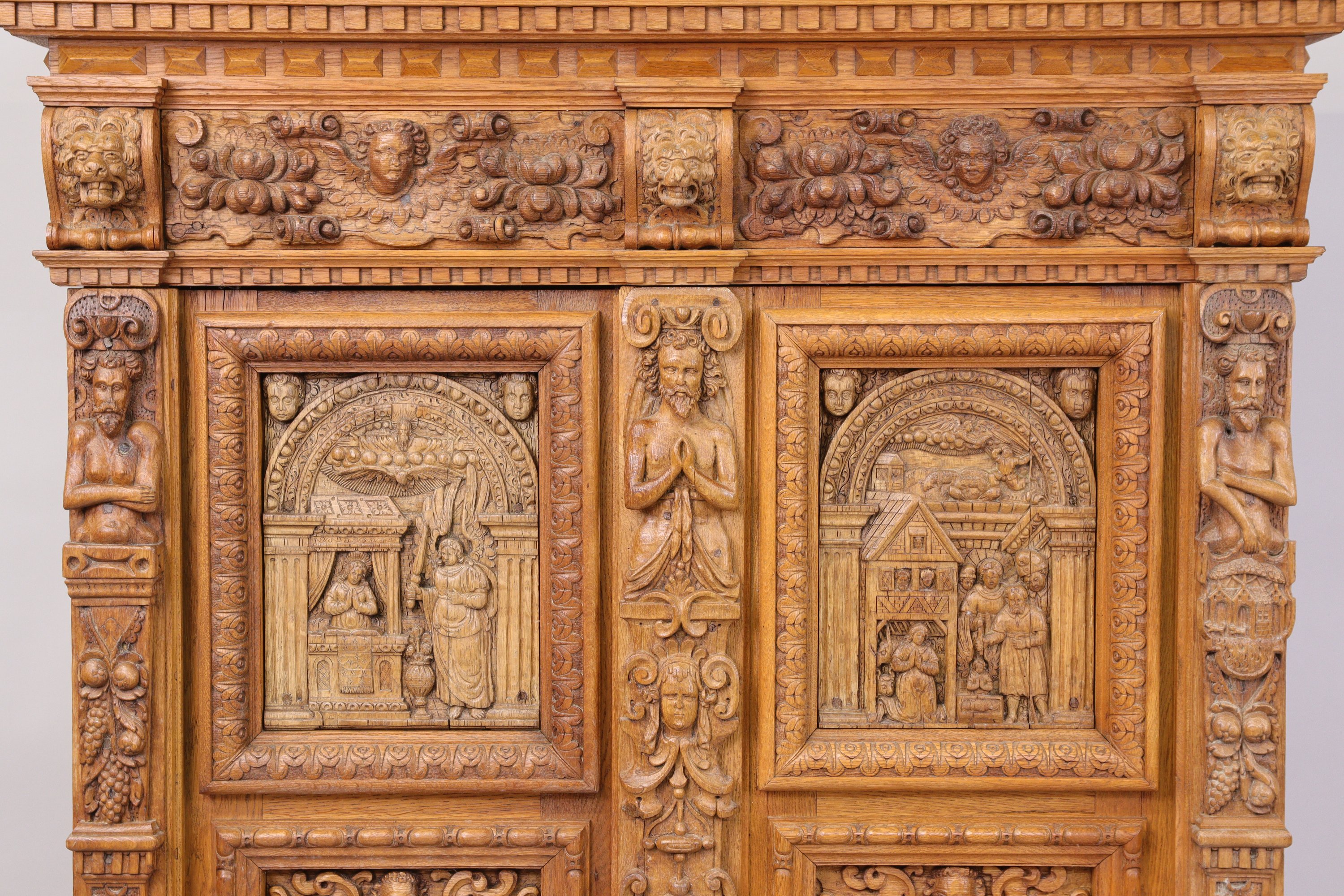 ARMOIRE en chêne sculpté en haut-relief de forme rectangulaire ouvrant à deux vantaux composés de six panneaux dont quatre sont à décor de scènes du Nouveau Testament : l'Annonciation, l'Adoration des bergers, la Crucifixion et la Résurrection, intercalés par trois montants en atlantes en deux registres et grappes de fruits. Large corniche à bandeau ornée de têtes danges entre des fruits, centrées entre trois consoles à têtes de lion stylisées et soulignées dun rang de denticules surmonté doves.