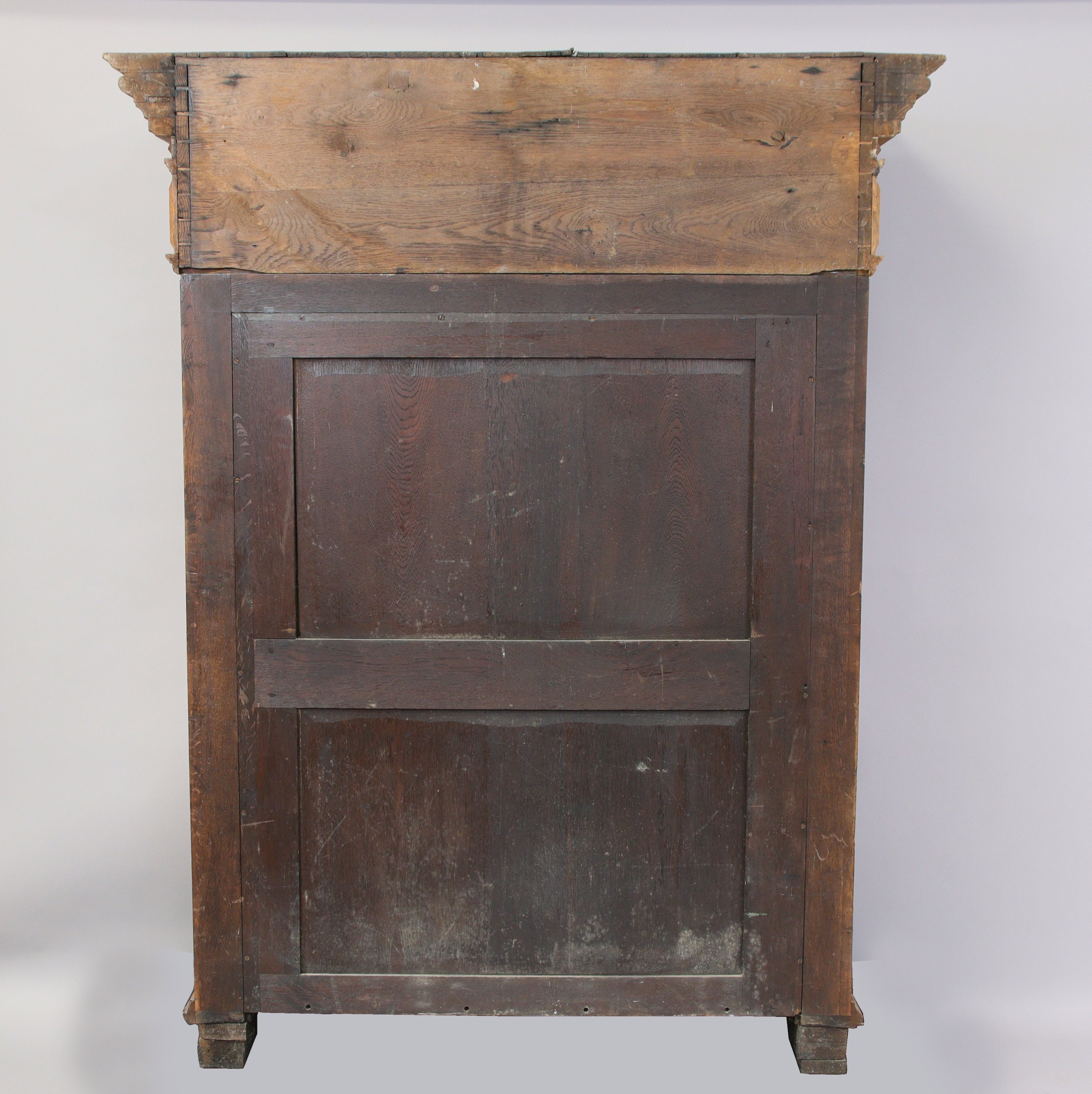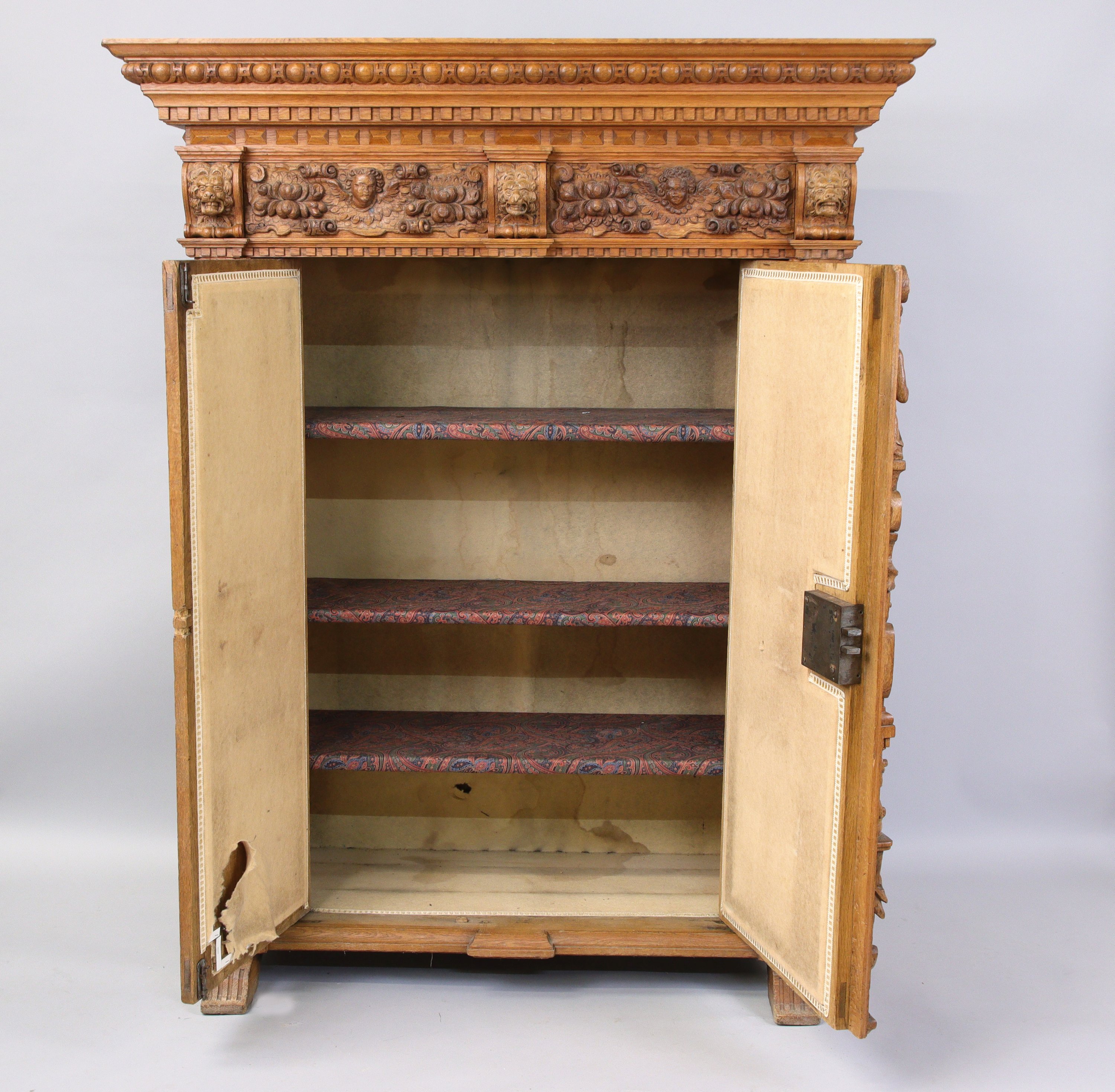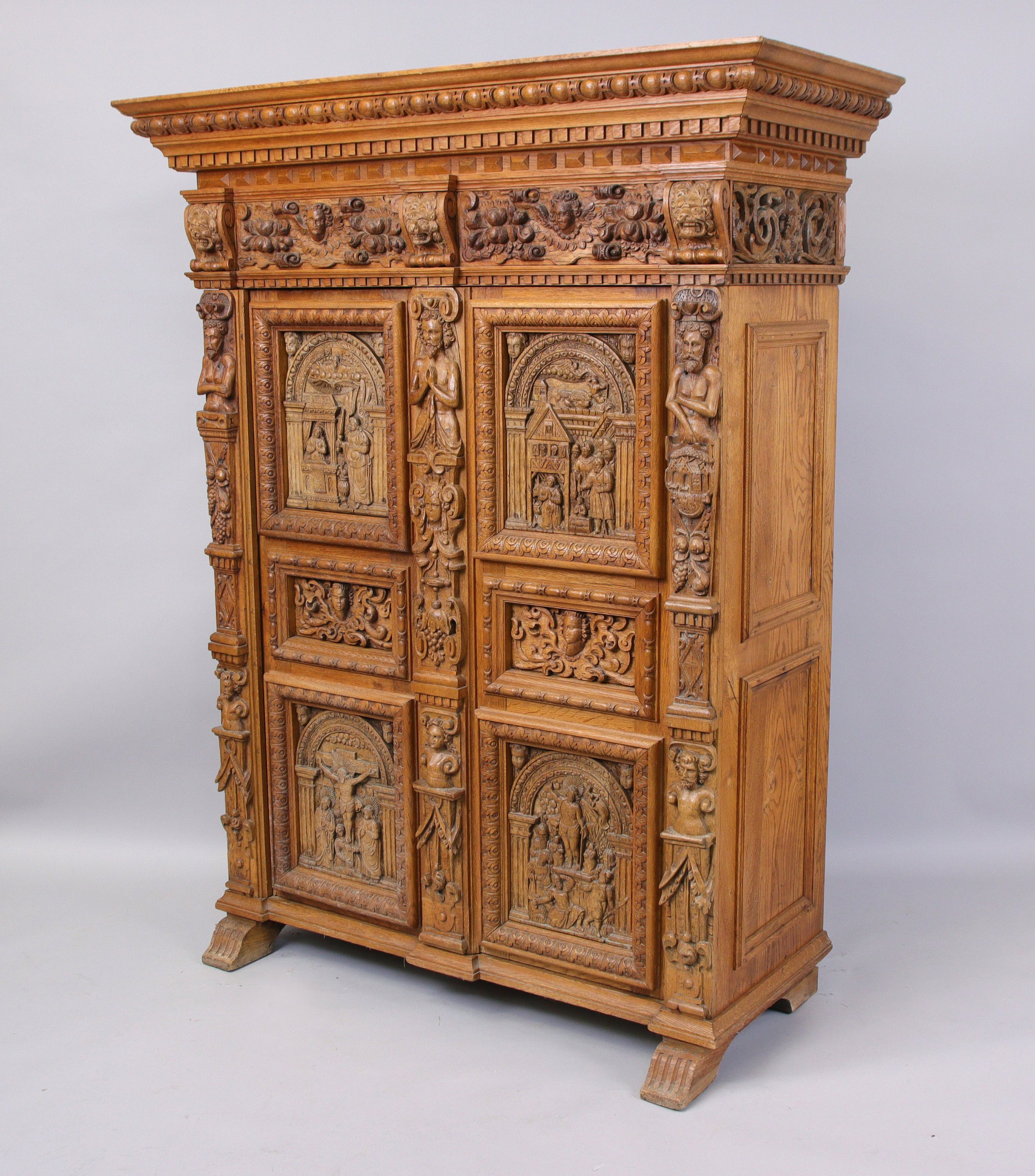 ARMOIRE en chêne sculpté en haut-relief de forme rectangulaire ouvrant à deux vantaux composés de six panneaux dont quatre sont à décor de scènes du Nouveau Testament : l'Annonciation, l'Adoration des bergers, la Crucifixion et la Résurrection, intercalés par trois montants en atlantes en deux registres et grappes de fruits. Large corniche à bandeau ornée de têtes danges entre des fruits, centrées entre trois consoles à têtes de lion stylisées et soulignées dun rang de denticules surmonté doves.