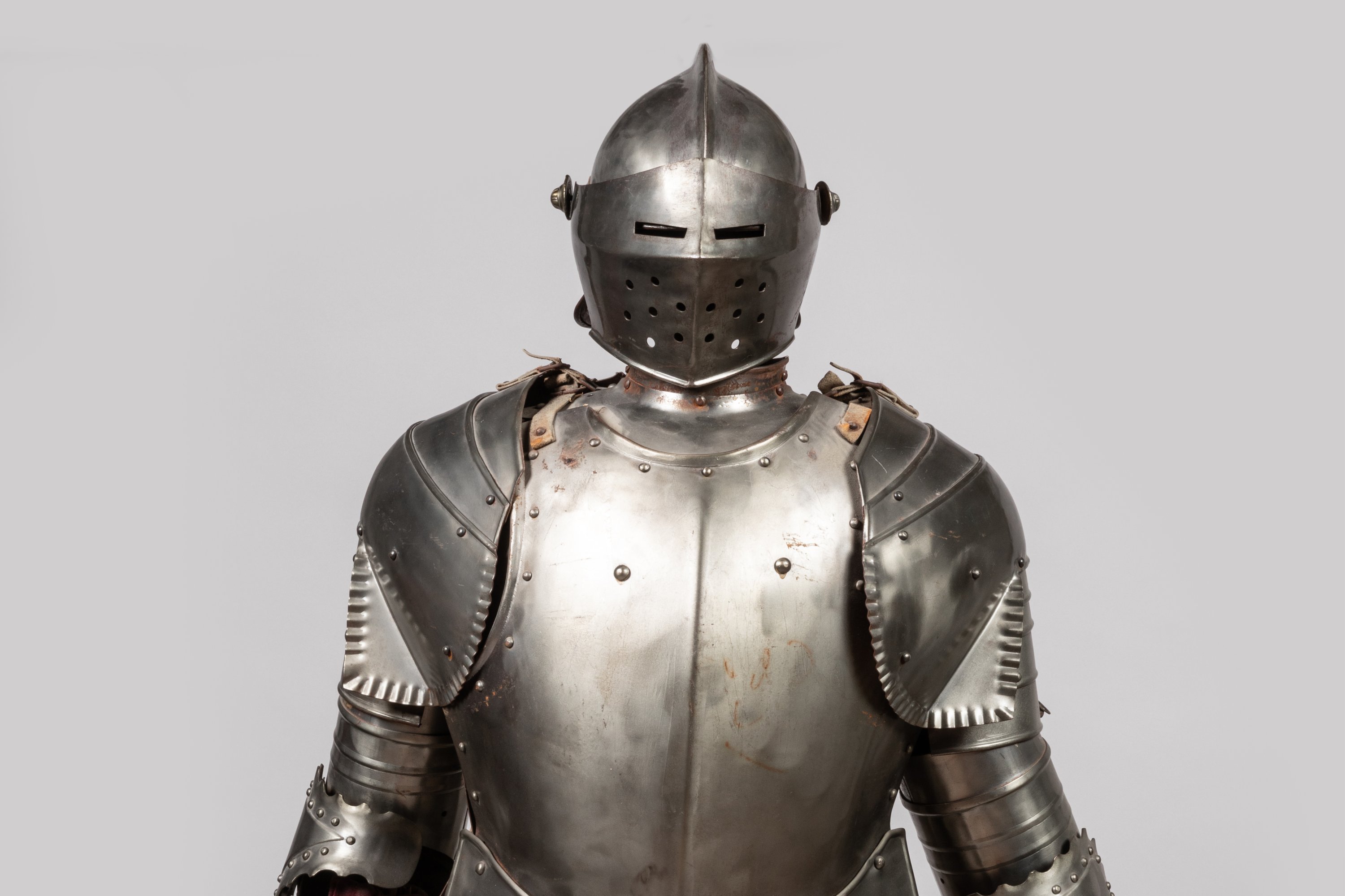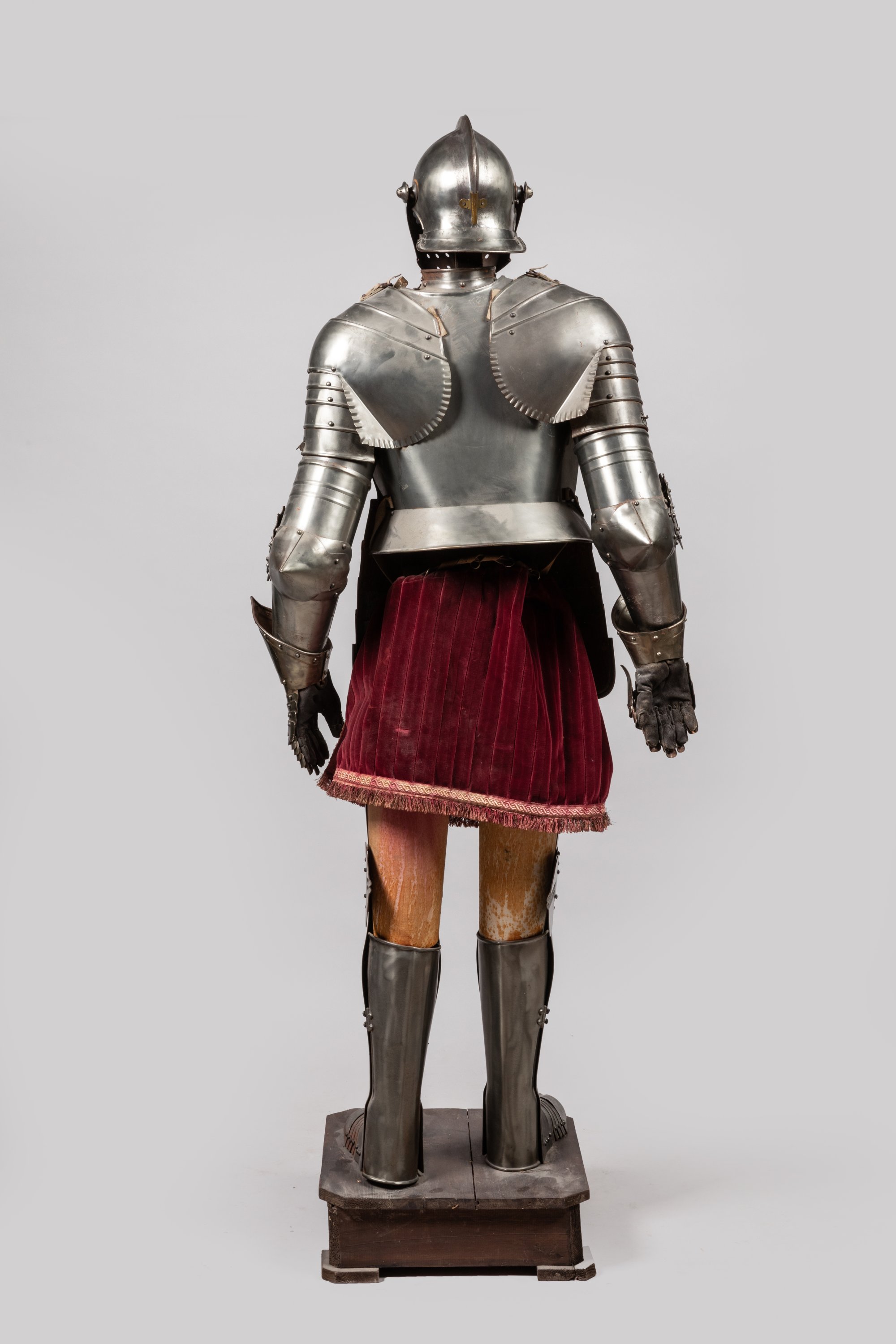 Grande ARMURE de PANOPLIE en fer blanc comprenant un casque, des gants tollés, une armure, une jupe, des pièces pour les pieds de hallebardes et deux piques reposant sur un socle en bois.