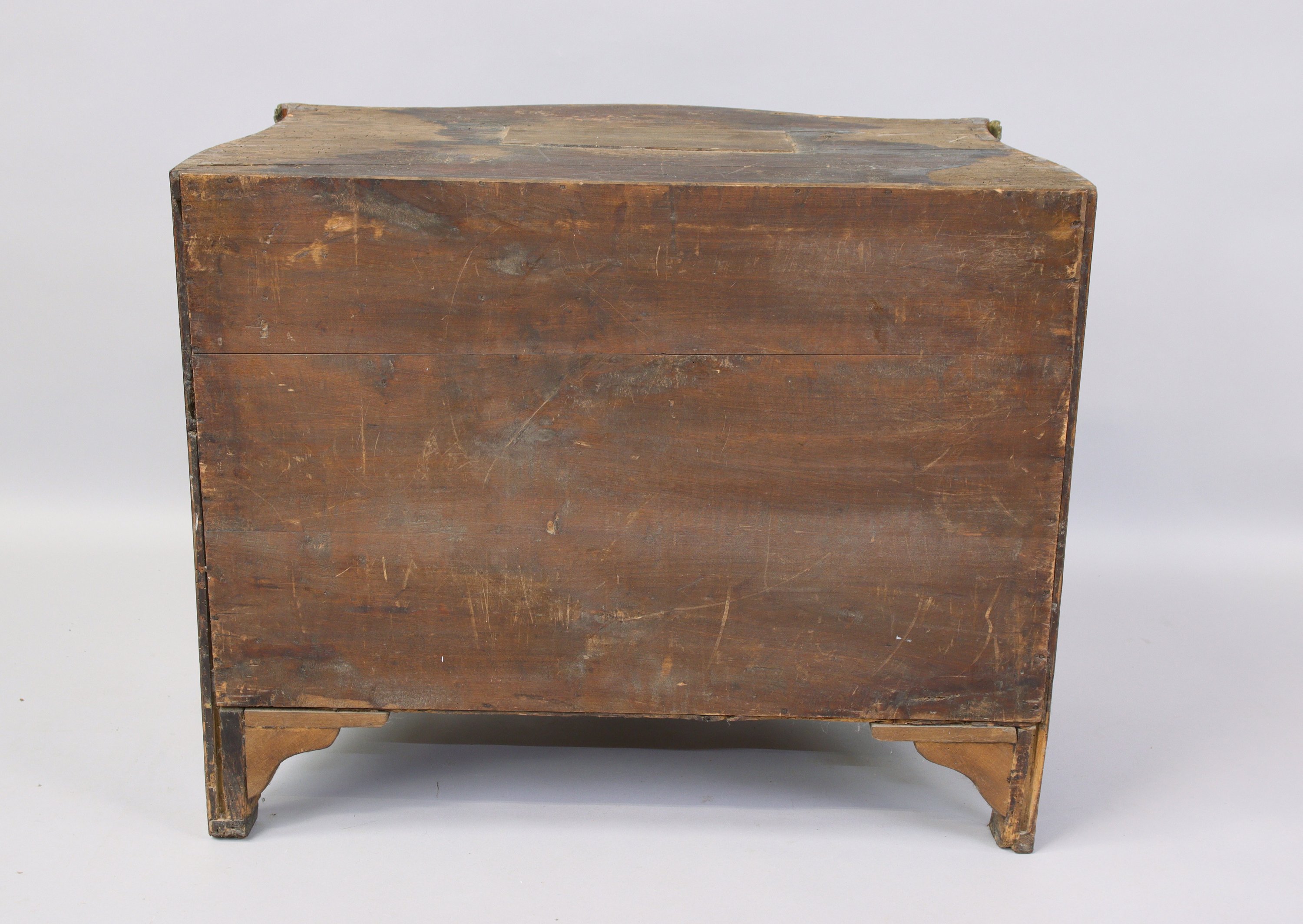 La façade galbée ouvre par quatre tiroirs sur trois rangs. Chacun des tiroirs ornés d'une marqueterie de frisage en X entourée d'un encadrement de bois clair et noirci. Les côtés à décor d'un losange dans un rectangle. Les montants cambrés.