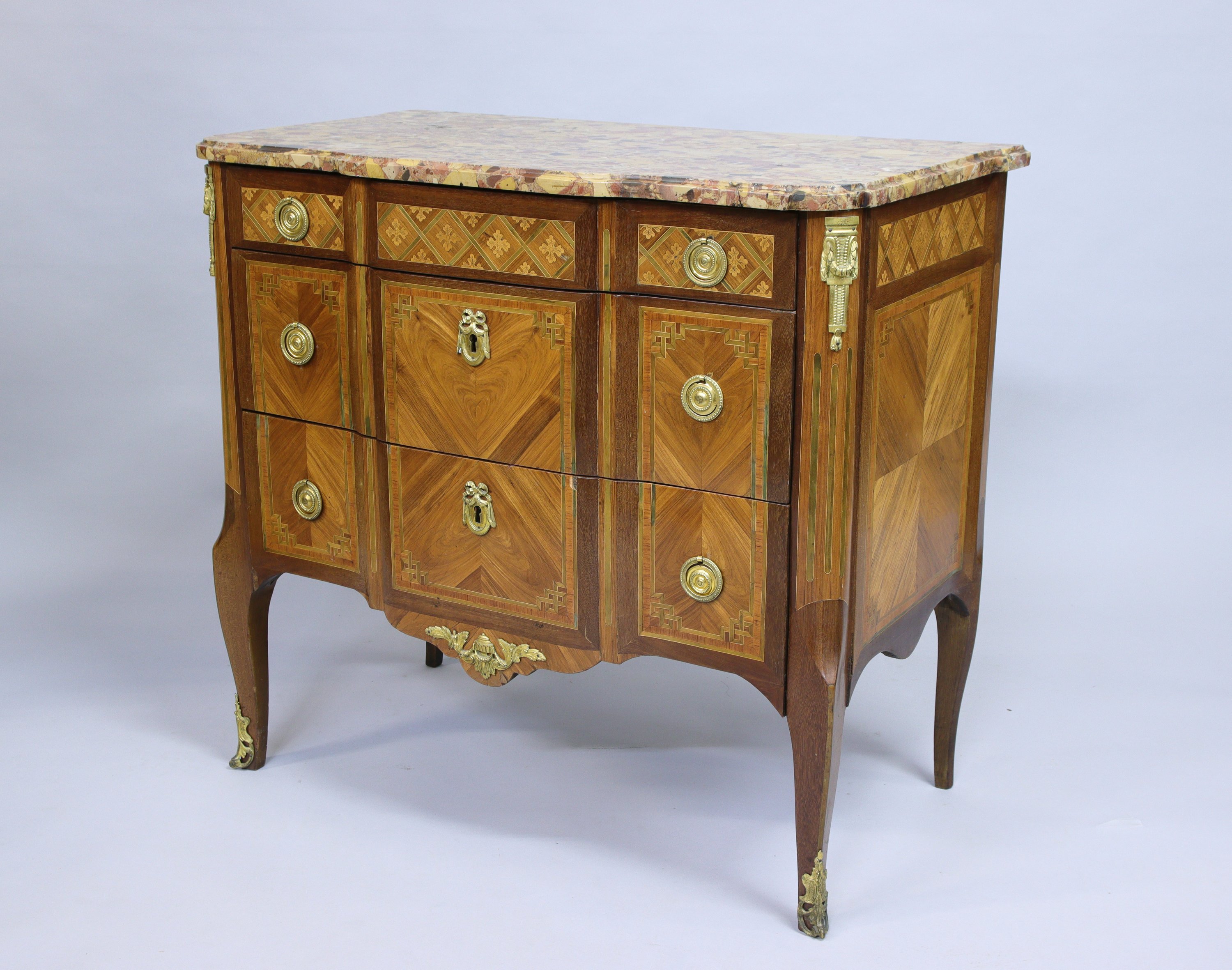 COMMODE TRANSITION à léger ressaut en frisage de bois de rose et marqueterie de citronnier, amarante et bois teintés. Elle ouvre par trois tiroirs sur trois rangs sans traverse et repose sur quatre pieds légèrement cambrés. Marqueterie dite "à la Reine " et rosaces stylisées. Encadrements de filets à la grecque. Garniture de bronzes ciselés et dorés tels qu'entrées de serrure ornées de rubans, chutes d'angle et tablier à décor de cassolette. Sabots feuillagés.