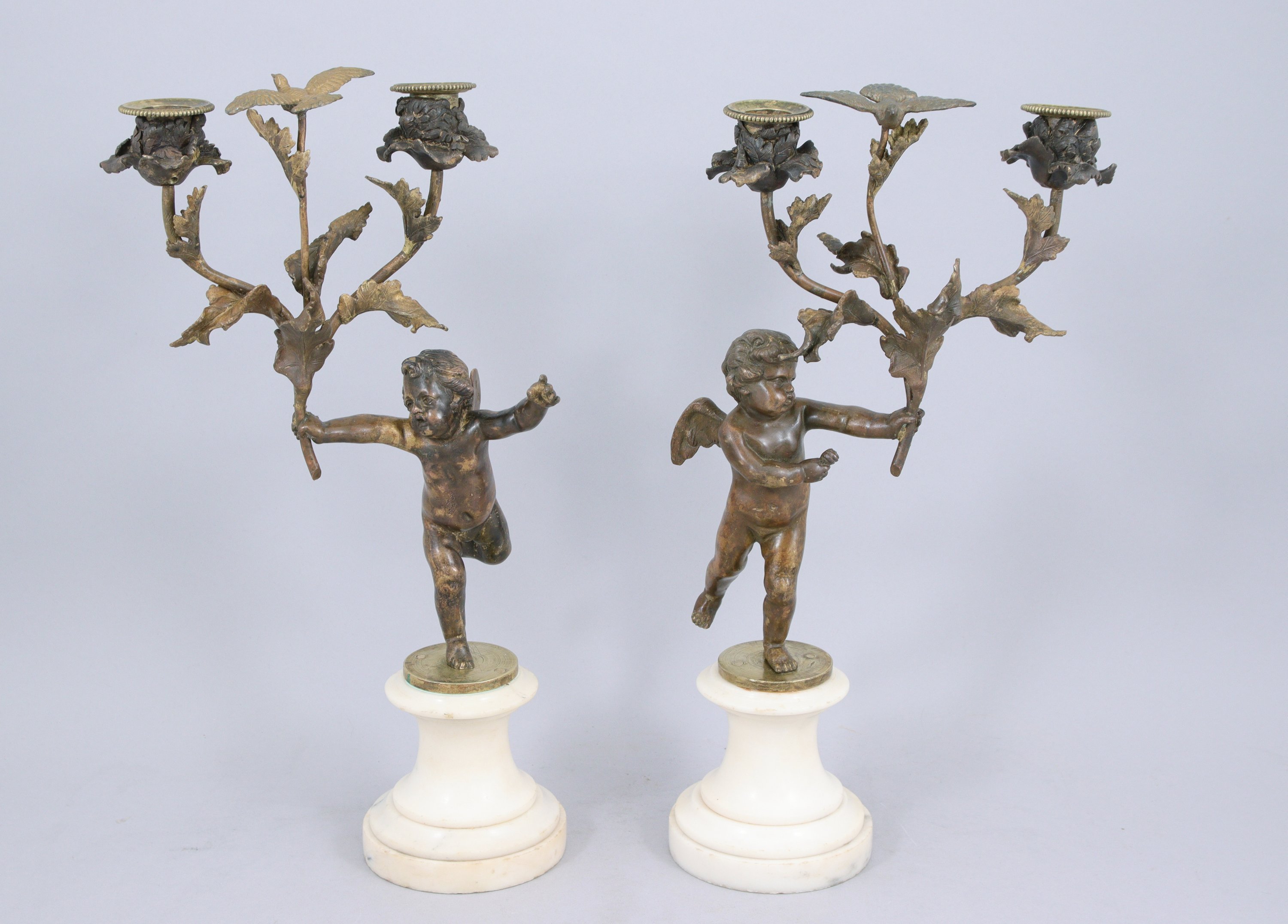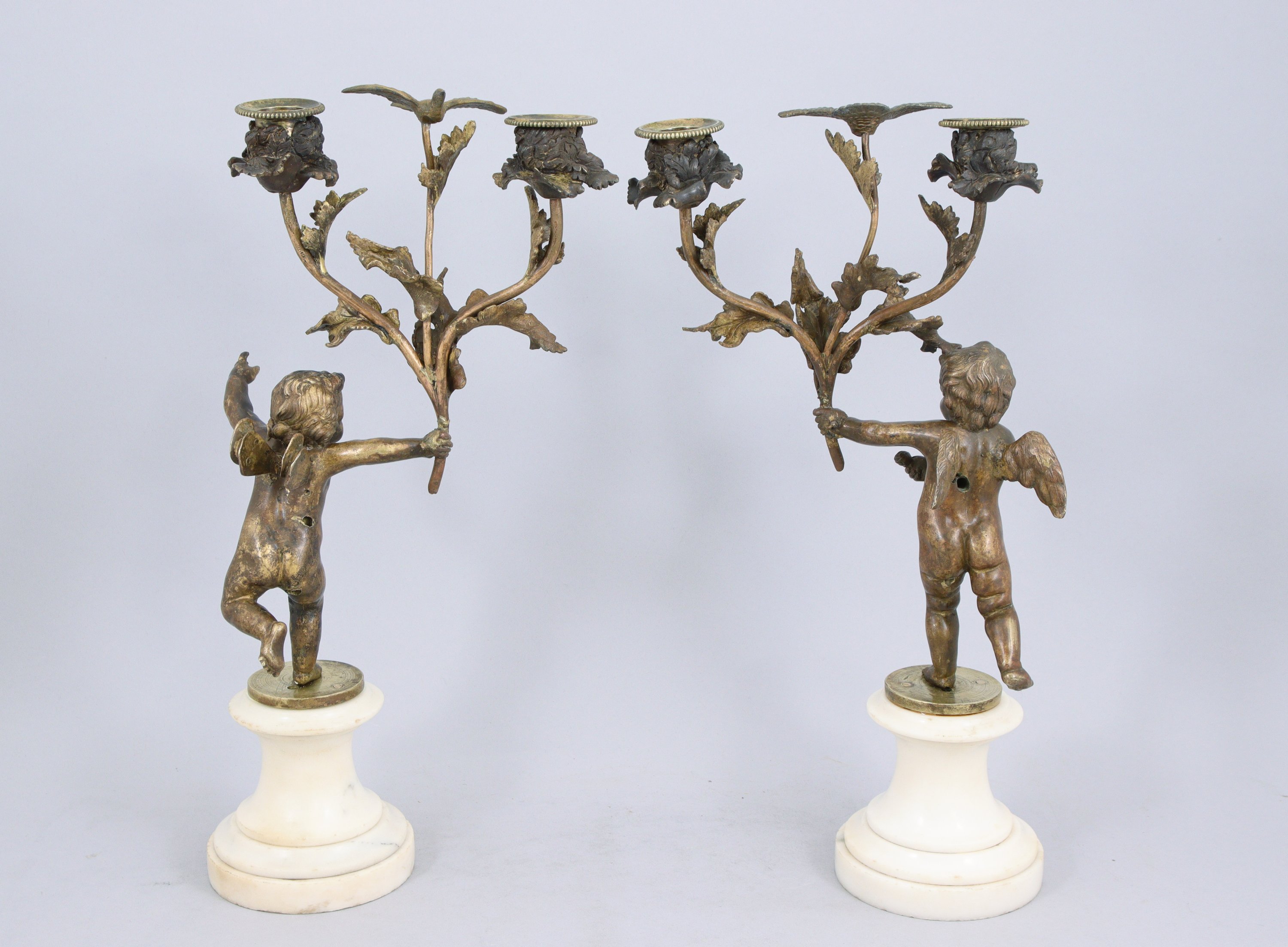 PAIRE DE FLAMBEAUX AUX AMOURS en bronze patiné reposant sur un socle à piédouche en marbre (?). Chaque amour, avec des ailes de papillon ou d'oiseau, porte deux lumières et une colombe réunis sur une branche .