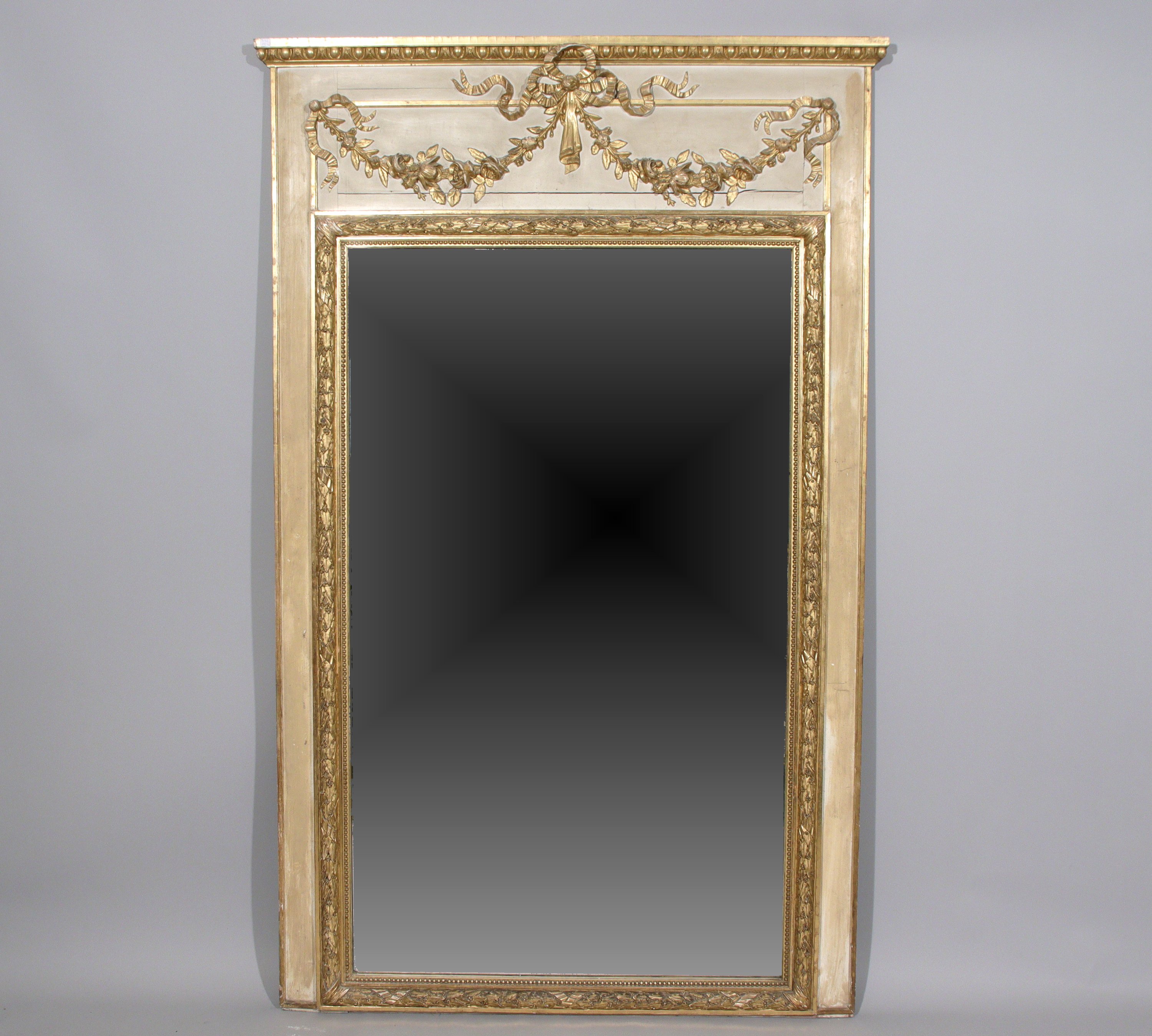 TRUMEAU en bois laqué, doré, mouluré et sculpté de frises de fleurs, rubans et perles. Le miroir encadré dune frise de perles et feuilles de lauriers enrubannée. Il est surmonté dun cartouche à la frise végétale flanquée dun médaillon orné dun nud. La partie haute façon corniche à frise doves.