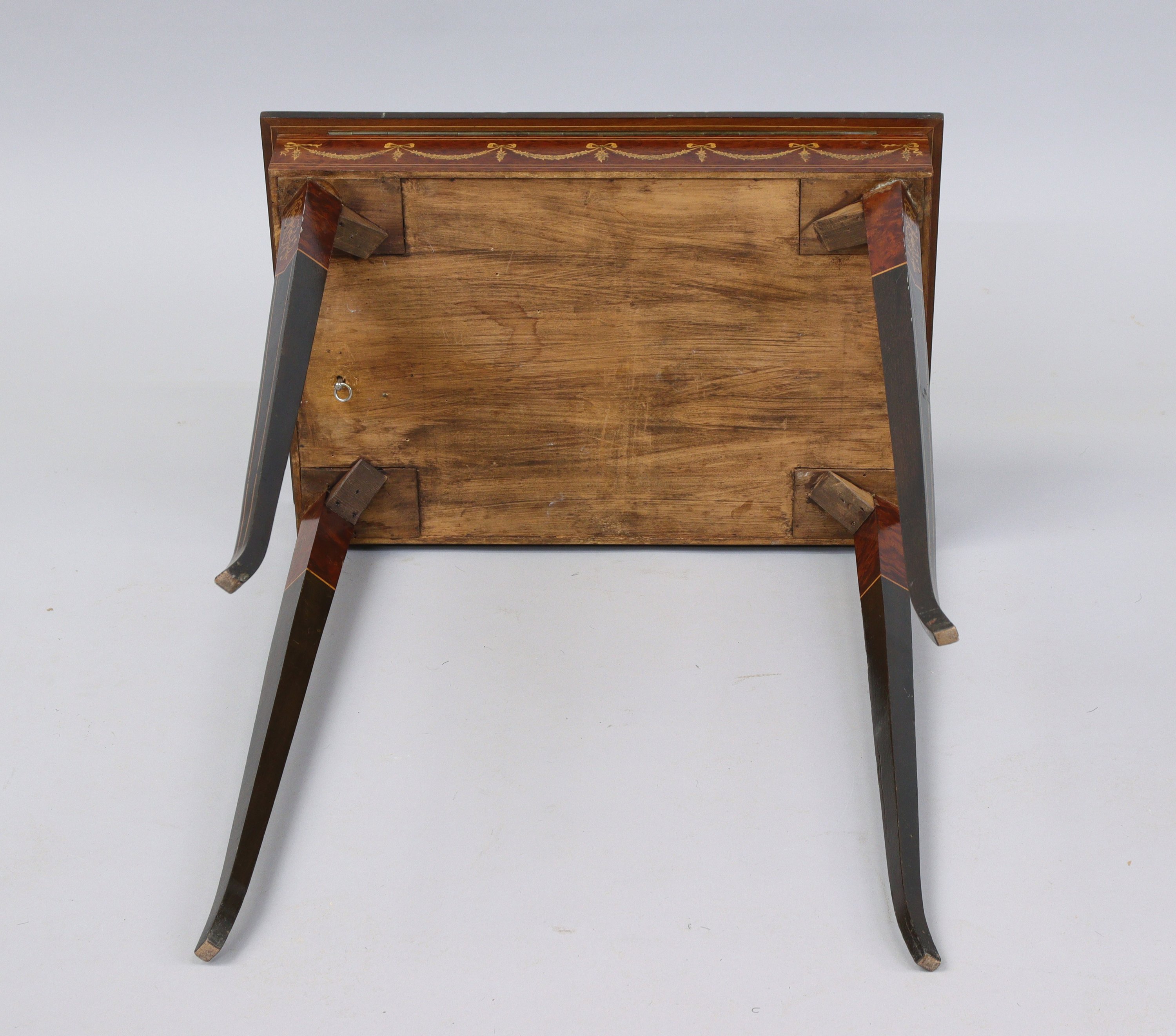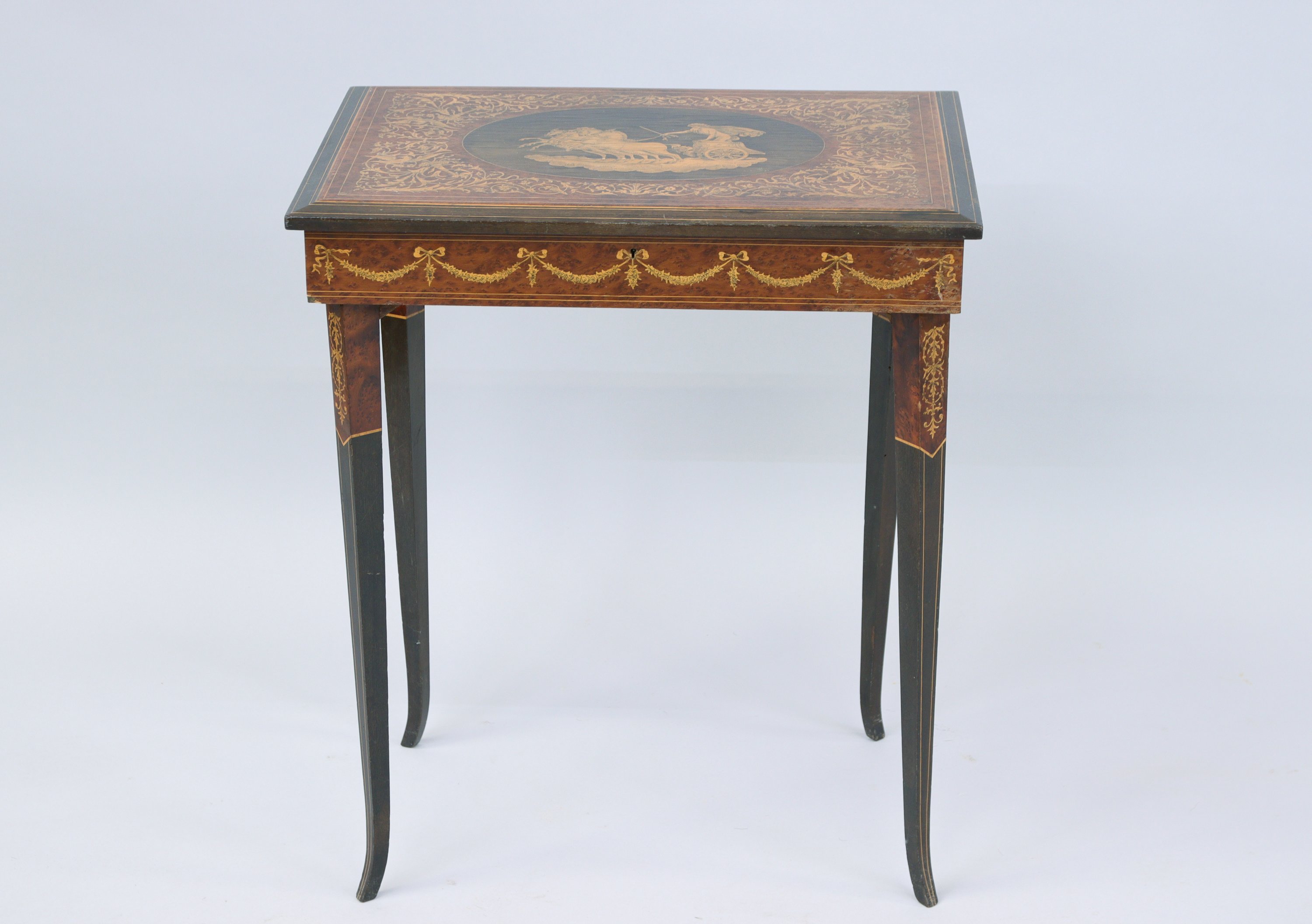 le plateau orné au centre d'un médaillon présentant le char d'Apollon entouré de riches rinceaux. Il découvre trois compartiments garnis de tissu capitonné. Sous l'un deux est hébergé un mécanisme de boîte à musique. Il se remonte par une clé se trouvant sous le plateau. La ceinture est décorée de guirlandes de nuds et végétaux. La table repose sur quatre pieds dont les extrémités sont cambrées.