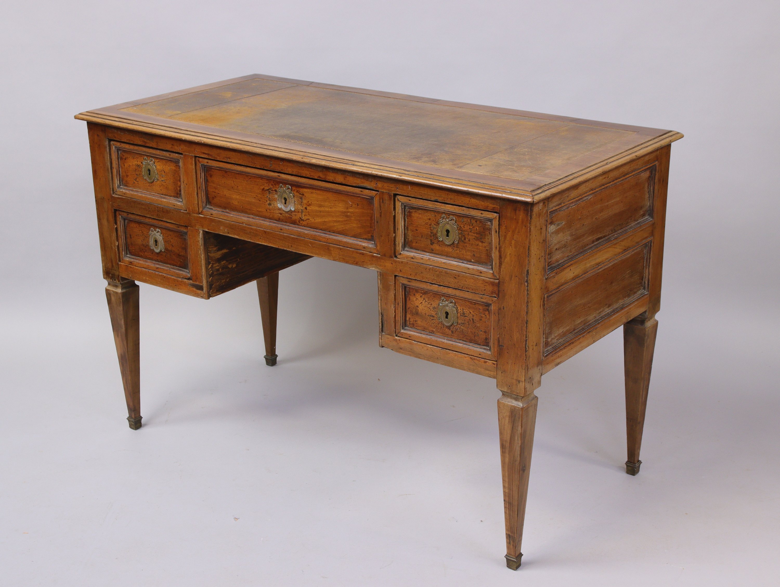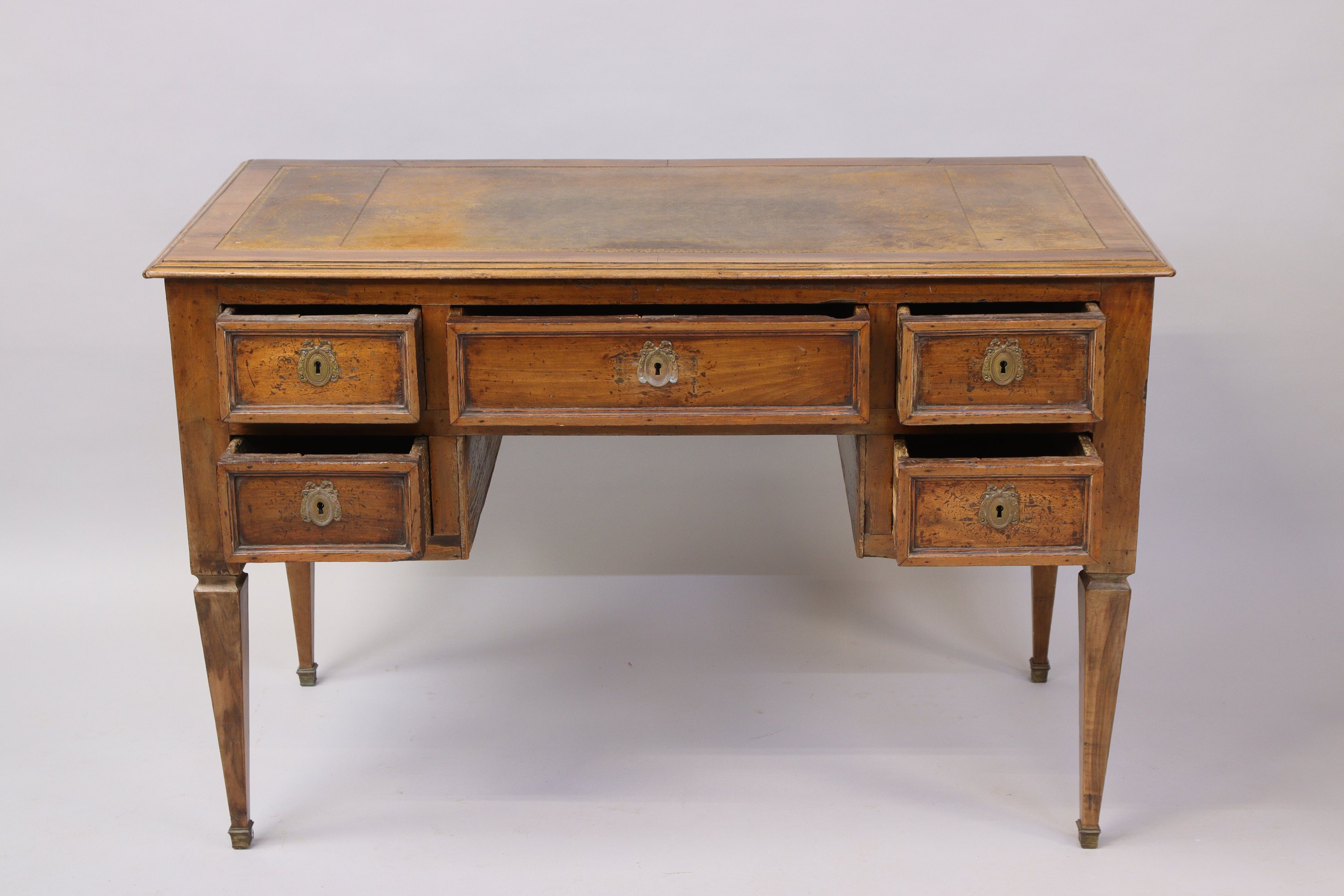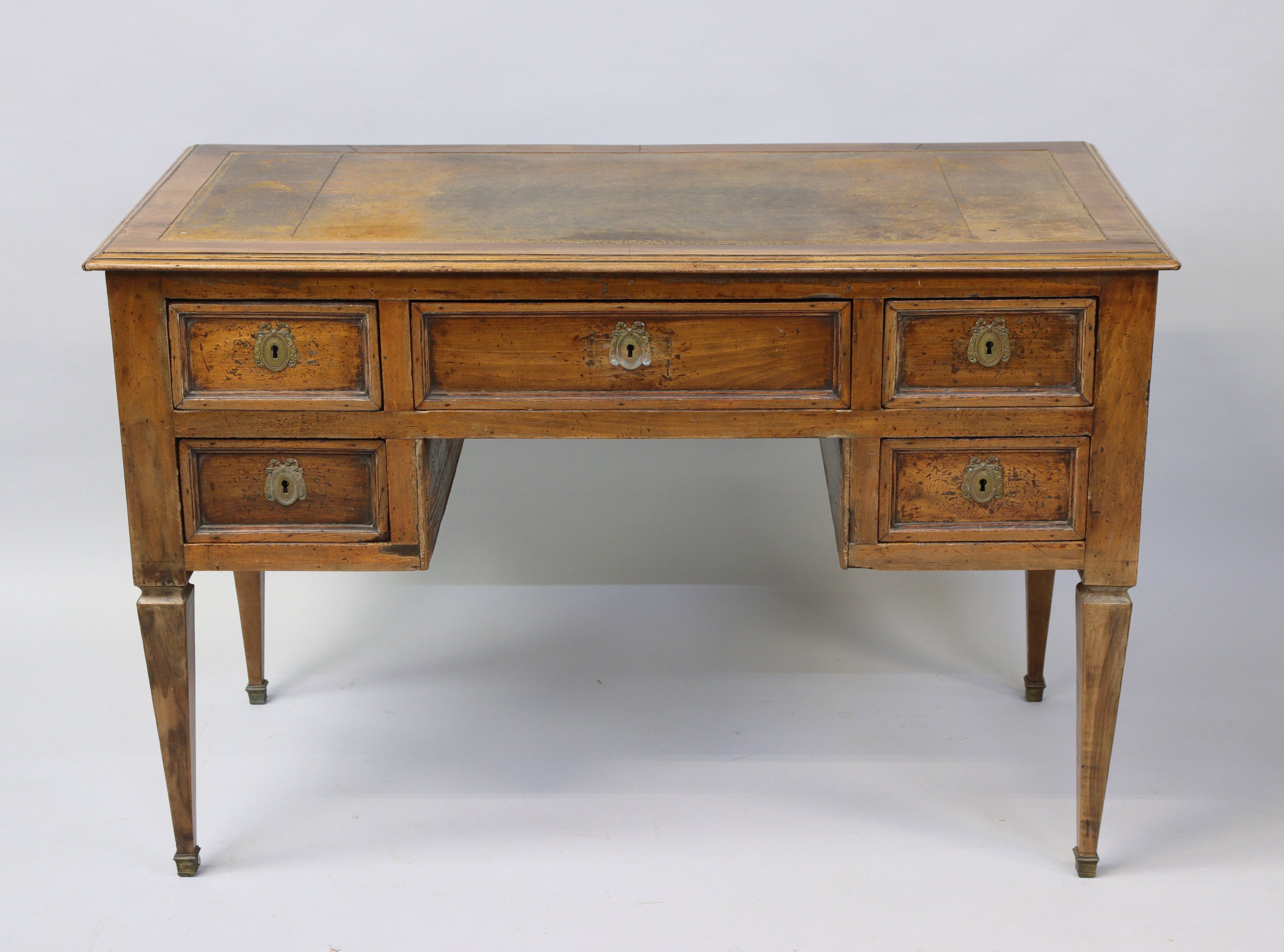 BUREAU PLAT À CAISSONS TOUTES FACES en bois fruitier. Il ouvre tiré en double caisson et avec un tiroir central. Les entrées de serrure sont en laiton ornées de nuds et de rubans. Le piétement est en gaine terminée par des sabots. Le plateau est foncé d'un maroquin.