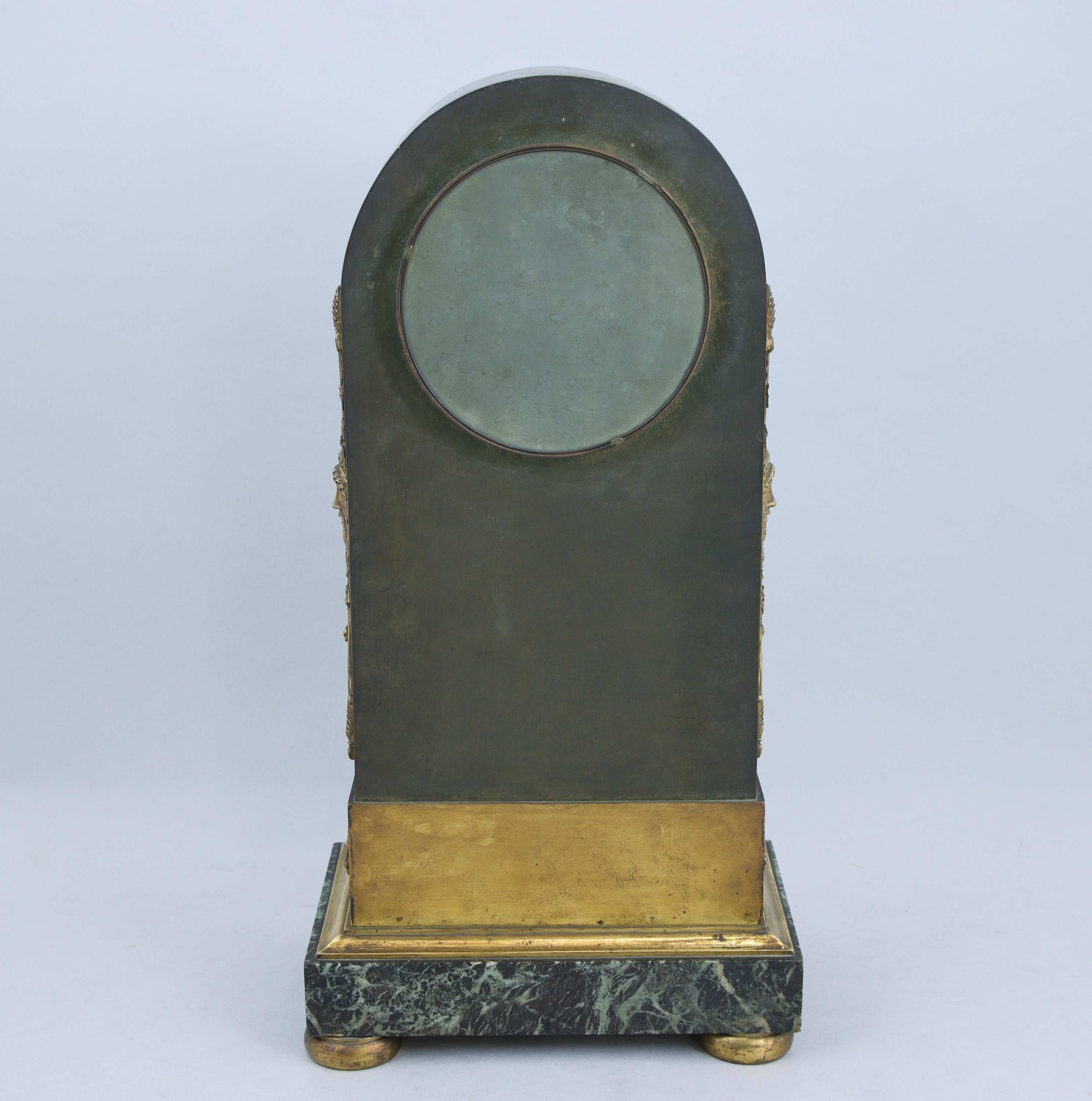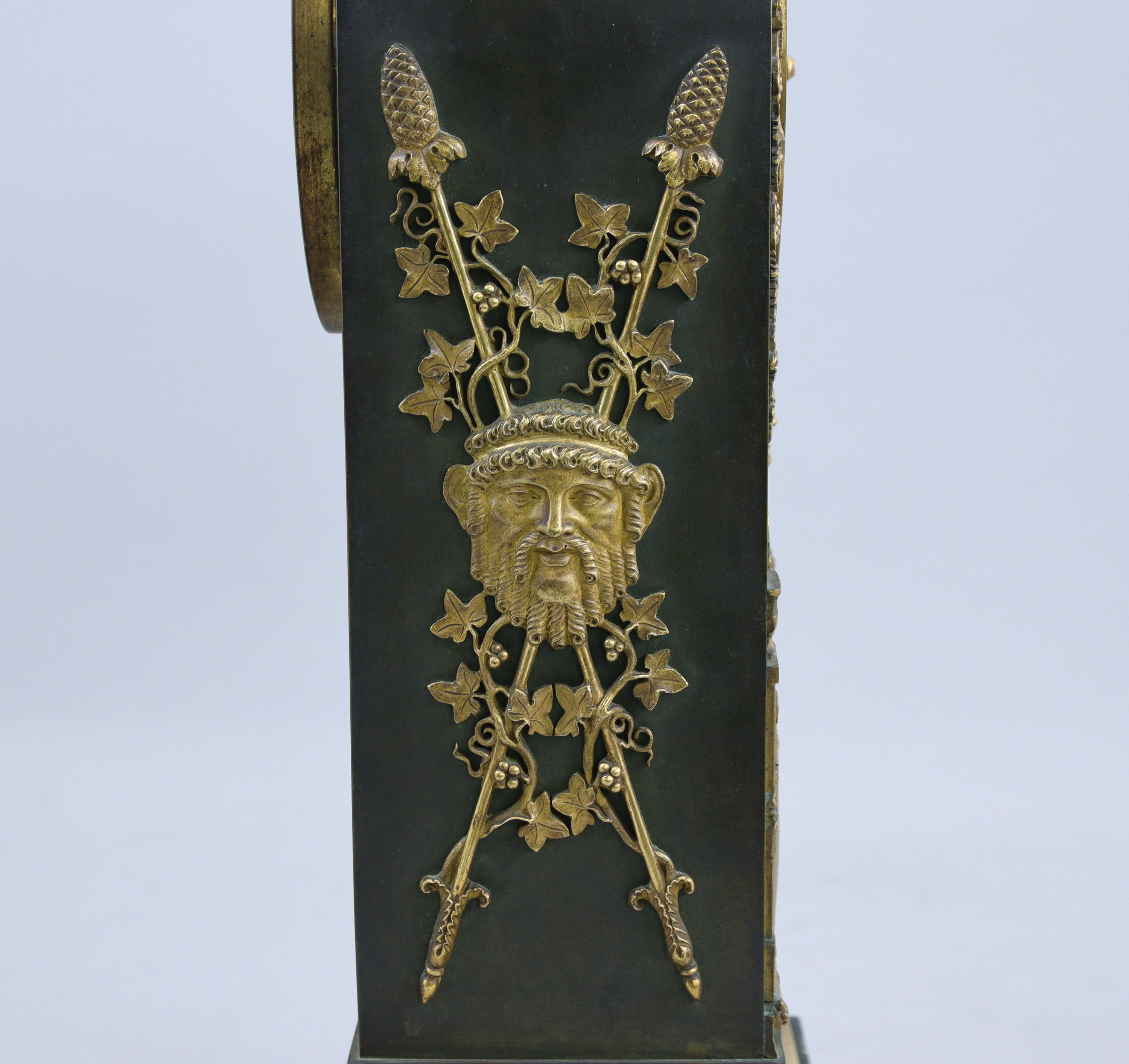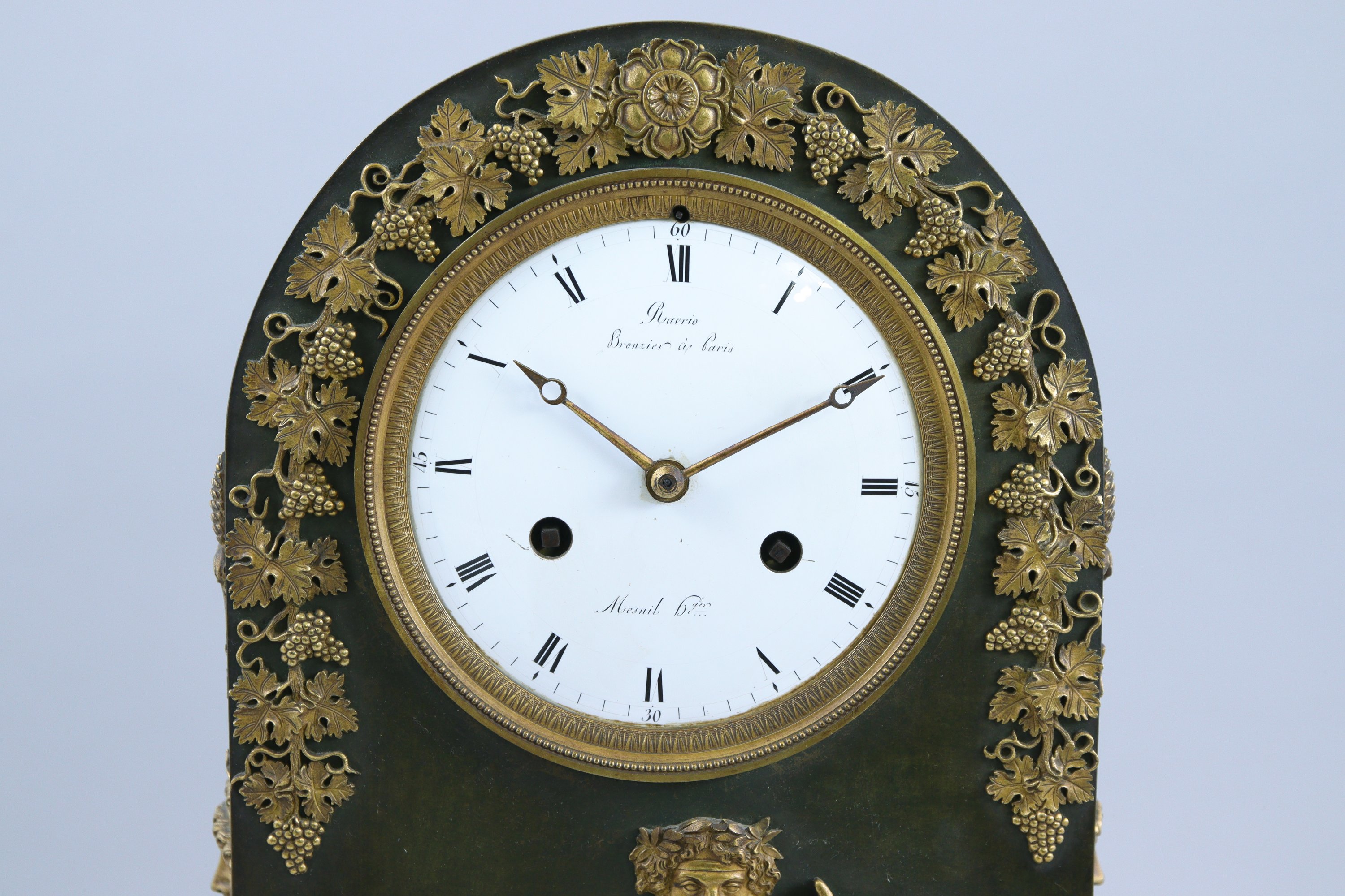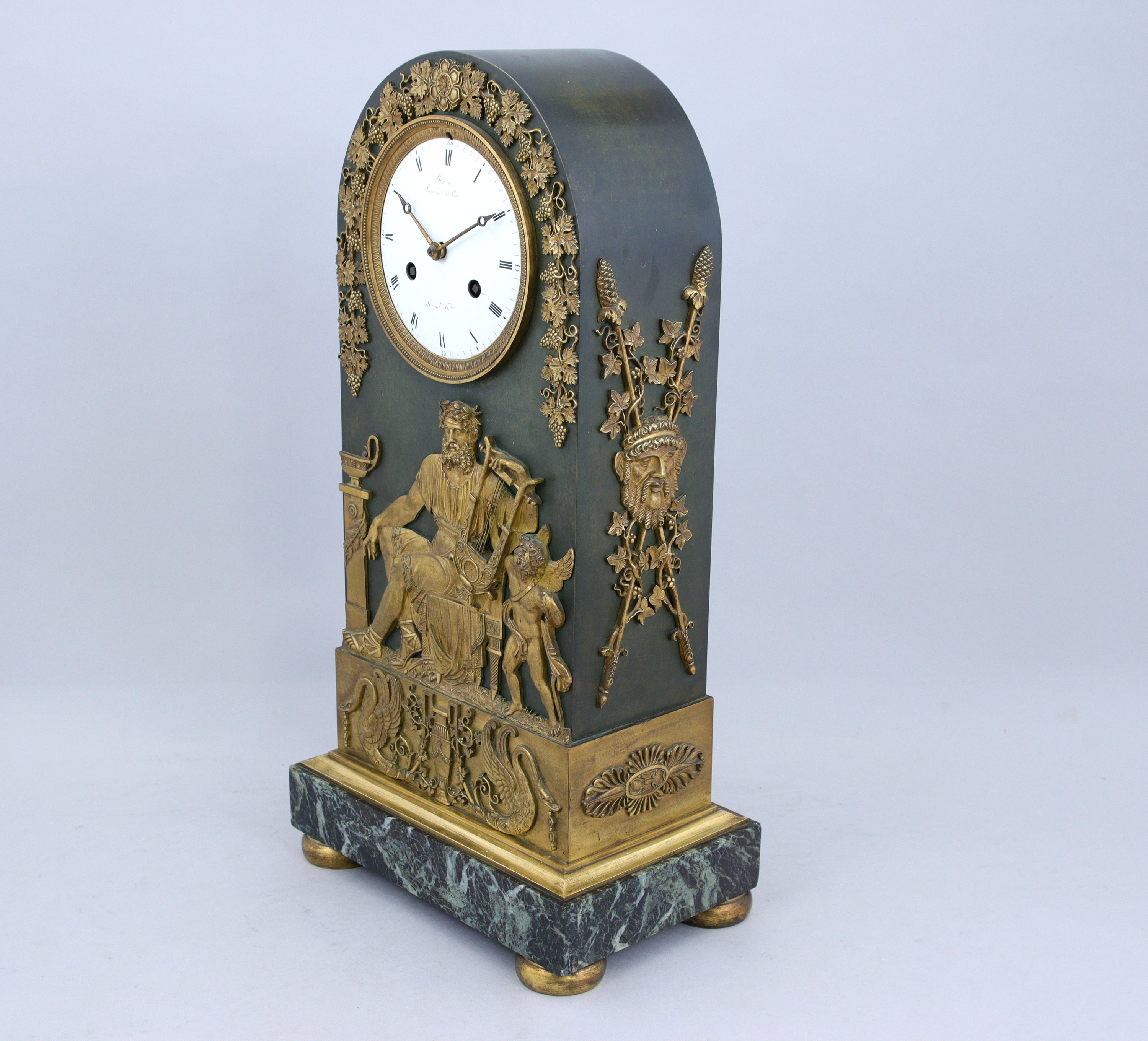 Rare pendule borne en bronze mat et doré sur une plinthe de marbre vert et quatre pieds en boule aplatie figurant le poète de cour Grec du VIe siècle av. J.C. assis à la lyre et l'Amour, qui se tient debout à son côté, une vase sur une gaine de l'autre côté. Frises de pampres autour du cadran, masques et attributs bachiques sur les côtés, deux cygnes dos à dos en partie basse. Le cadran de forme circulaire avec chemin de fer et les heures en chiffres romains, signé "Ravrio bronzier à Paris" et "Mesnil Hger".