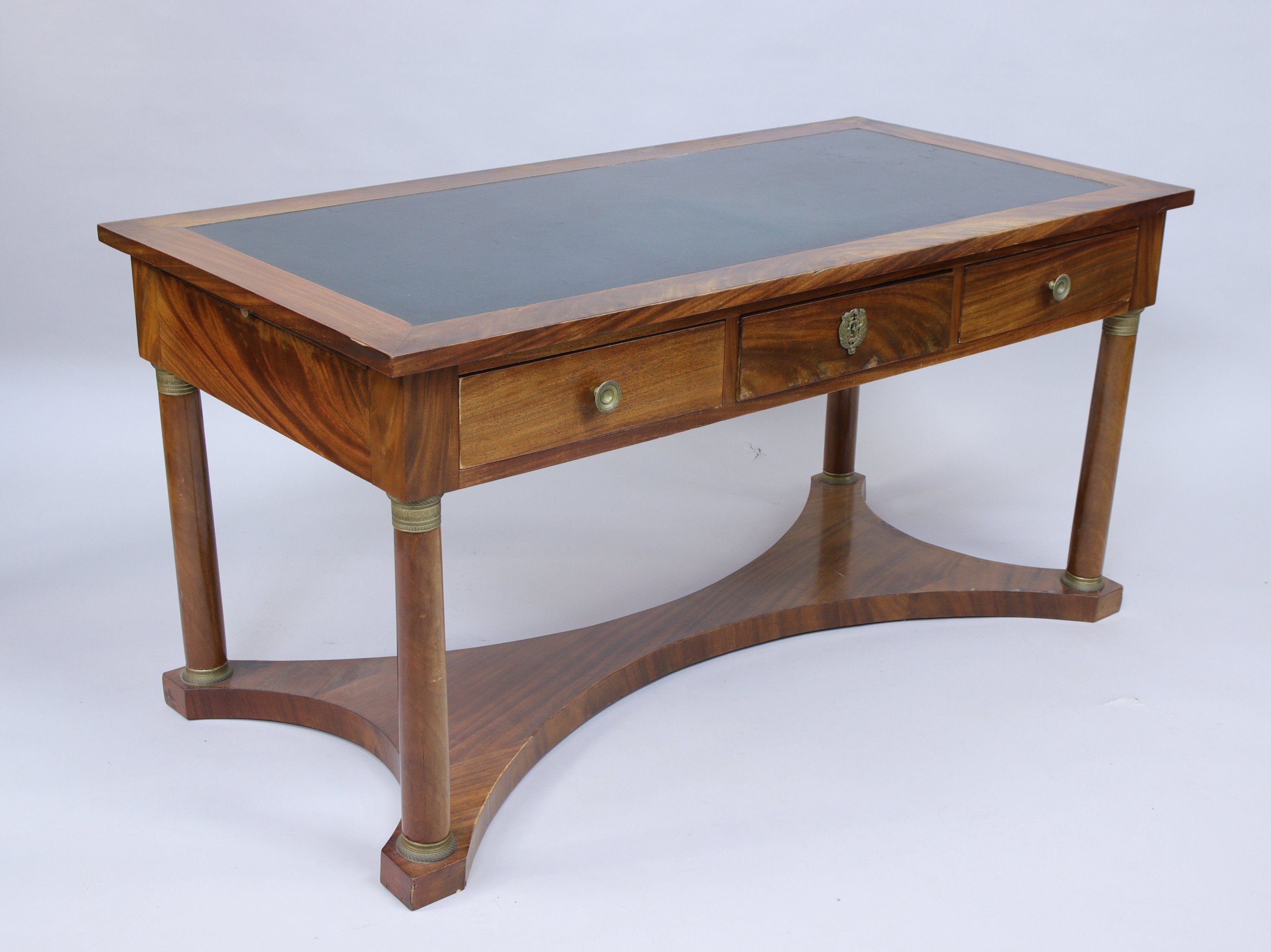 ouvrant par trois tiroirs en ceinture et deux tablettes latérales. Le meuble repose par quatre pieds colonnes et se termine par une plinthe en X. Ornementation en laiton doré comme entrées de serrure et chapiteaux des colonnes.