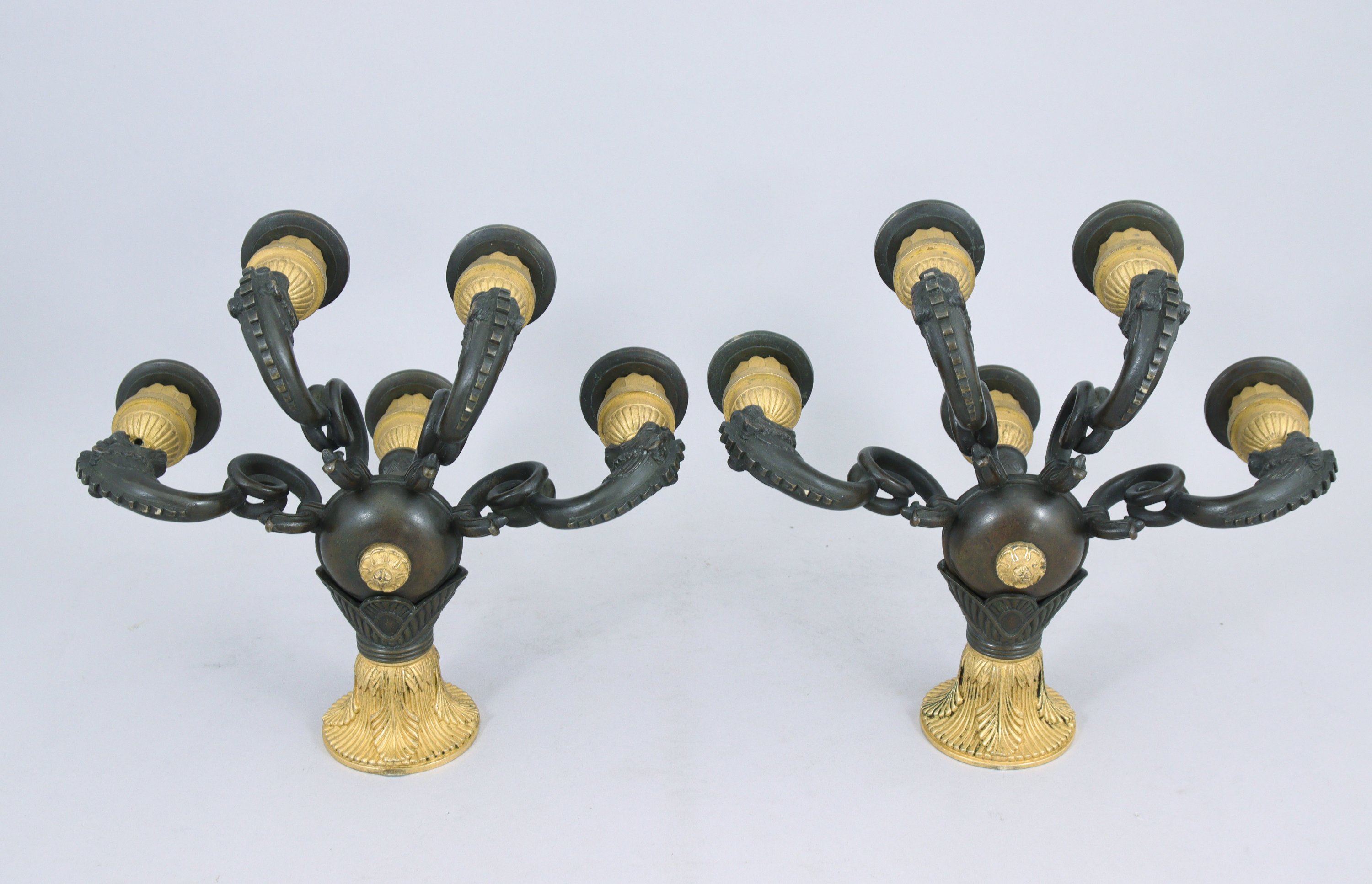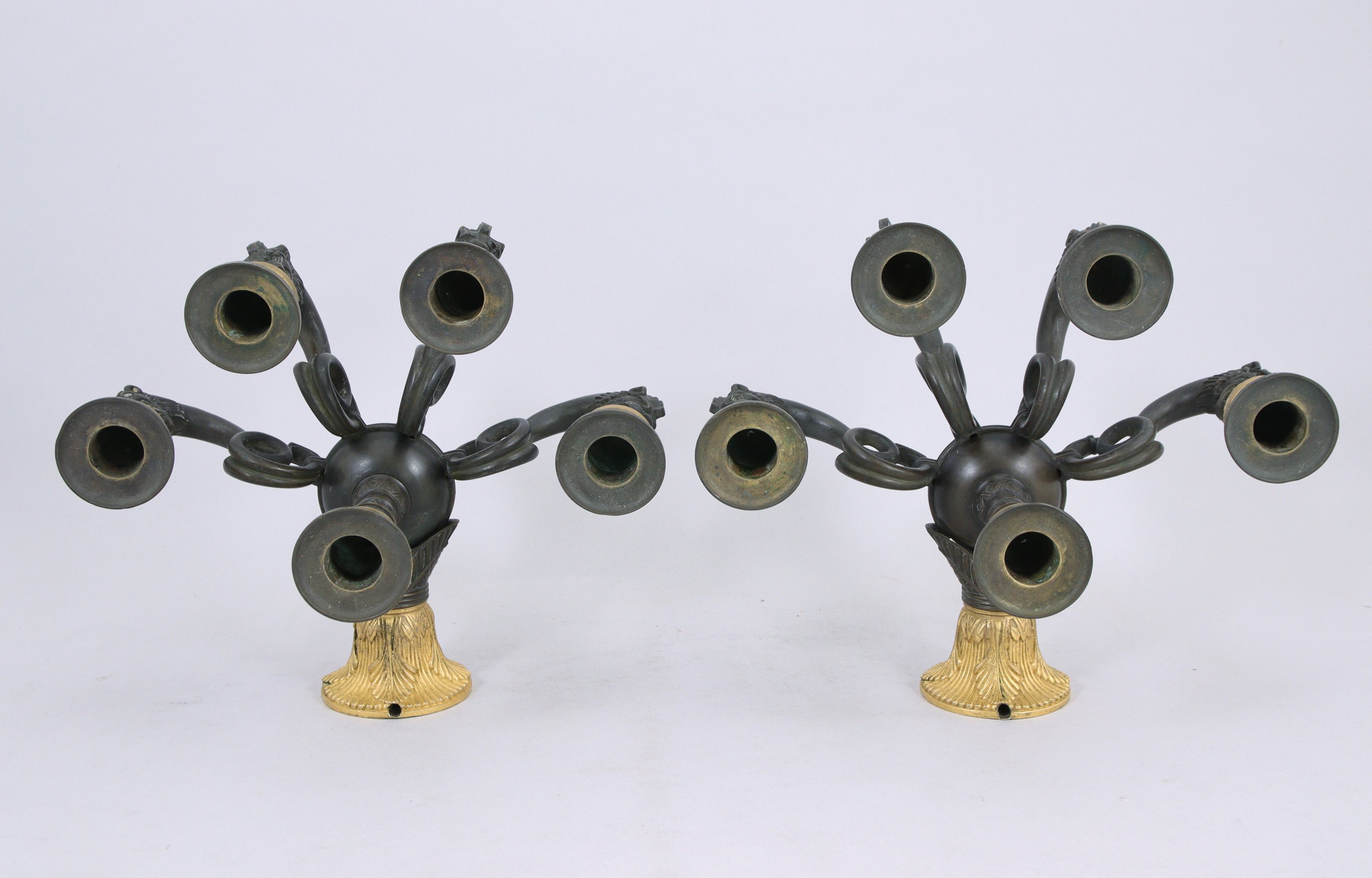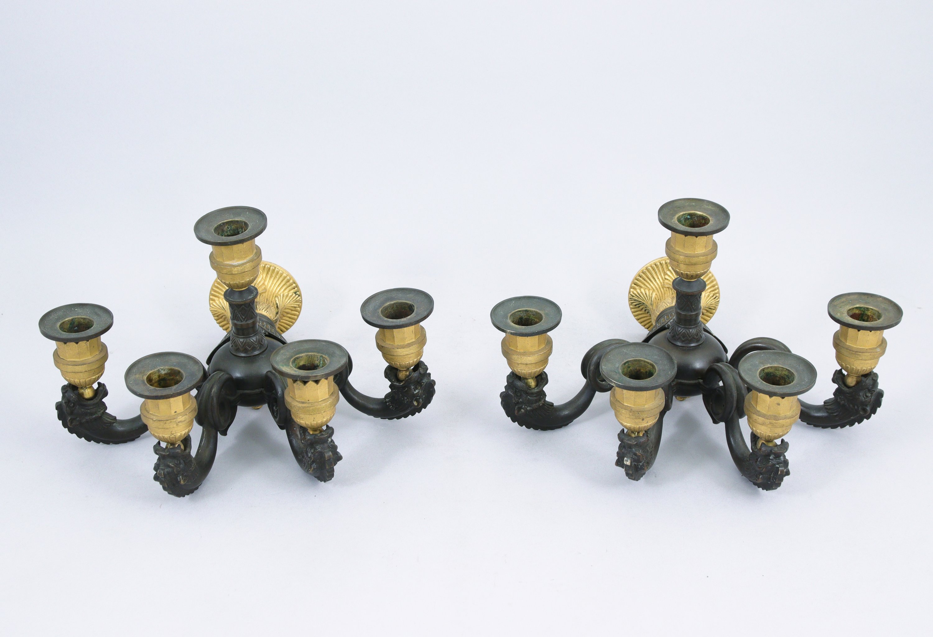 PAIRE D'APPLIQUES À CINQ BRAS DE LUMIÈRES en bronze patiné et doré à motifs de palmes, enroulements, frises et gueules de lion.