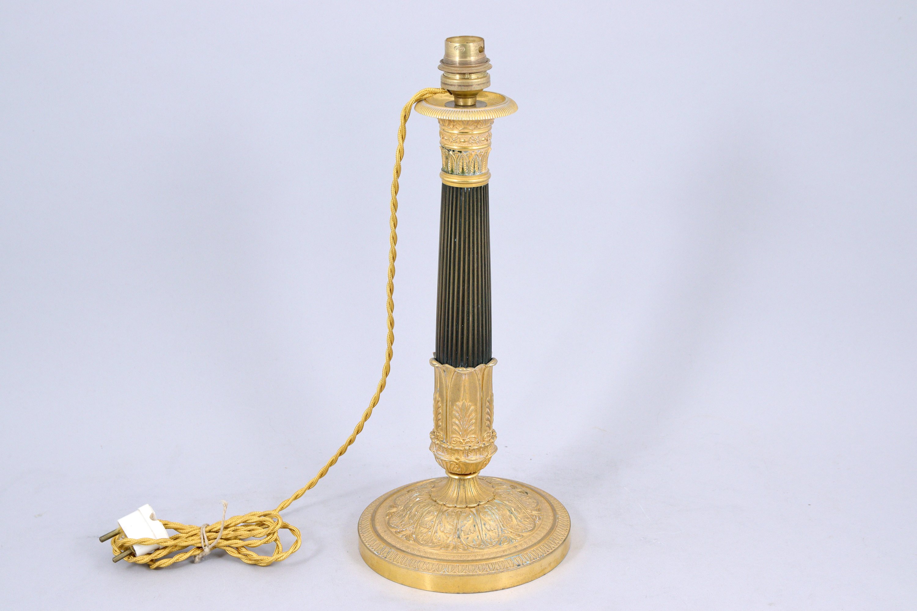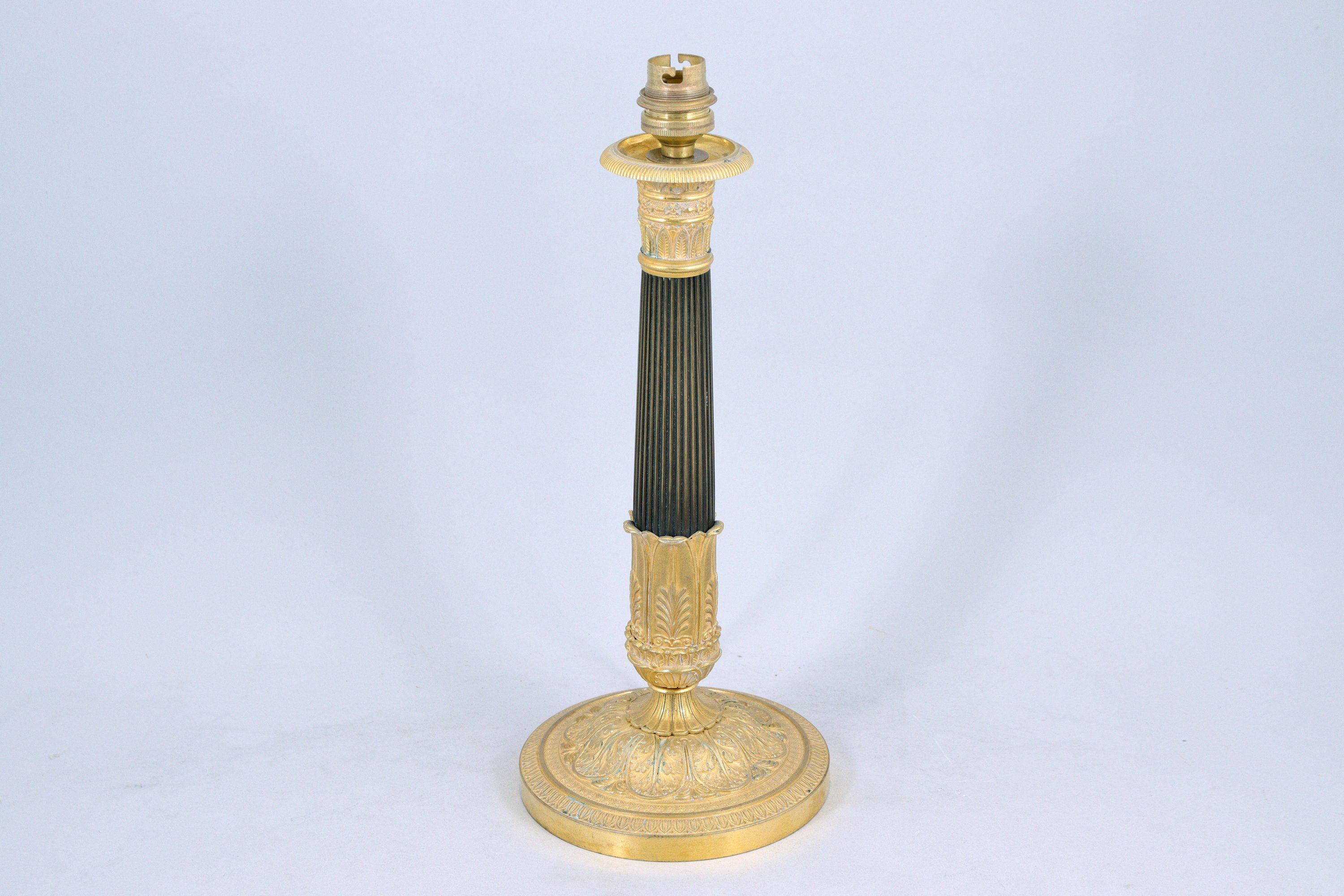 JOINT : Beau BOUGEOIR en métal et bronze patiné et doré à motif d'une colonne cannelée à chapiteau corinthien reposant sur des feuilles de lotus, de style Empire. Haut. 30 cm. (électrifié)